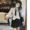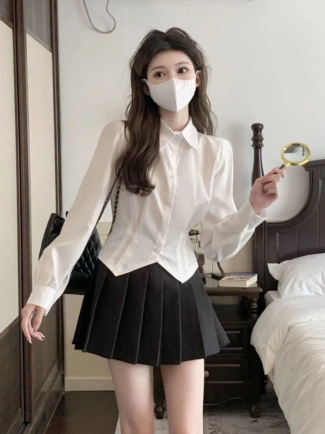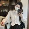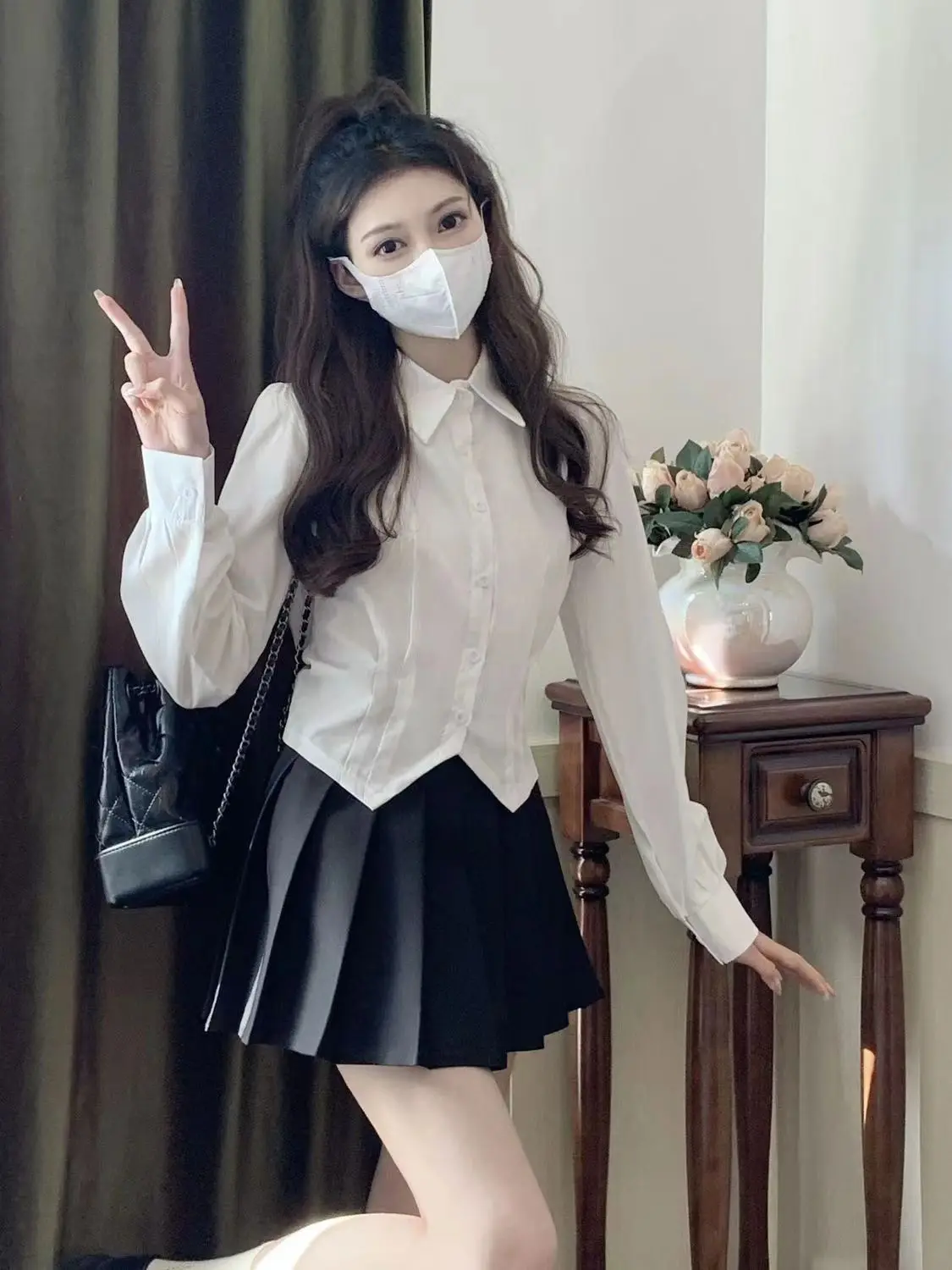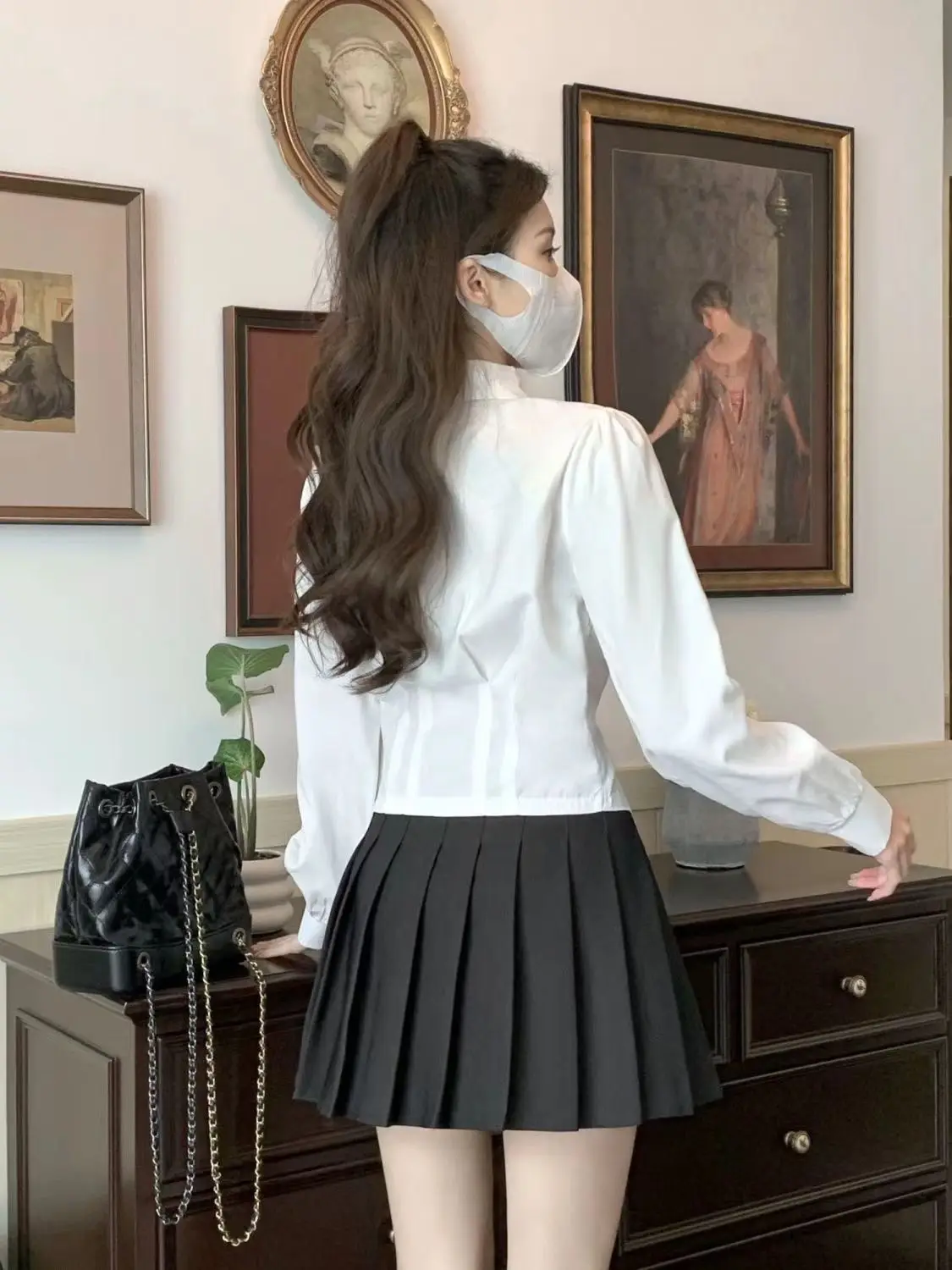 2000s White Long sleeve Vintage Shirt Women Slim Tunic Button up Basic Blouse School Polo Neck Crop Top Female