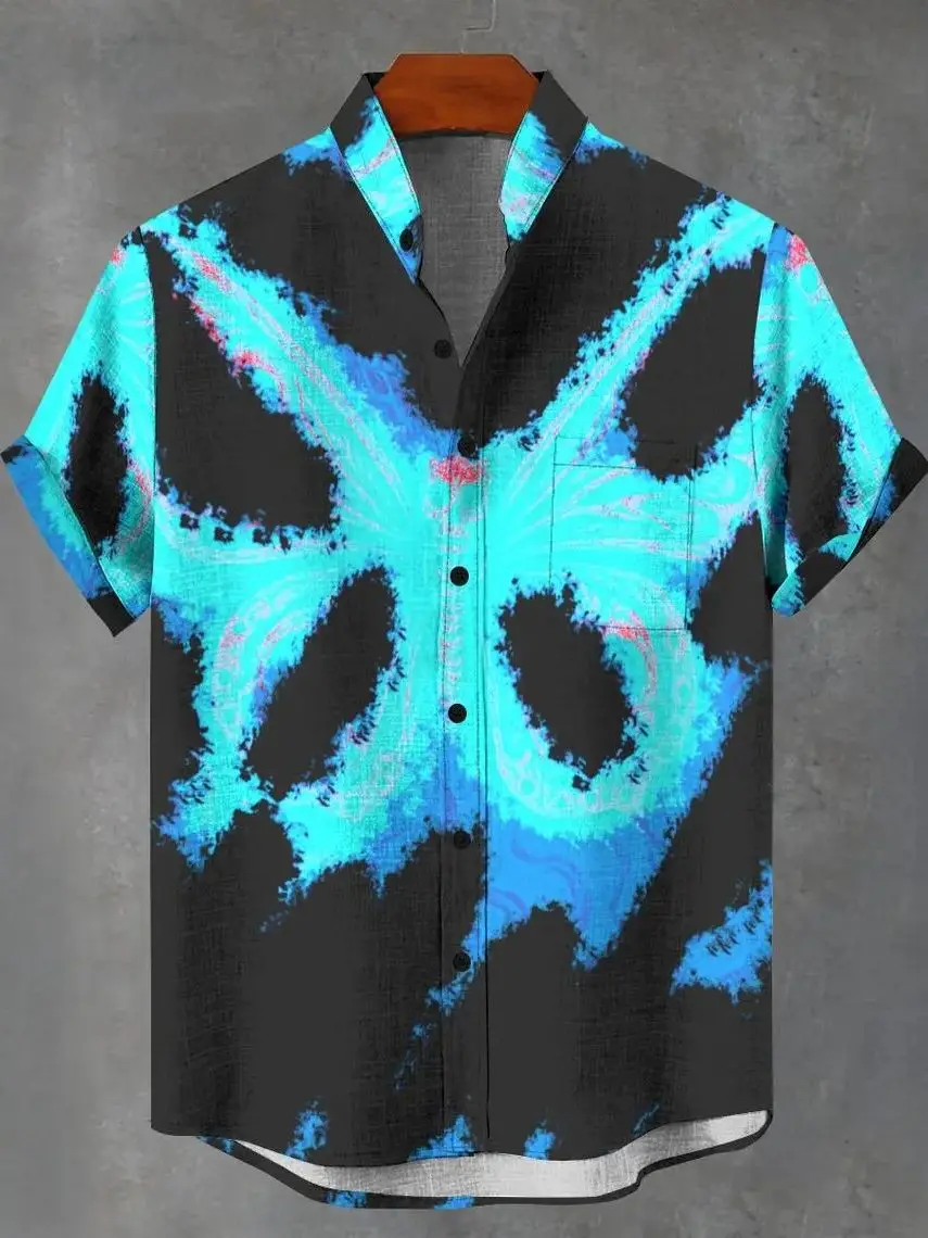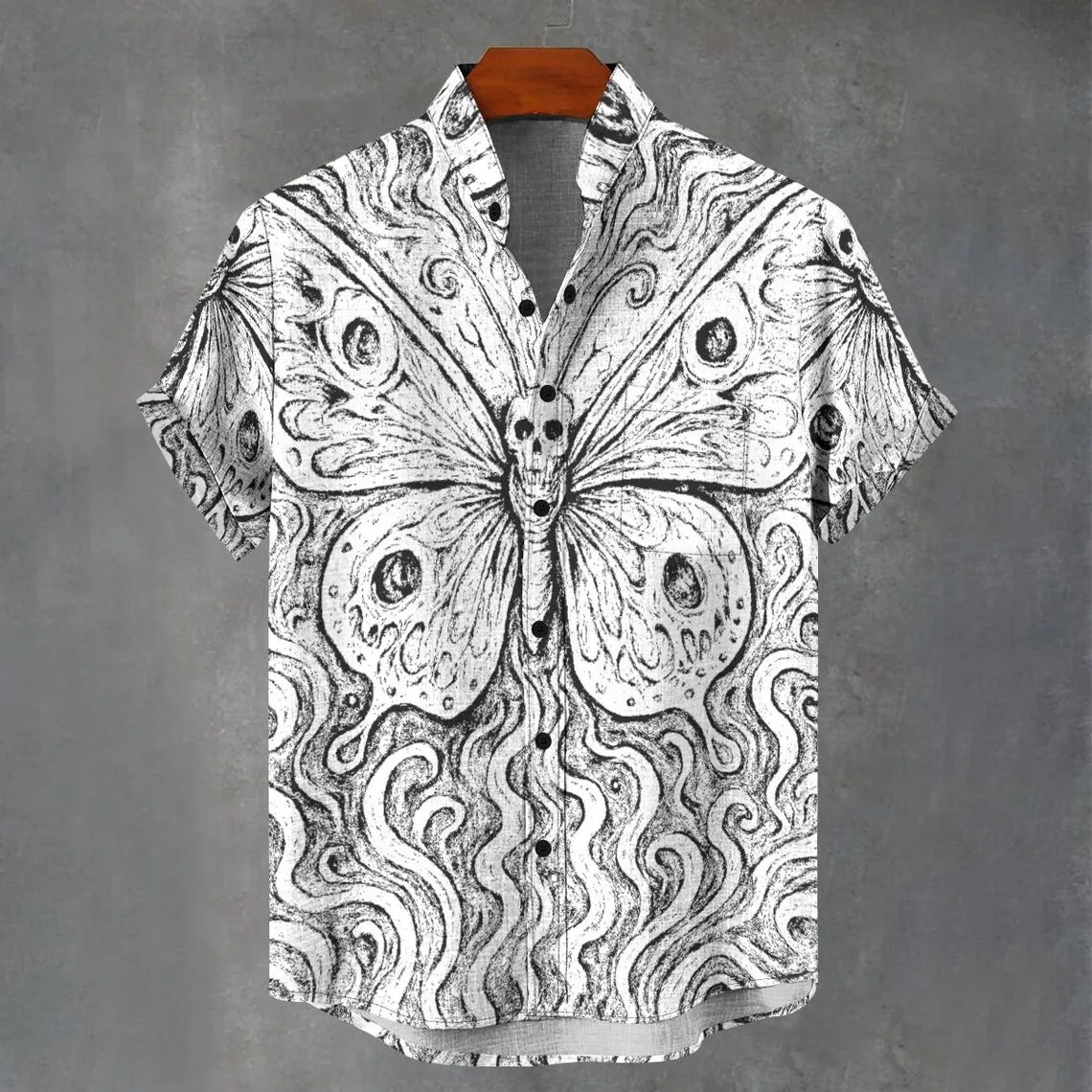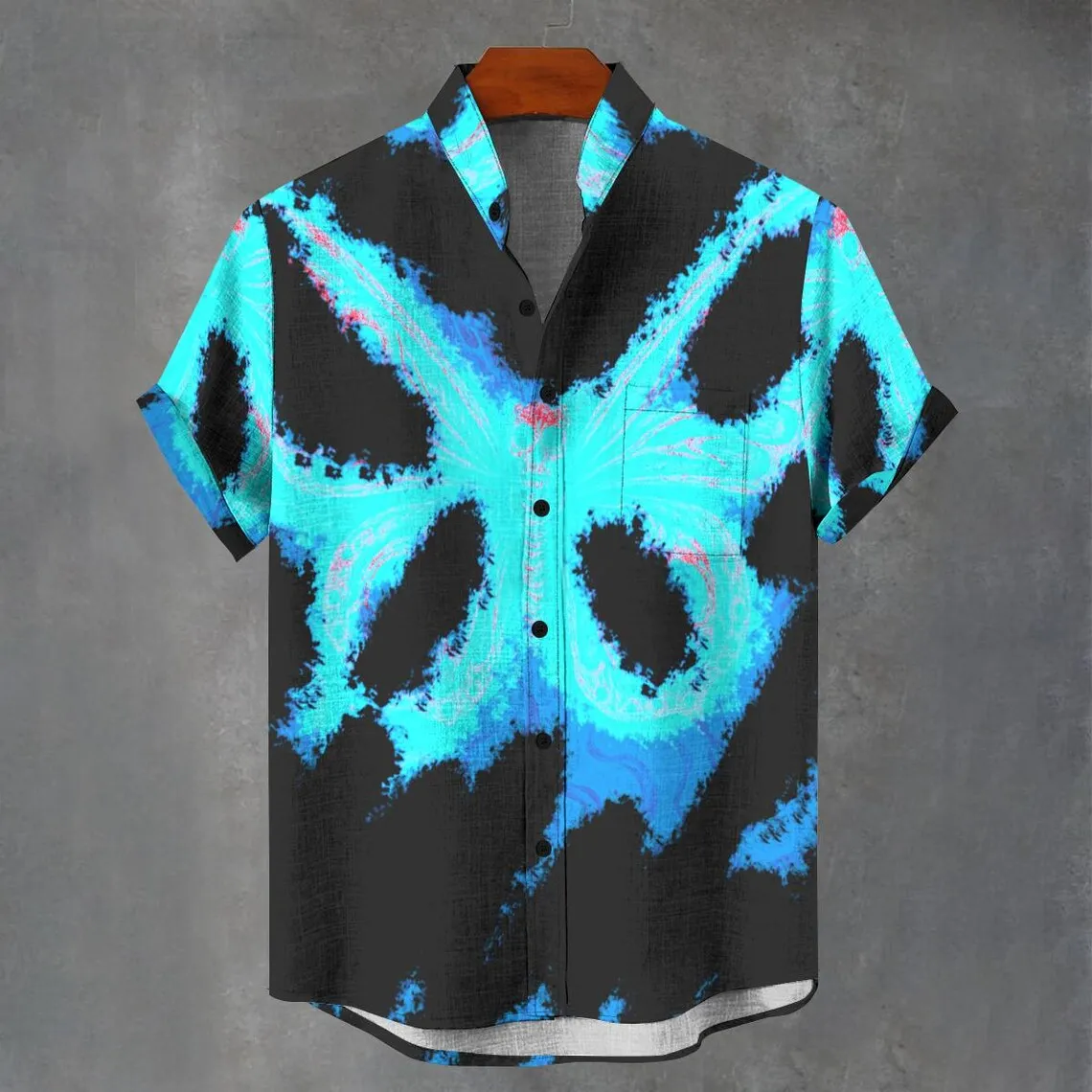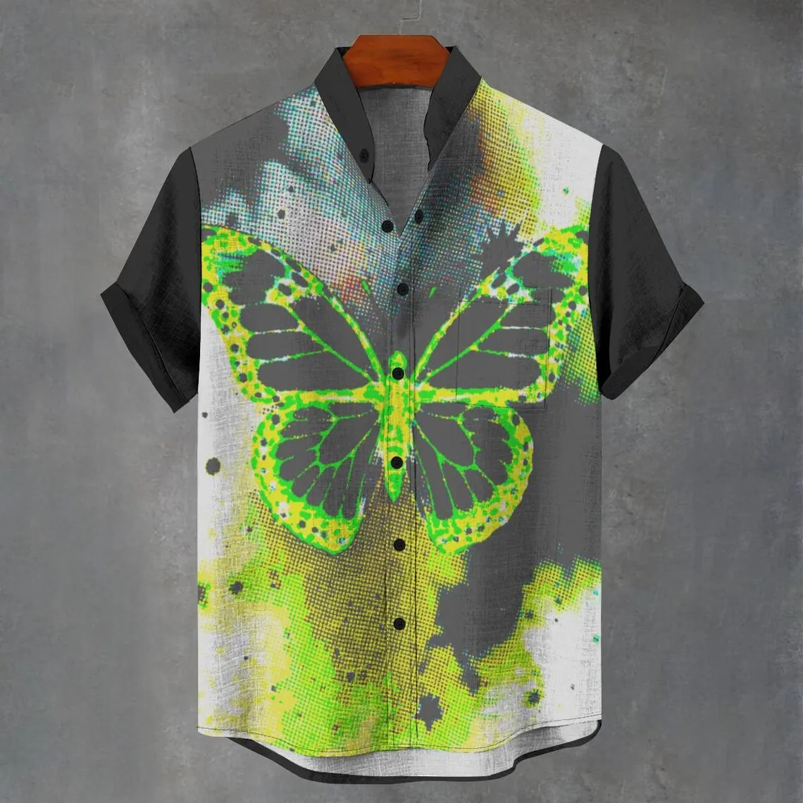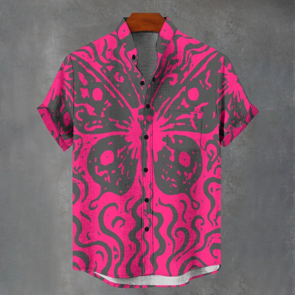 2025 new European and American 3D butterfly print loose trendy short sleeved stand up collar linen short sleeved shirt