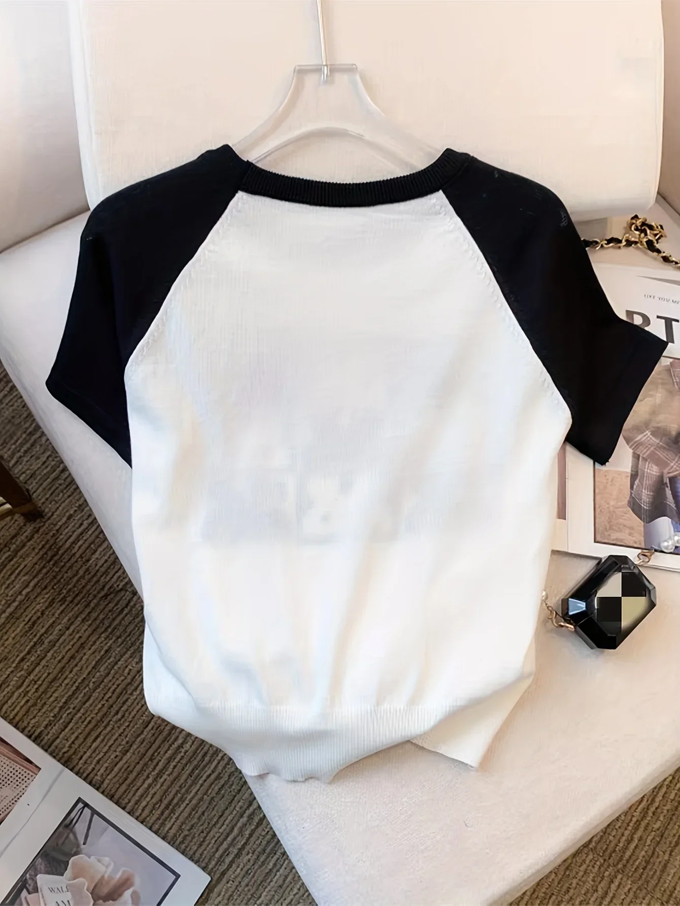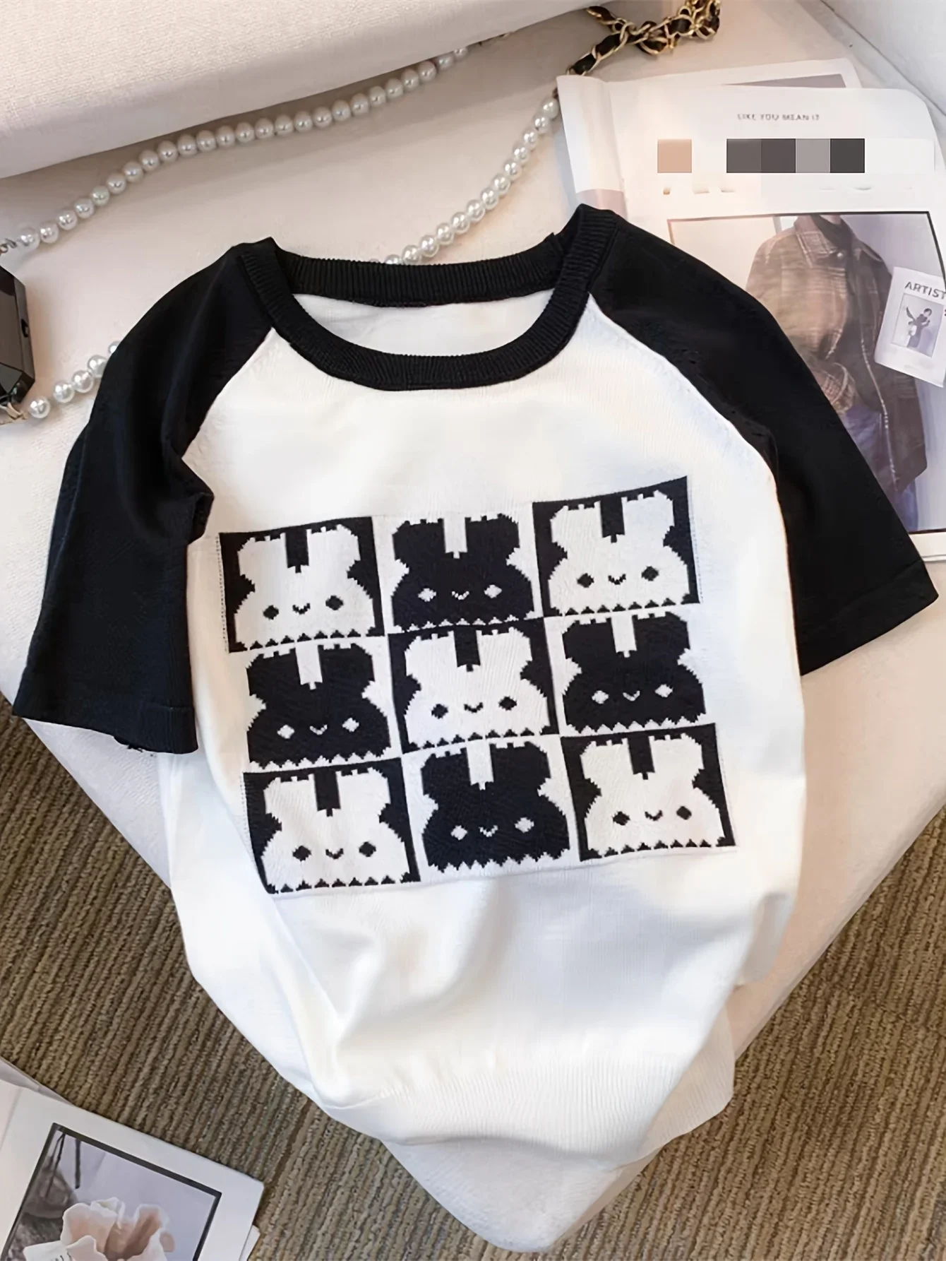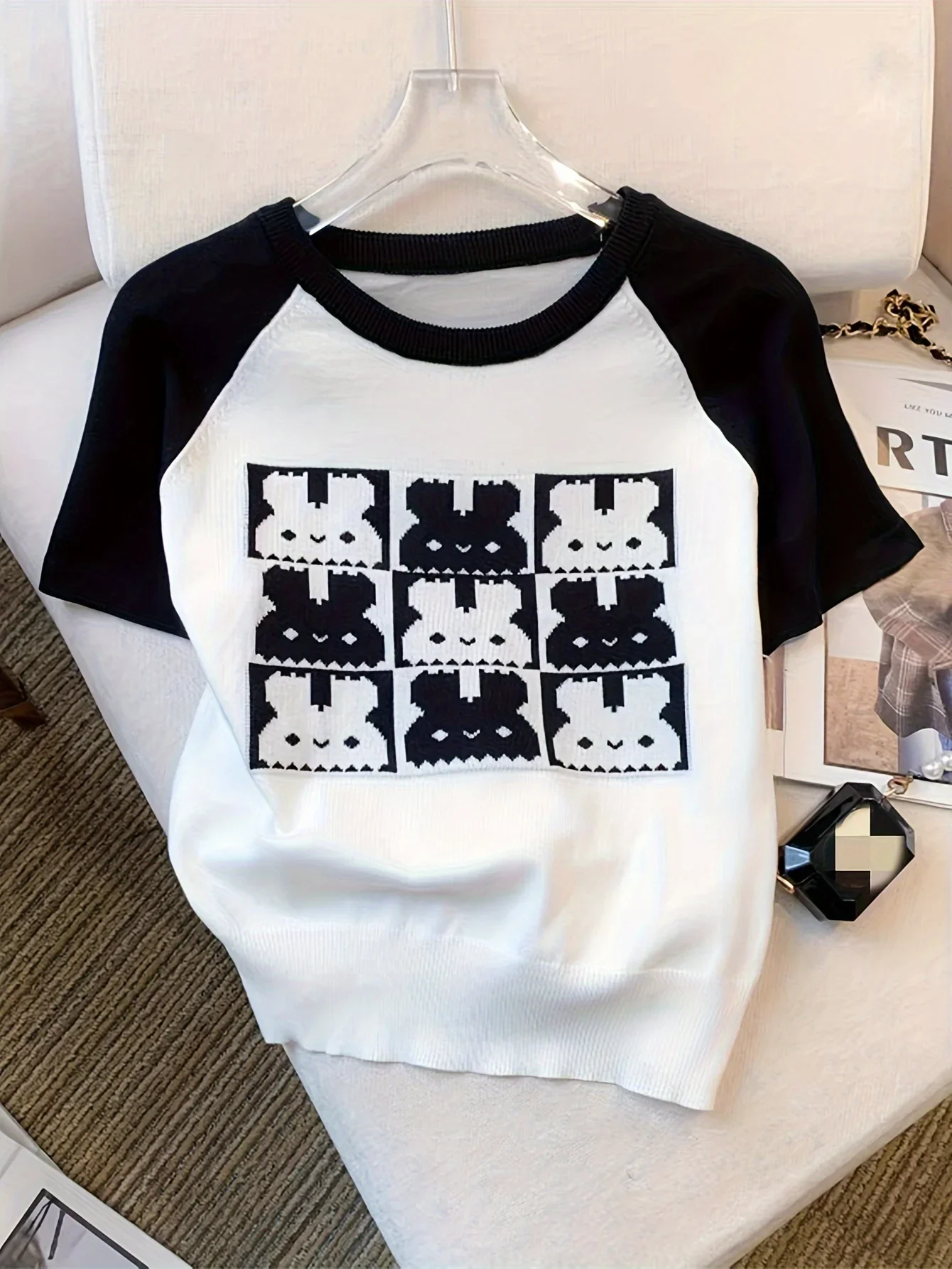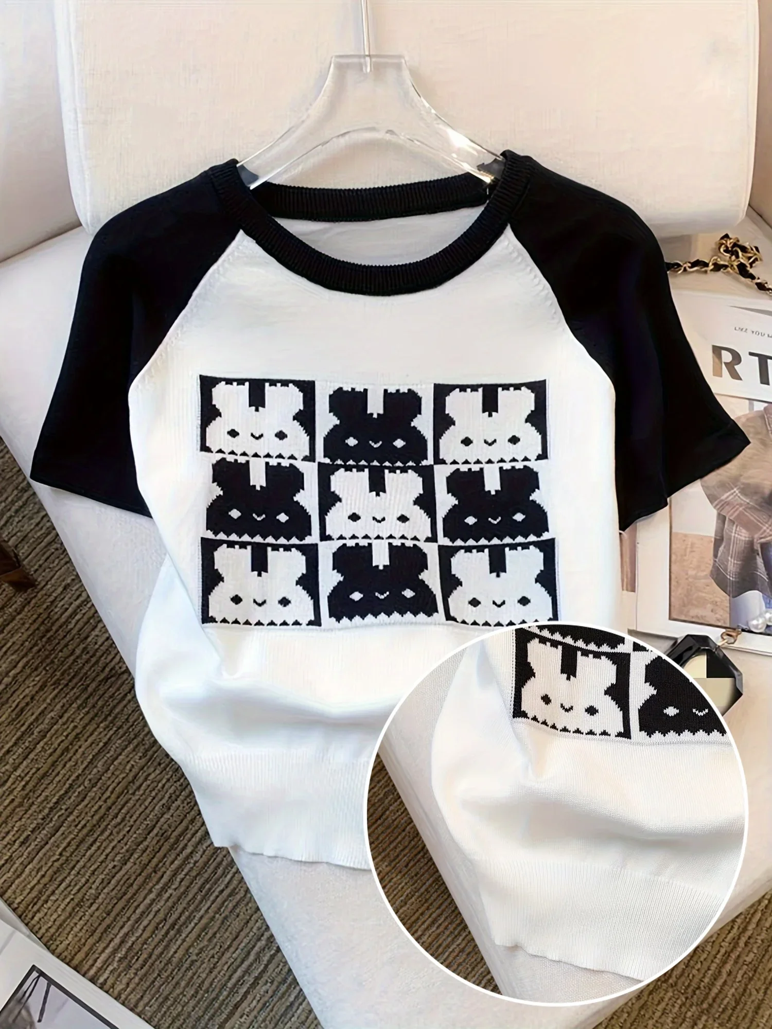2025 New Rabbit Pattern Round Neck Knitted Top Cute Short Sleeve Pullvoer Top Suitable For Spring And Summer Women’s Clothing