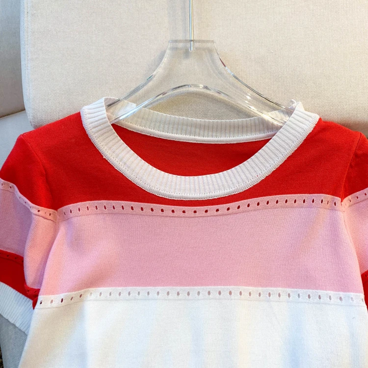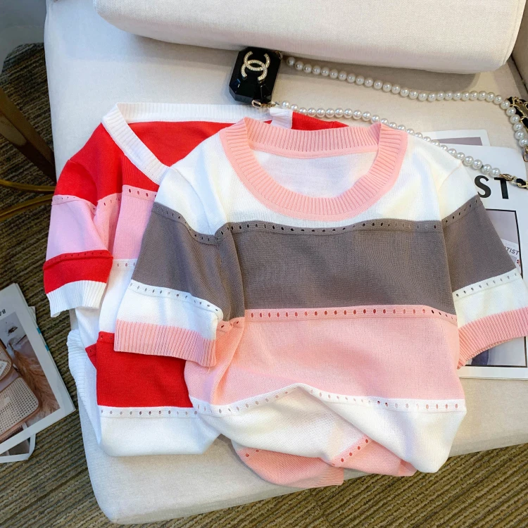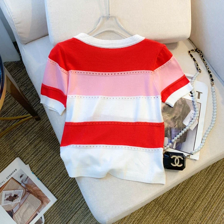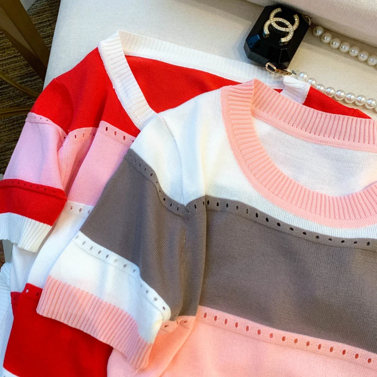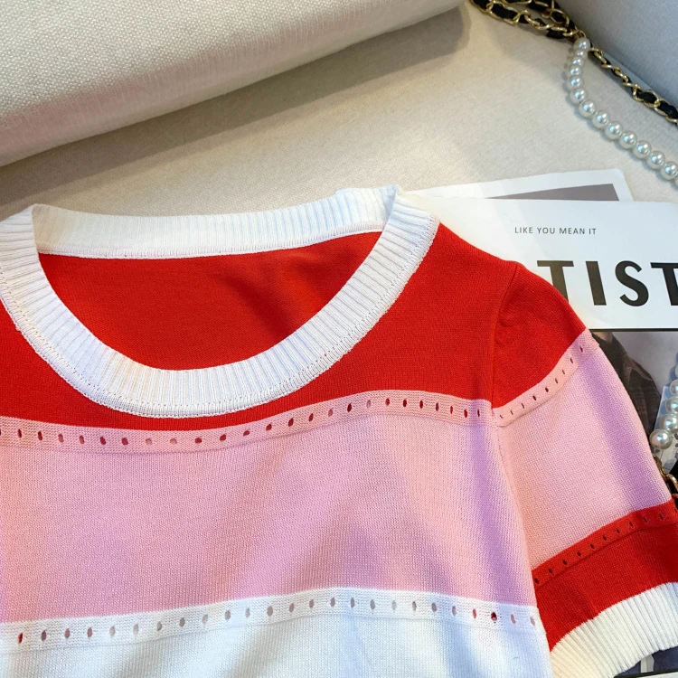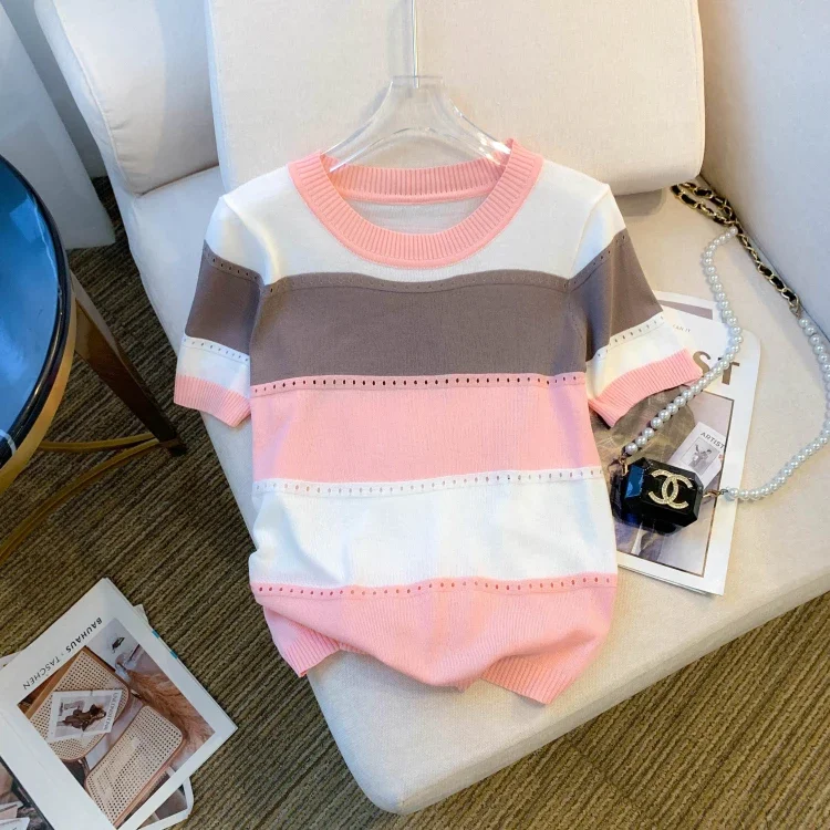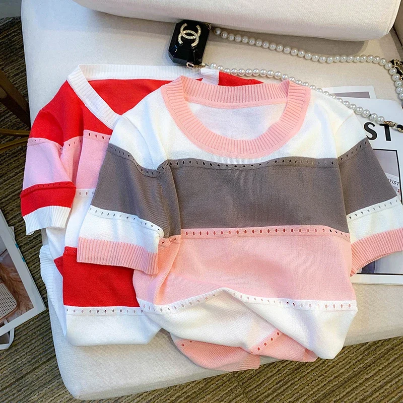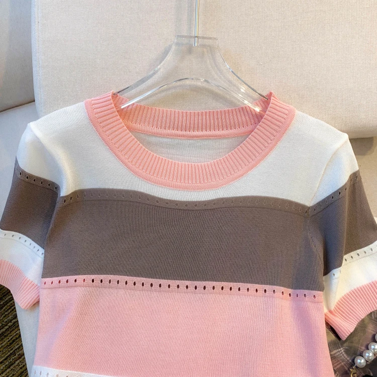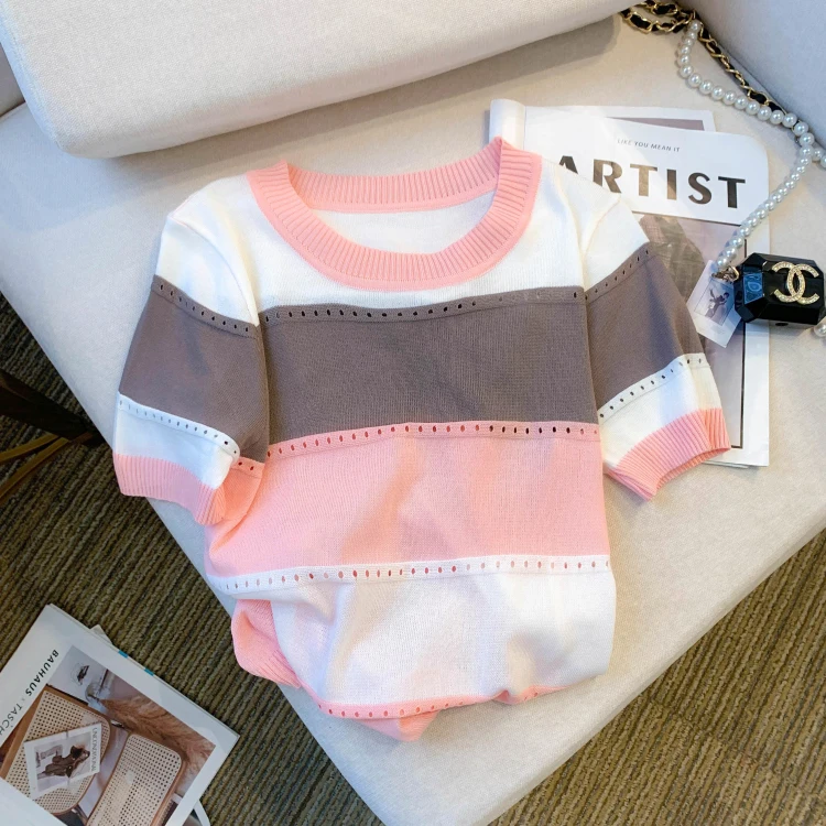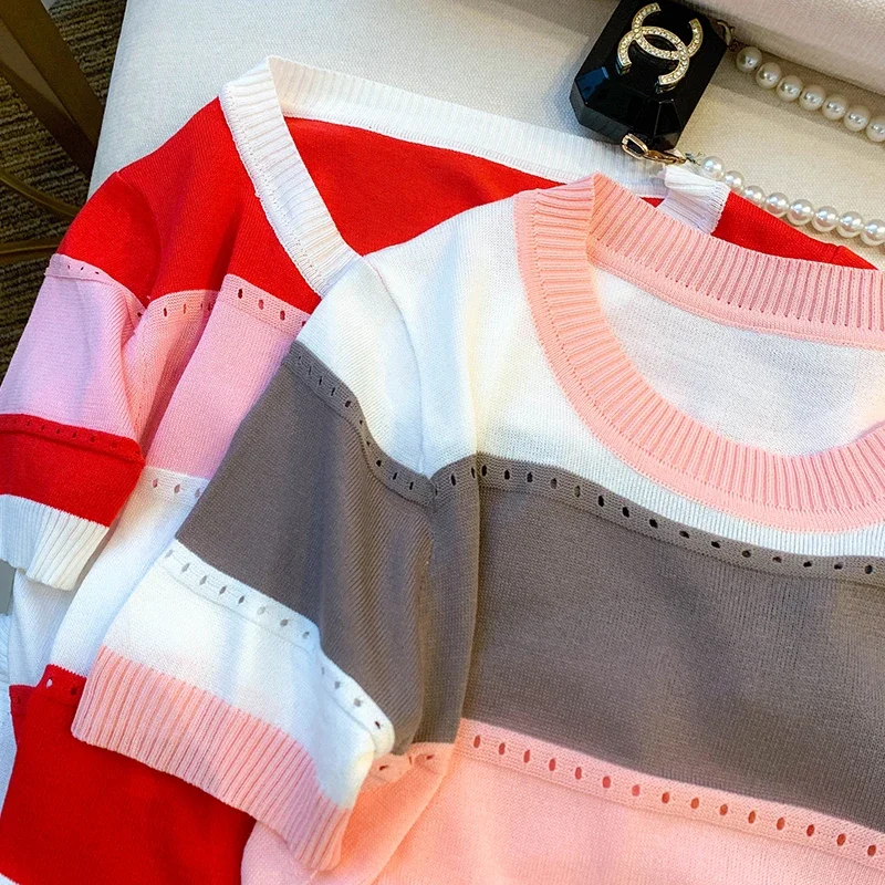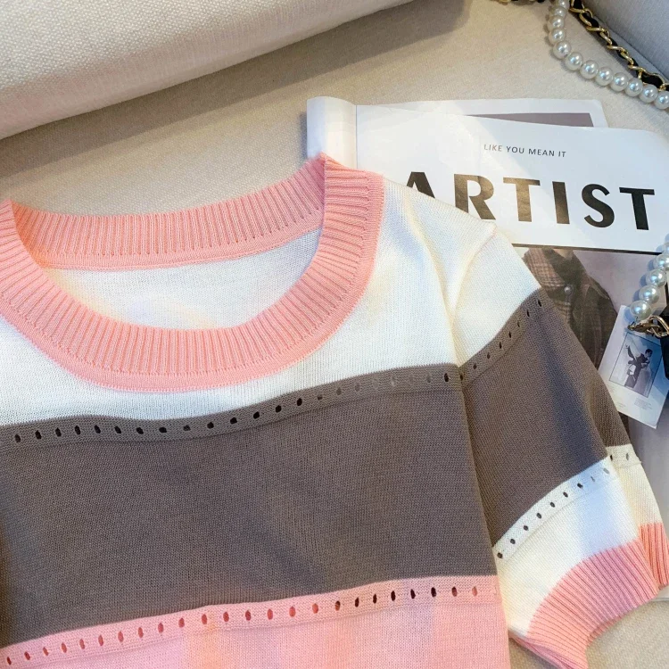 2026 New Strip Rainbow Hollow Out Crew Neck Pullover Sweater Versatile Short Sleeve Knitted Top For Spring & Women’s Clothing