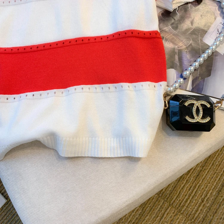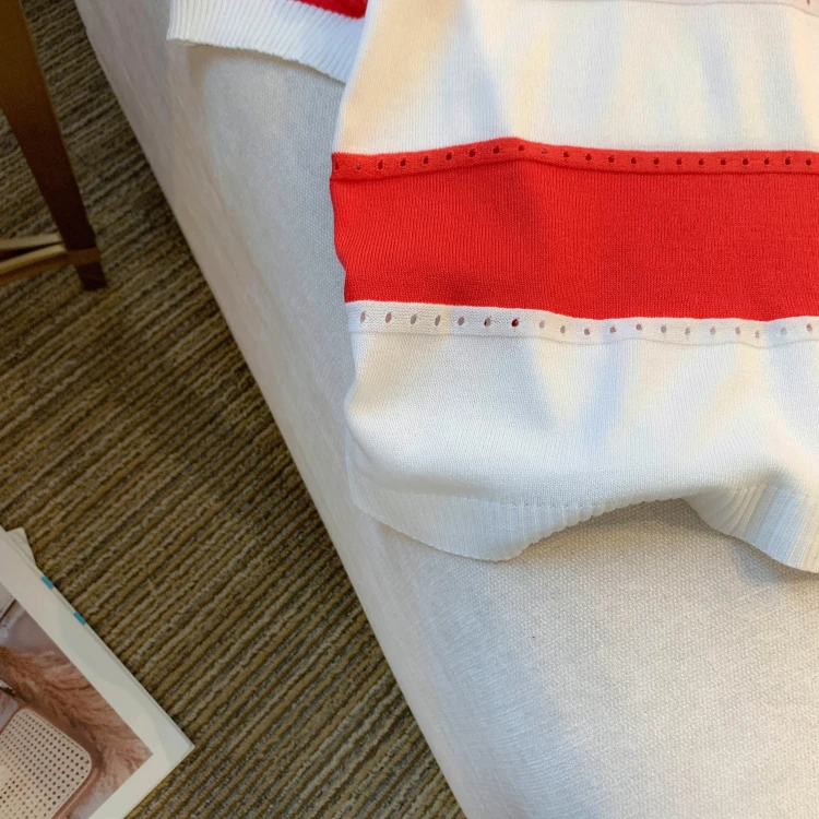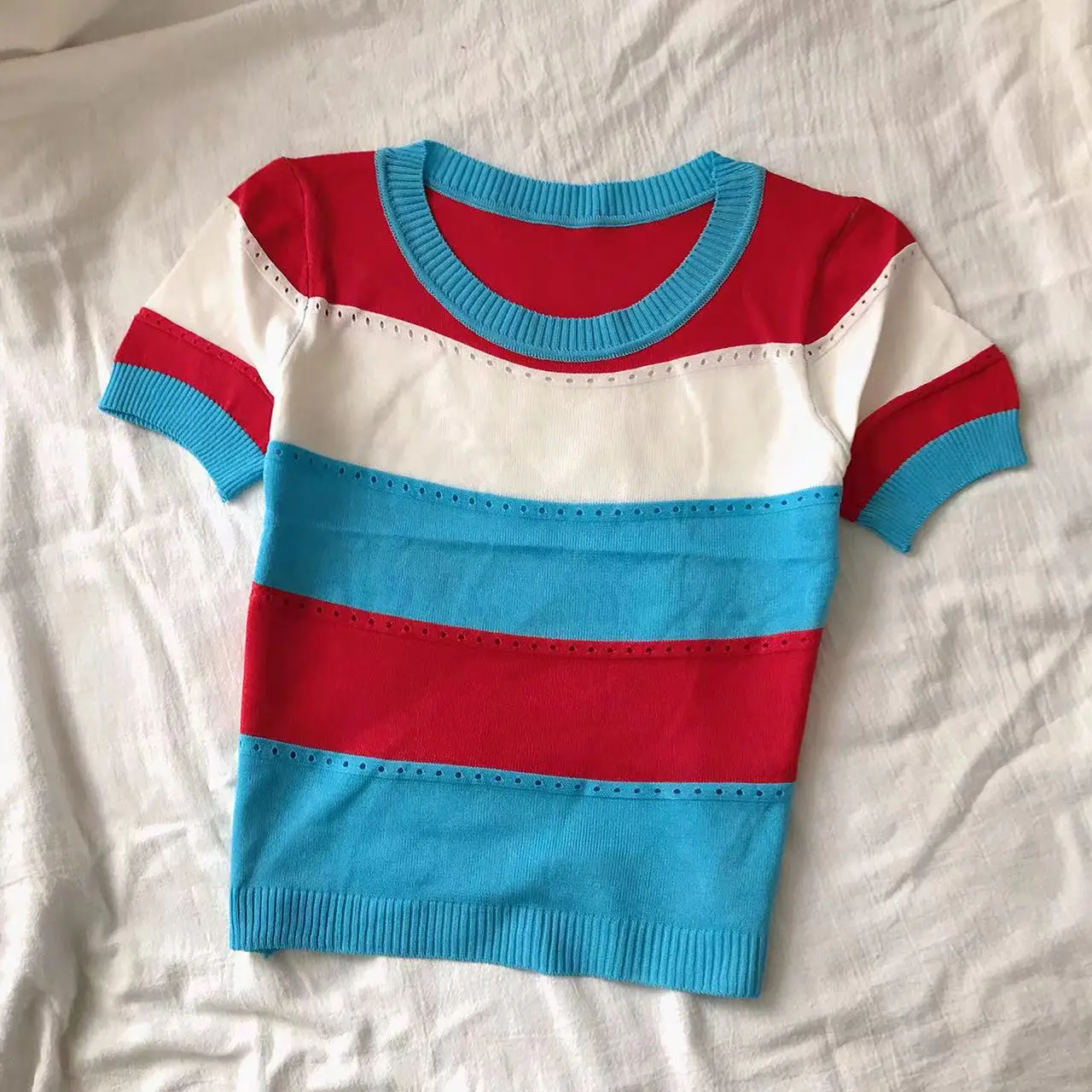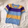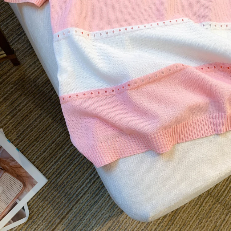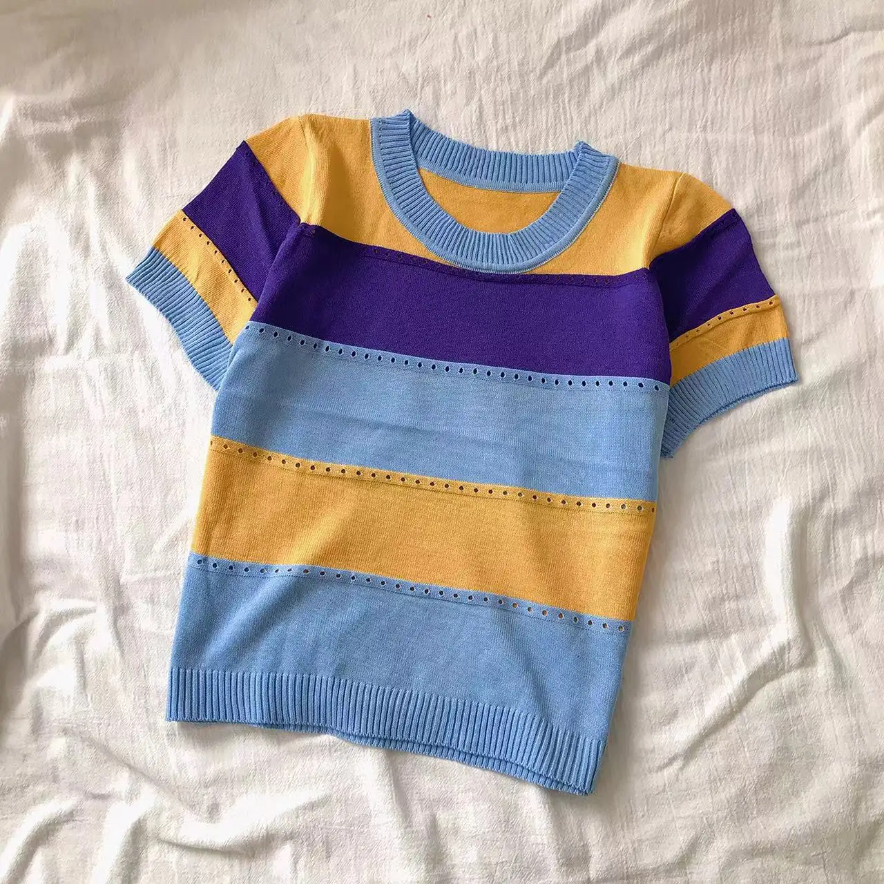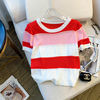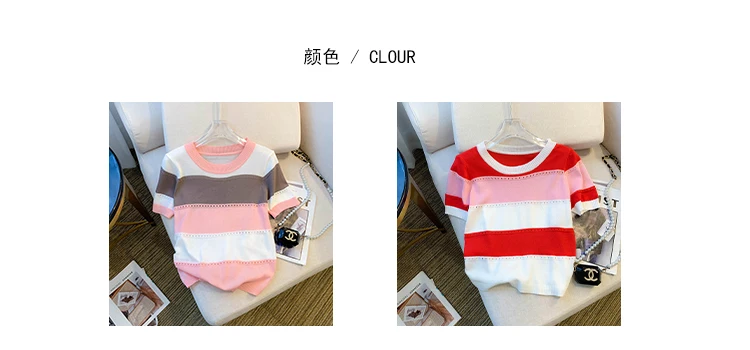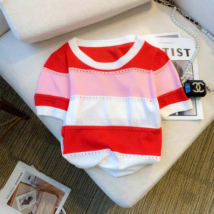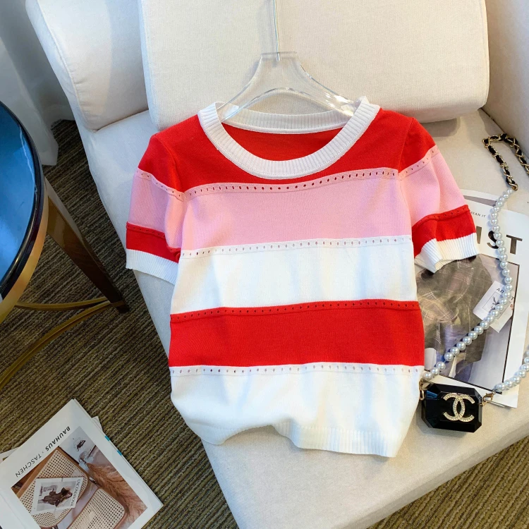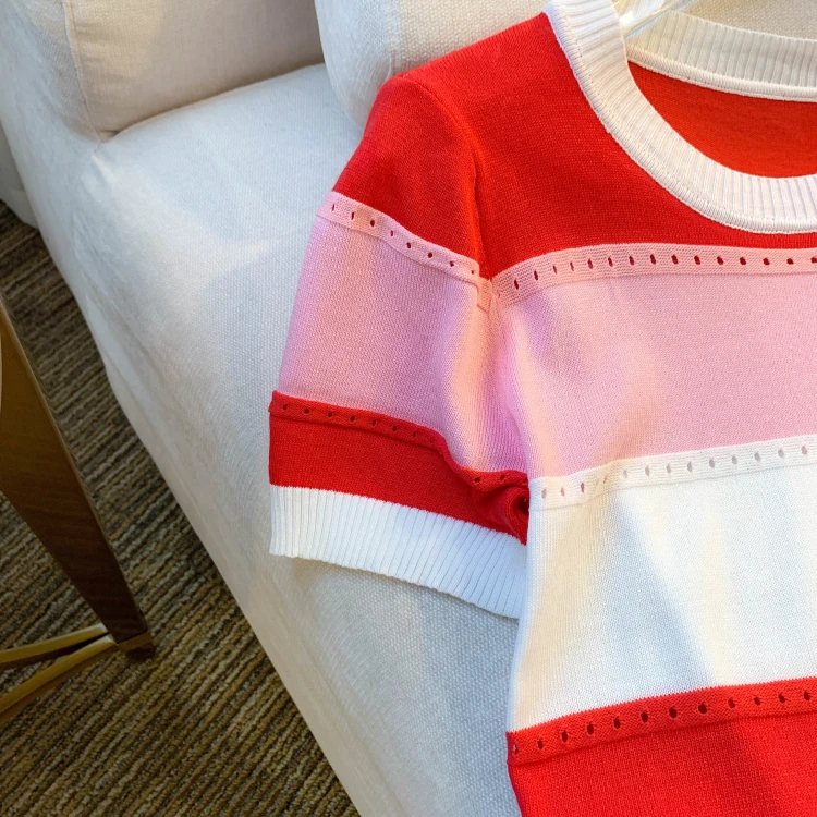 2026 New Strip Rainbow Hollow Out Crew Neck Pullover Sweater Versatile Short Sleeve Knitted Top For Spring & Women’s Clothing
