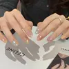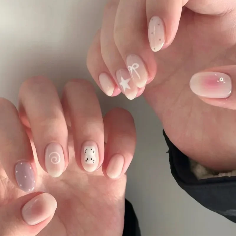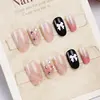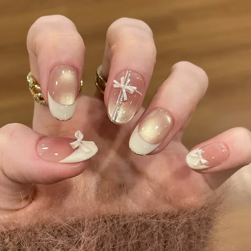 24PCS Cute Red Bowknot Short Oval Press on Nail with Glue Cartoon Cat Glossy French Fake Nails for Girls Wearable Ins Nail Tools