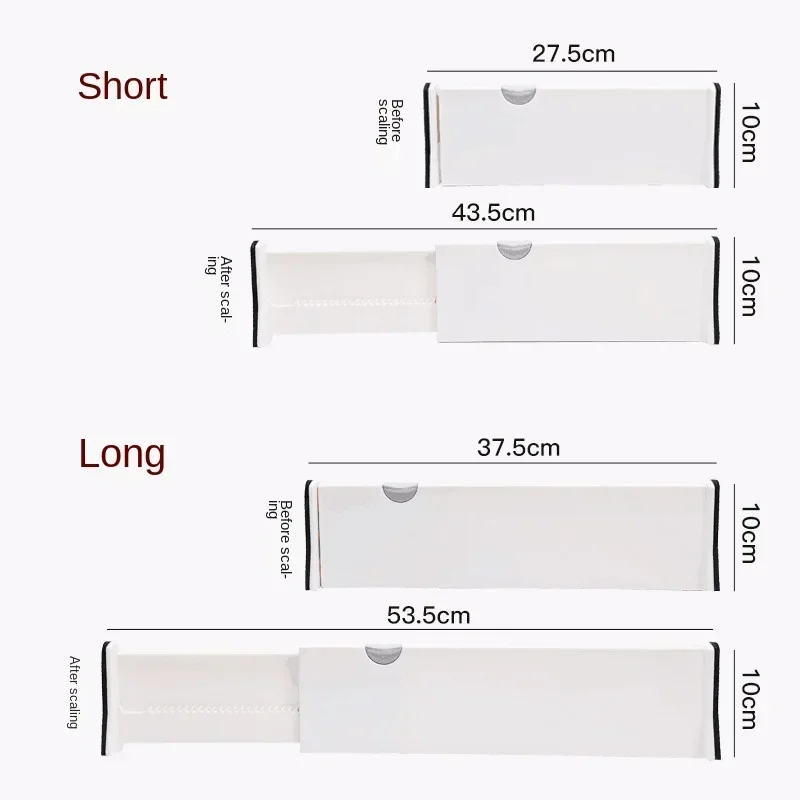 We have 2 kinds storage boxes, height 10cm and length 28.3-44cm/38-54.2cm.The expandable design fits most drawers and cabinets from front to back or from side to side.