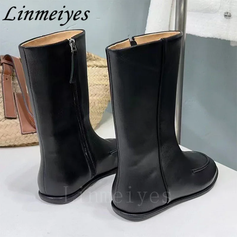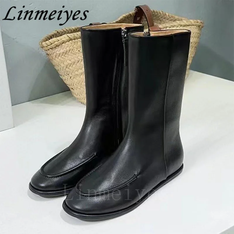New Flat Short Boots Woman Genuine Leather Round Toe Knight Boots High Quality Flat Shoes Women Runway Mid-Calf Boots Women