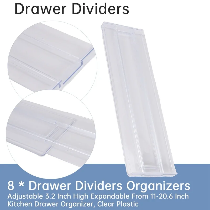A76I-Drawer Dividers 8 Pack, Adjustable 3.2 Inch High Expandable From 11-20.6 Inch Kitchen Drawer Organizer, Clear Plastic