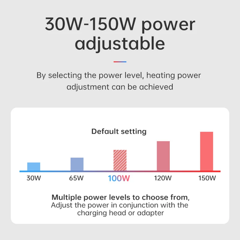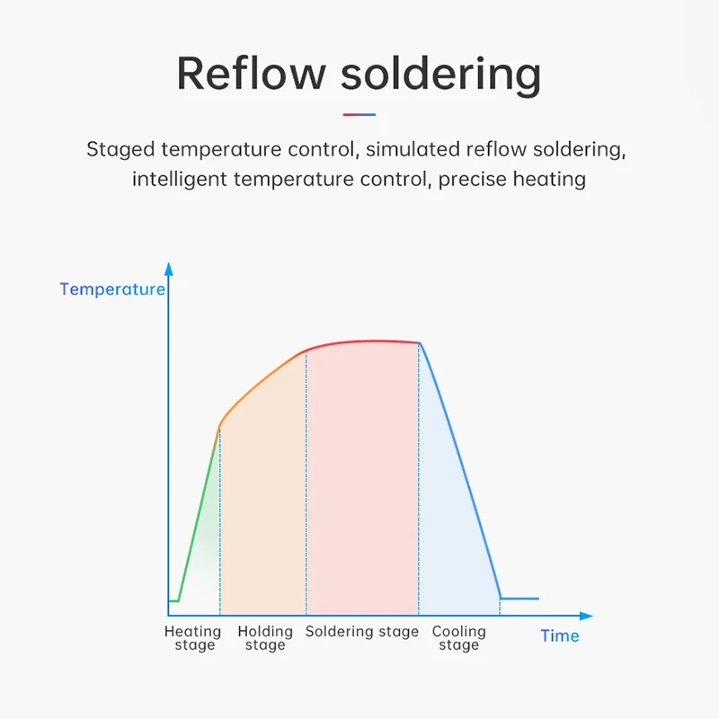 4. Support 80℃~350℃ heating temperature range Support 150W high-power heating, rapid heating Support constant temperature heating and reflow soldering dual working modes Support color light temperature prompt, color changes with temperature Support dumping detection, safer to use
