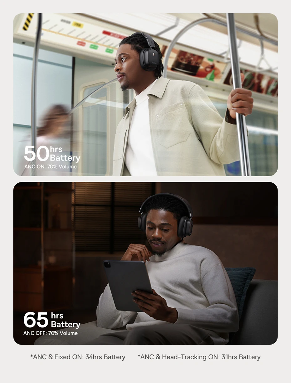6.Battery Life 65hours with ANC off, 50hours playtime with ANC on,10mins charging=10hours battery