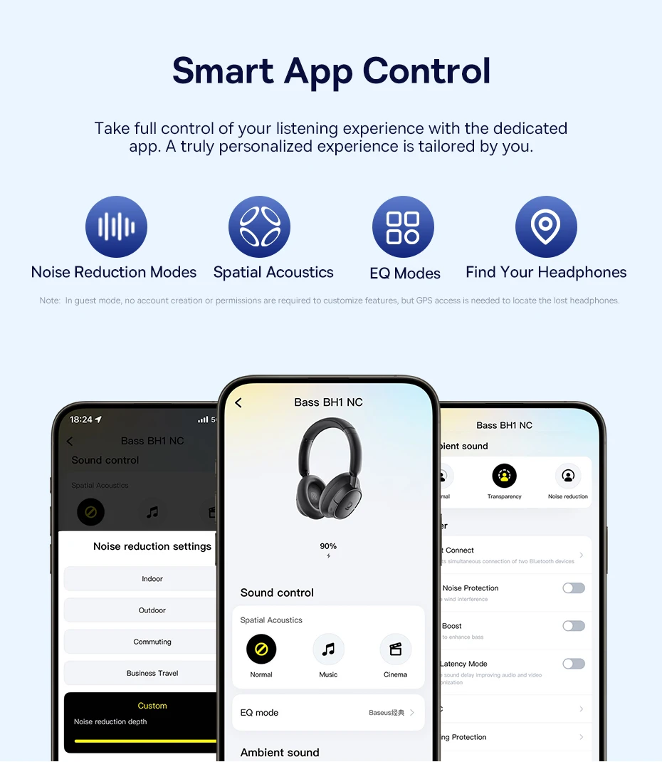In guest mode, no account creation or permissions are required to customize features,but GPS access is needed to locate lost earbuds.