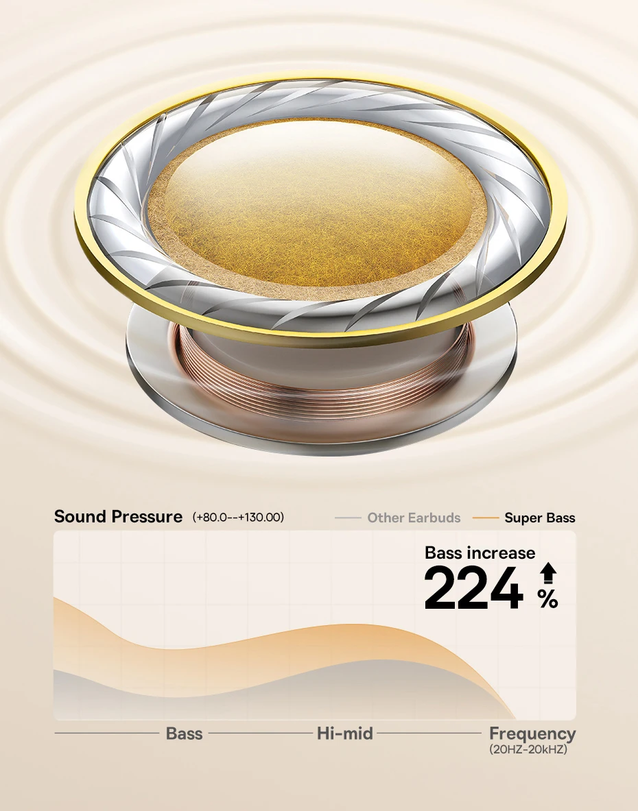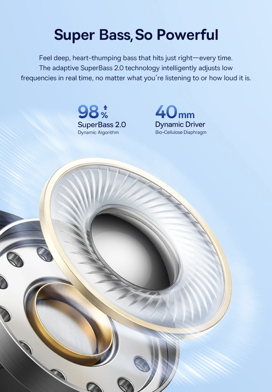 3.SuperBass 2.0: Feel the beat with rich, punchy bass and detailed clarity. The adaptive noise cancelling headphones use SuperBass 2.0 to dynamically enhance low frequencies in real time, paired with a bio-cellulose diaphragms and dynamic drivers for immersive depth.
