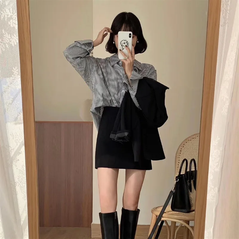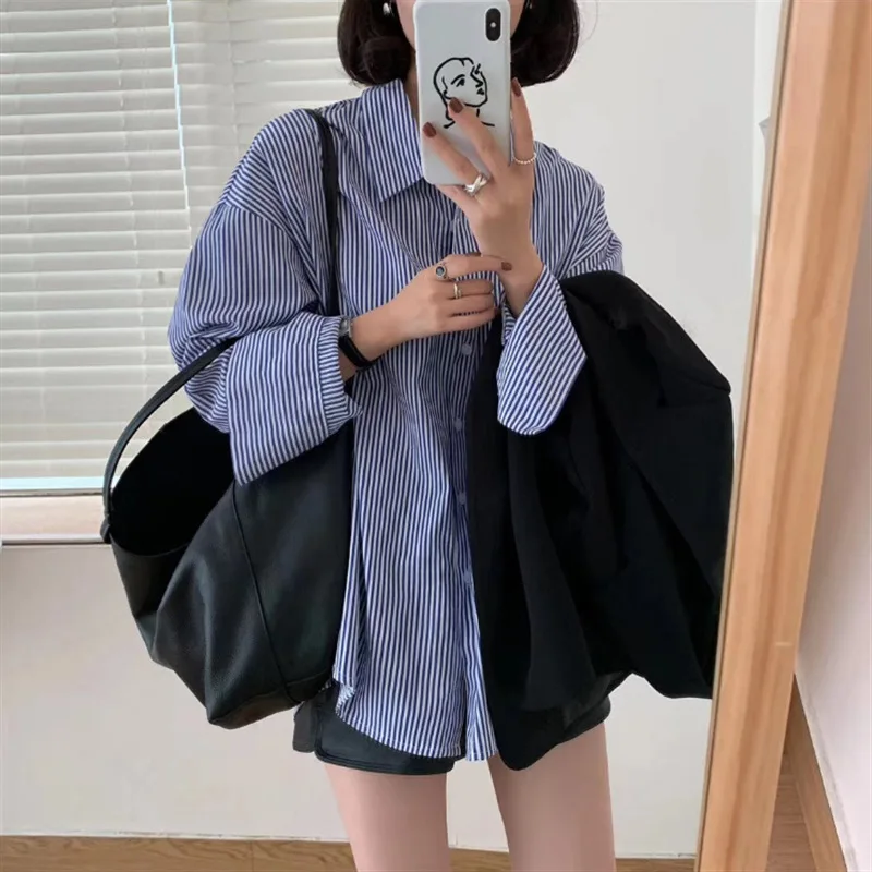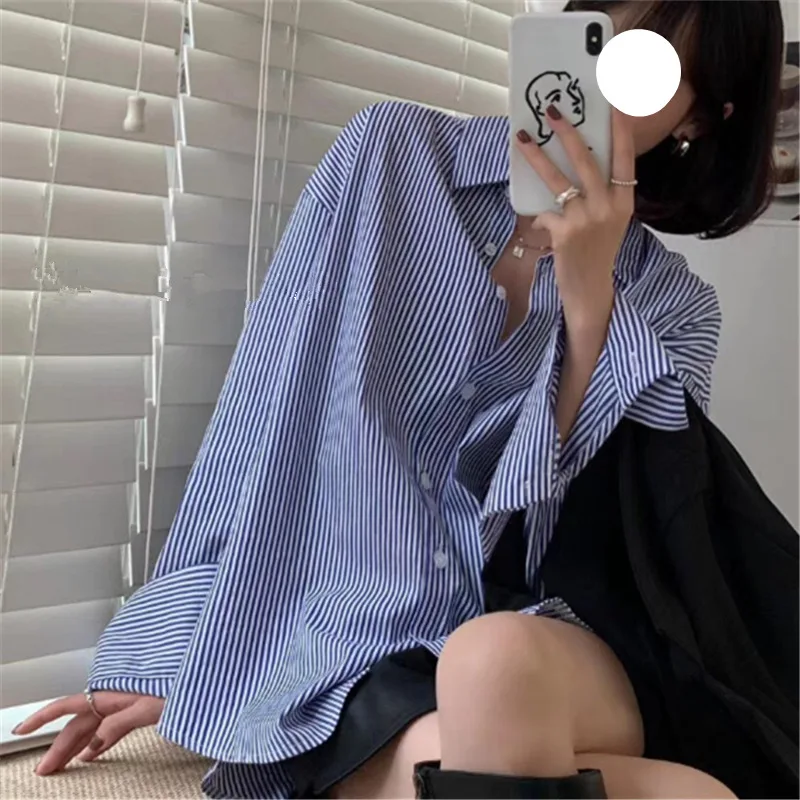 Blouse Women 2025 summer striped female long-sleeved blouse loose folded a striped female Women’s clothing XFSP1116