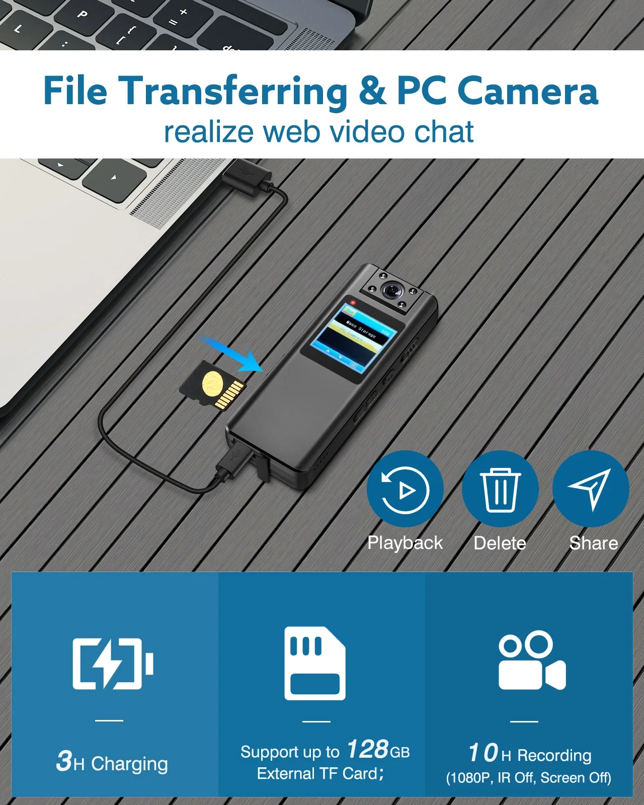 【Built-in 2200MAH Battery】 The portable body camera for daily recording could record 10 hours of the video after fully charged (in 1080P, IR Off, Screen Off). Recording and charging simutaneously.