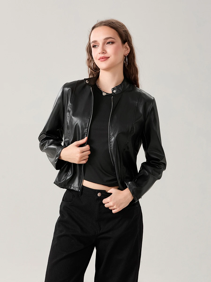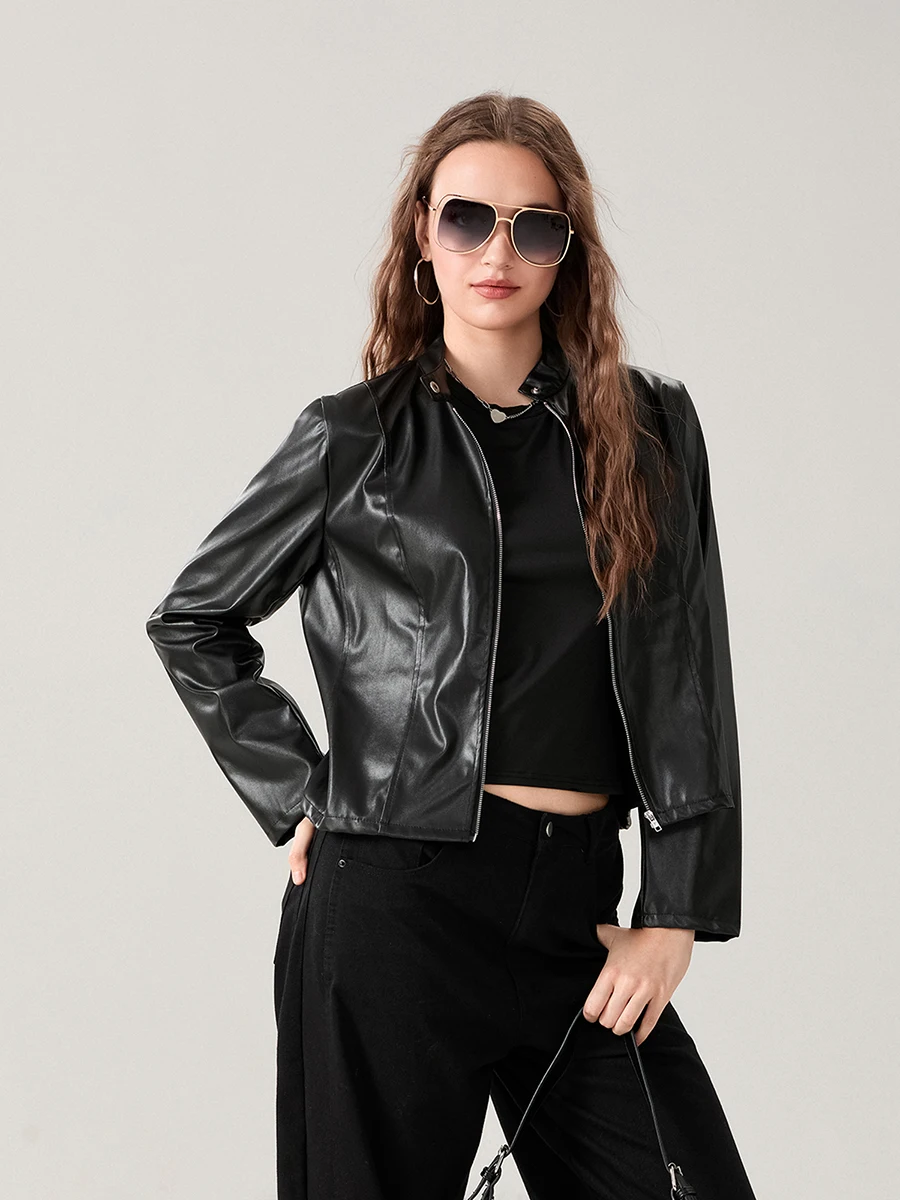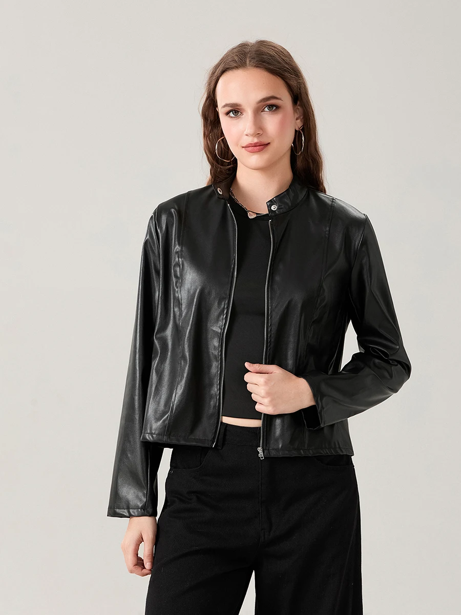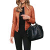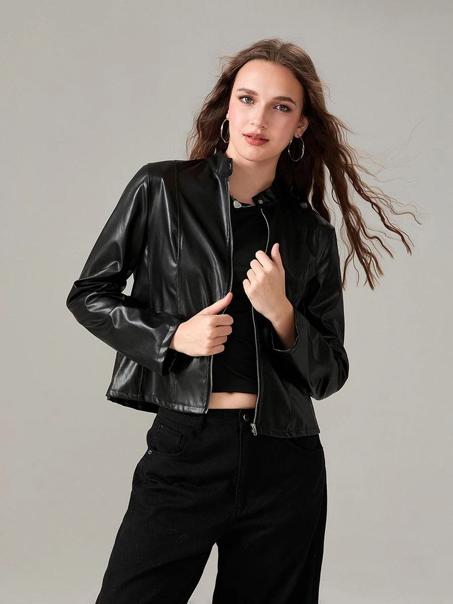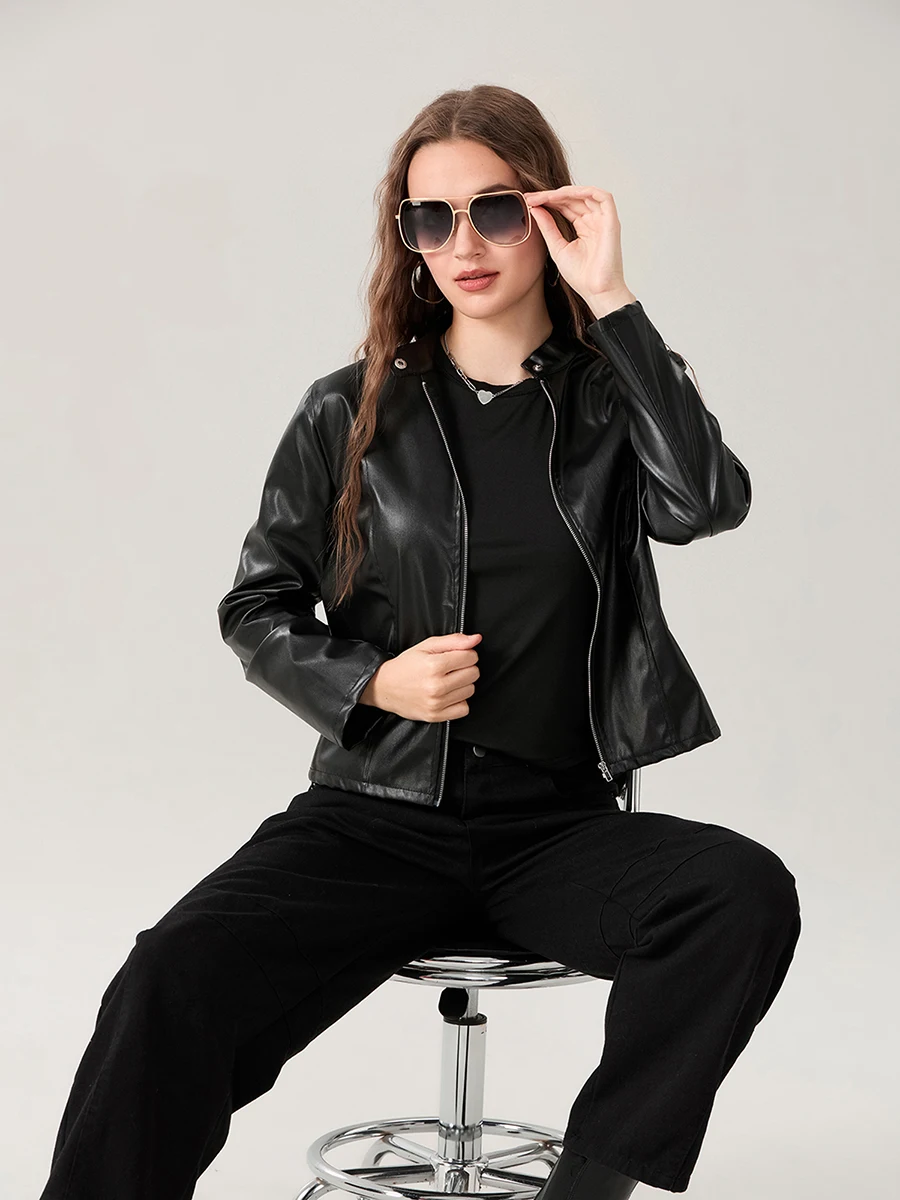 Women’s Faux Leather Jacket, Slim Moto Biker Jacket Outerwear, Long Sleeve Zipper Short Jacket