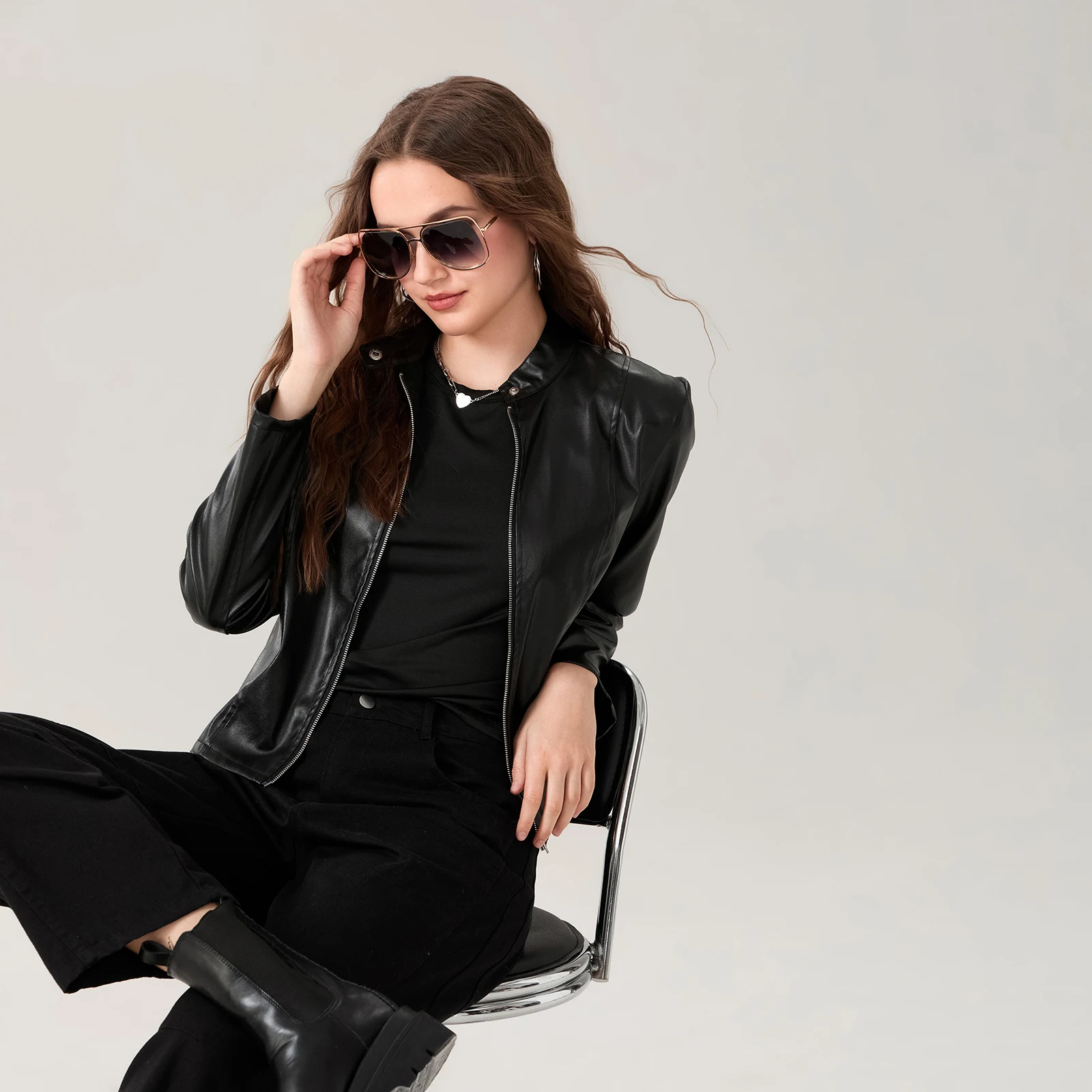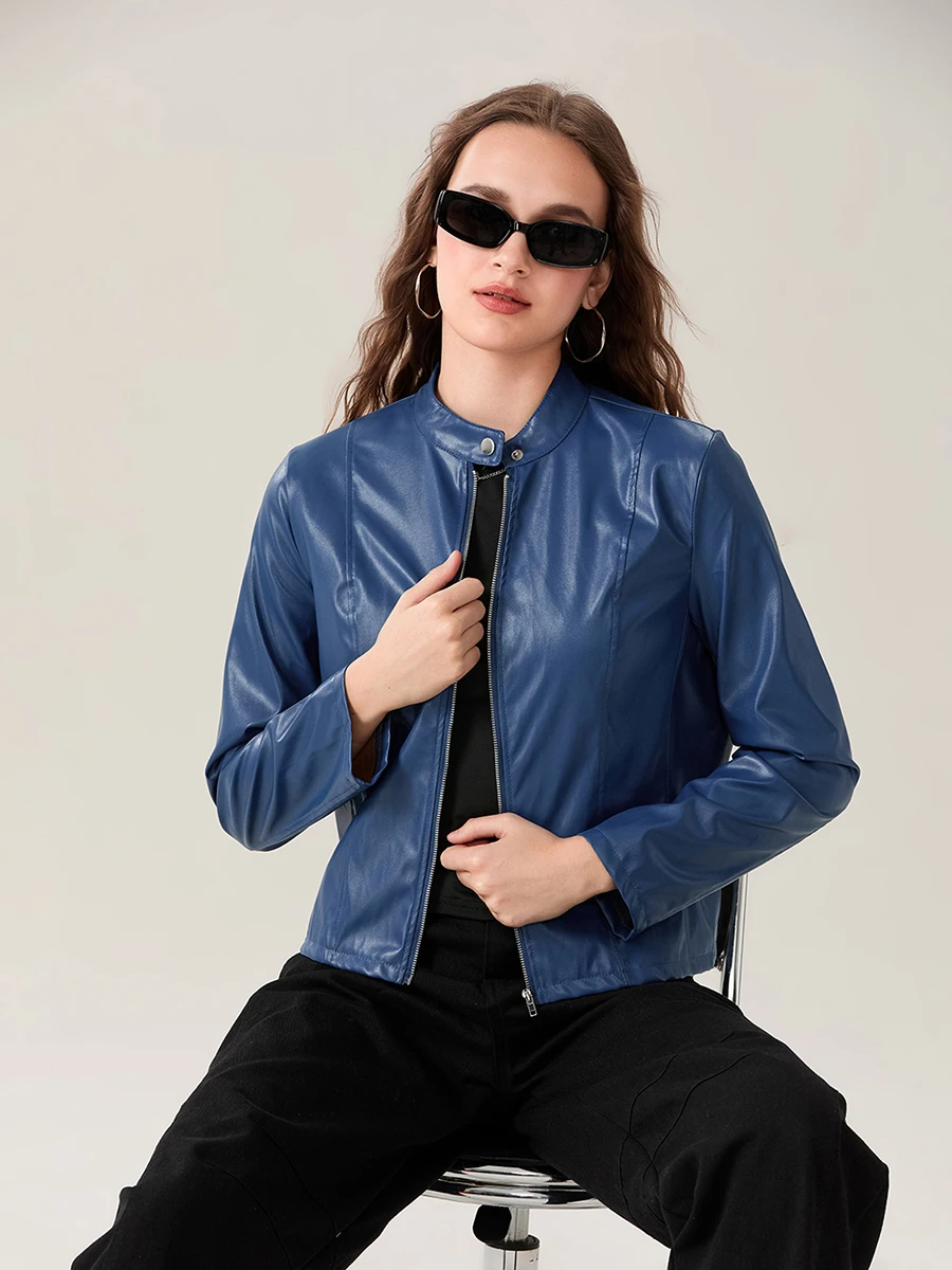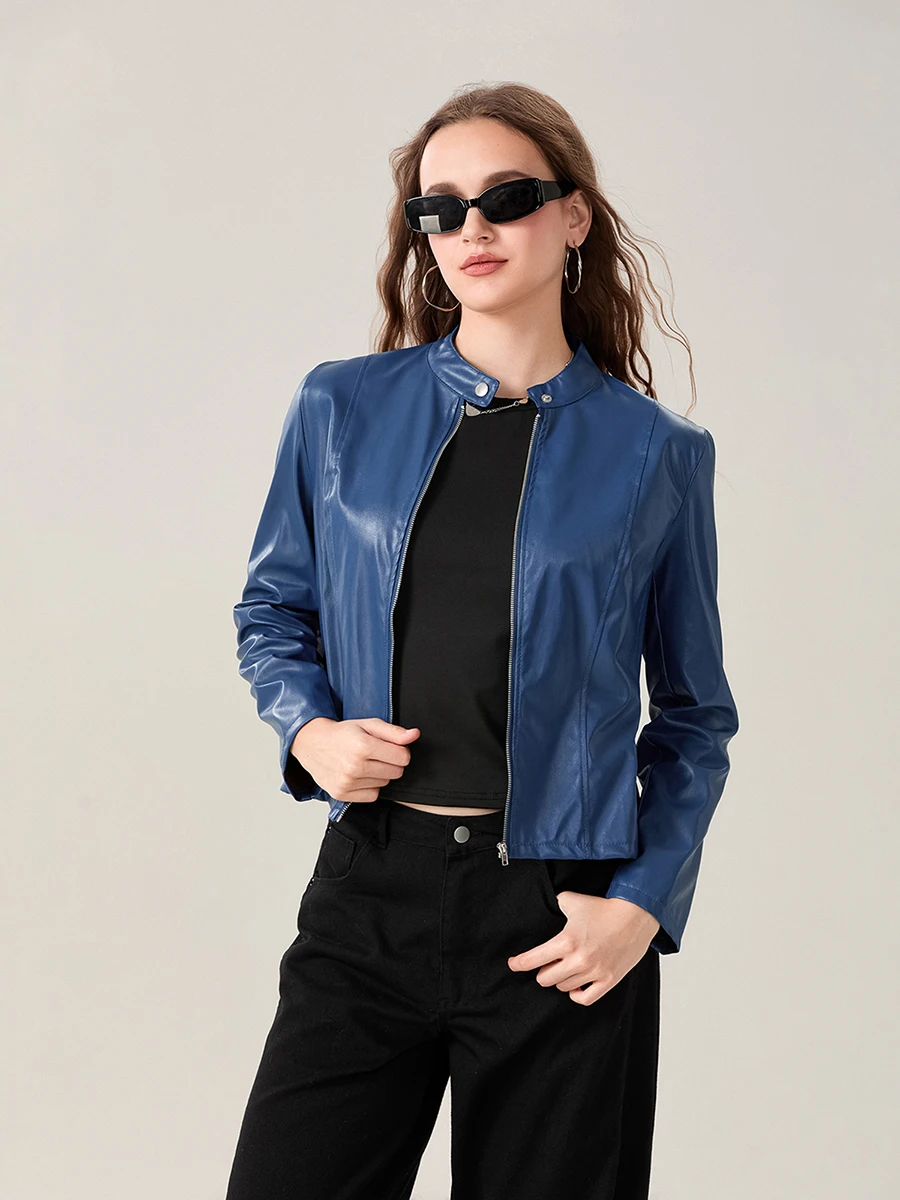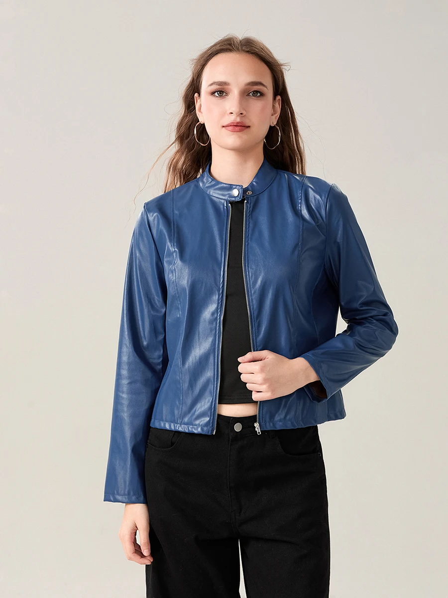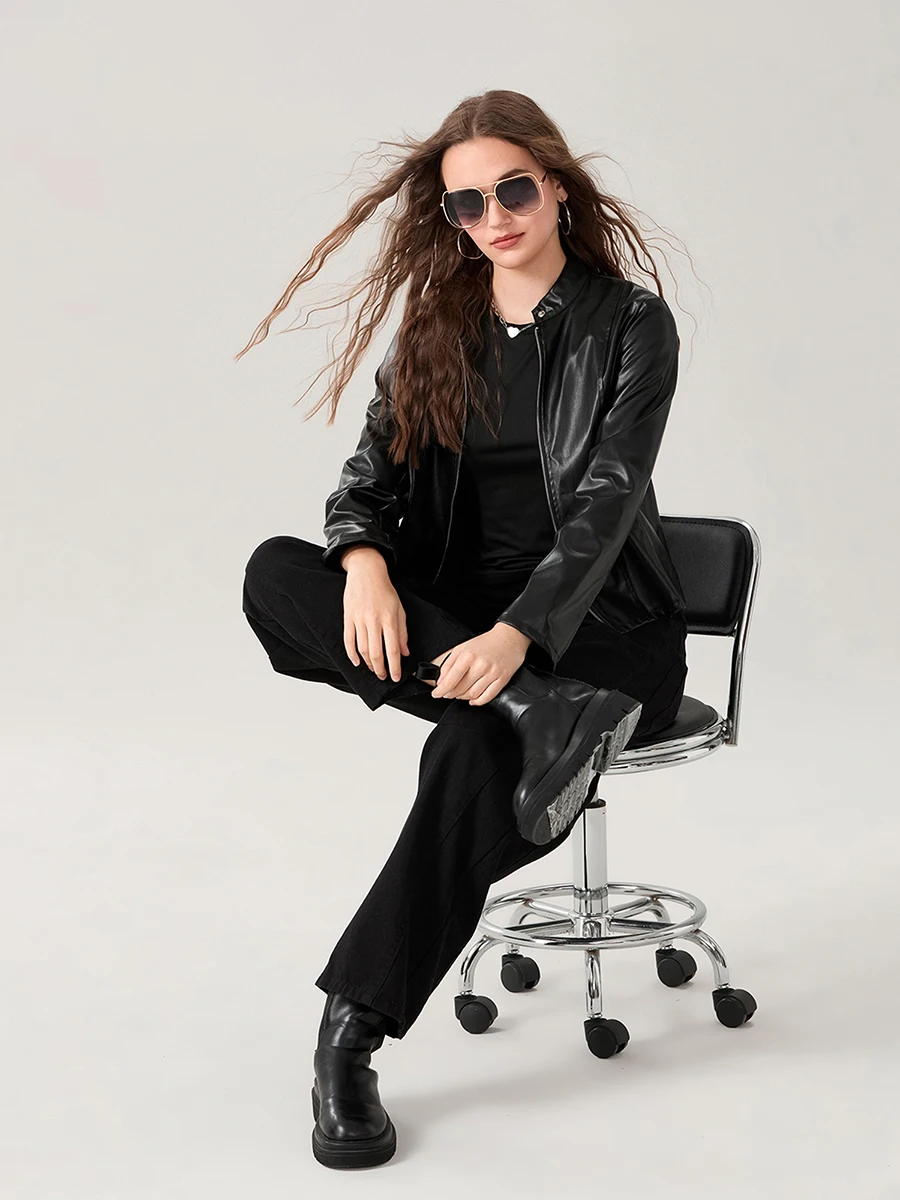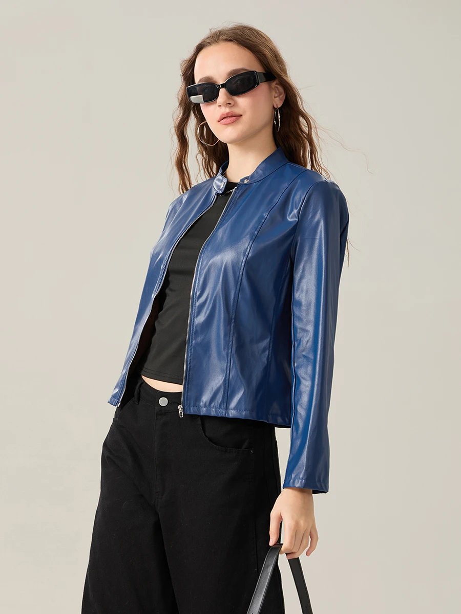 Women’s Faux Leather Jacket, Slim Moto Biker Jacket Outerwear, Long Sleeve Zipper Short Jacket