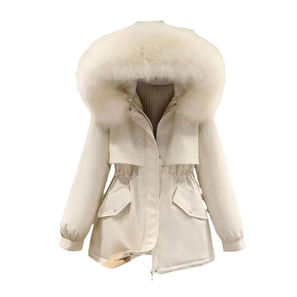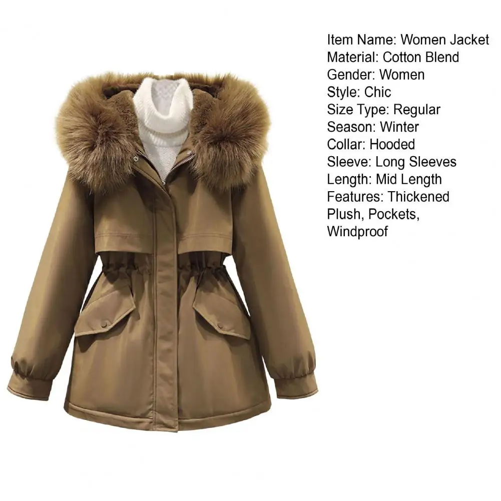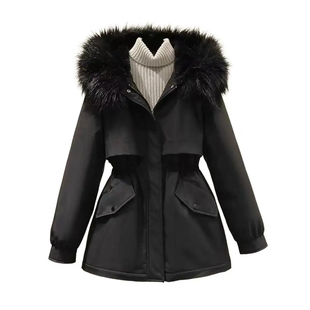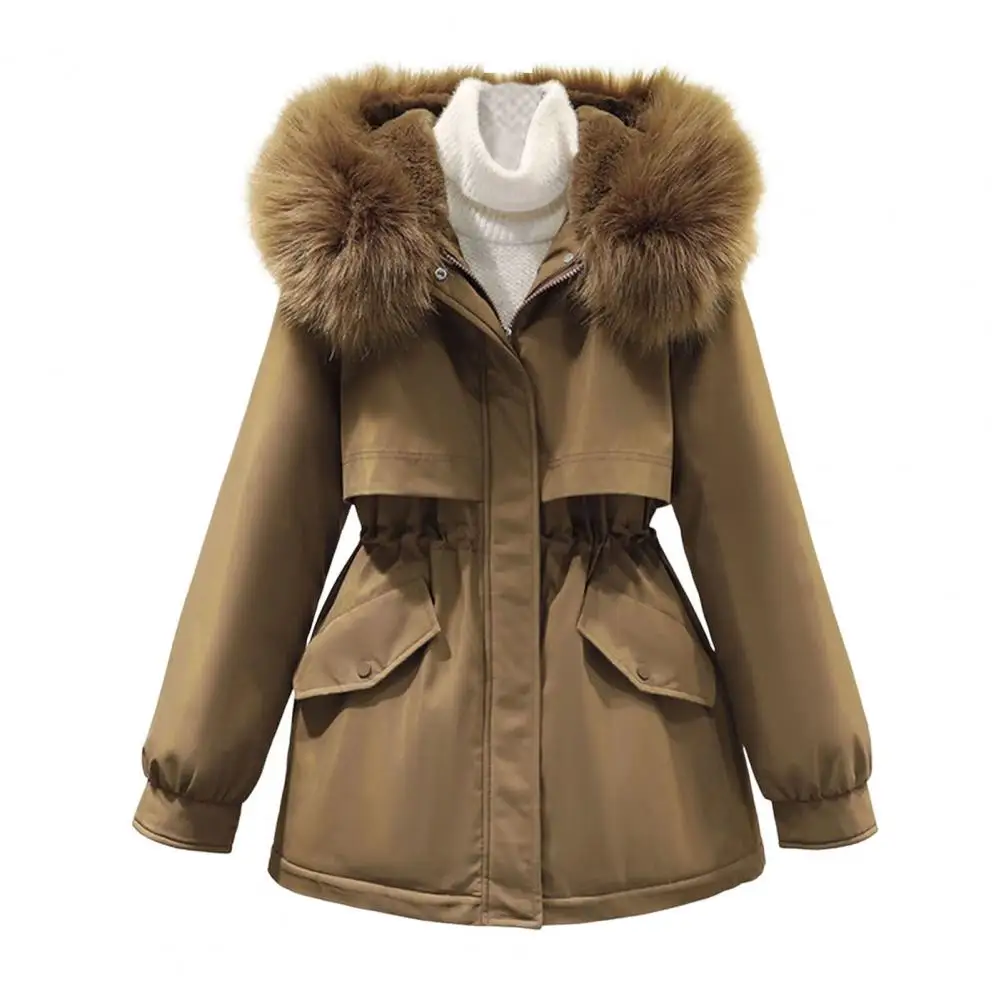 Functional Design: Stay cozy and stylish with this women’s jacket featuring a solid color scheme, spacious pockets, convenient zipper closure, hooded silhouette, and a fur collar embellishment for added flair.