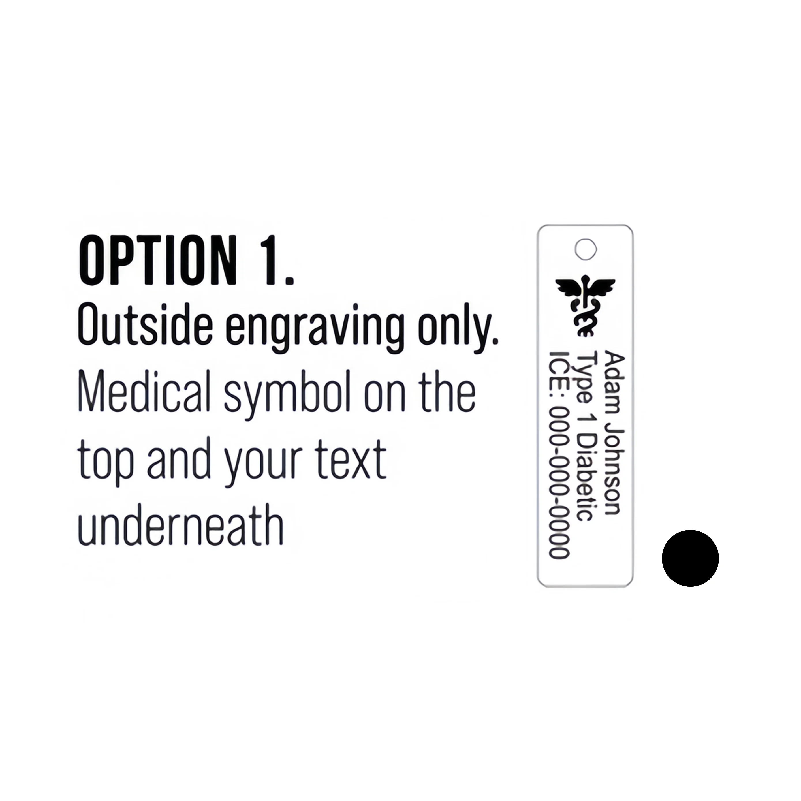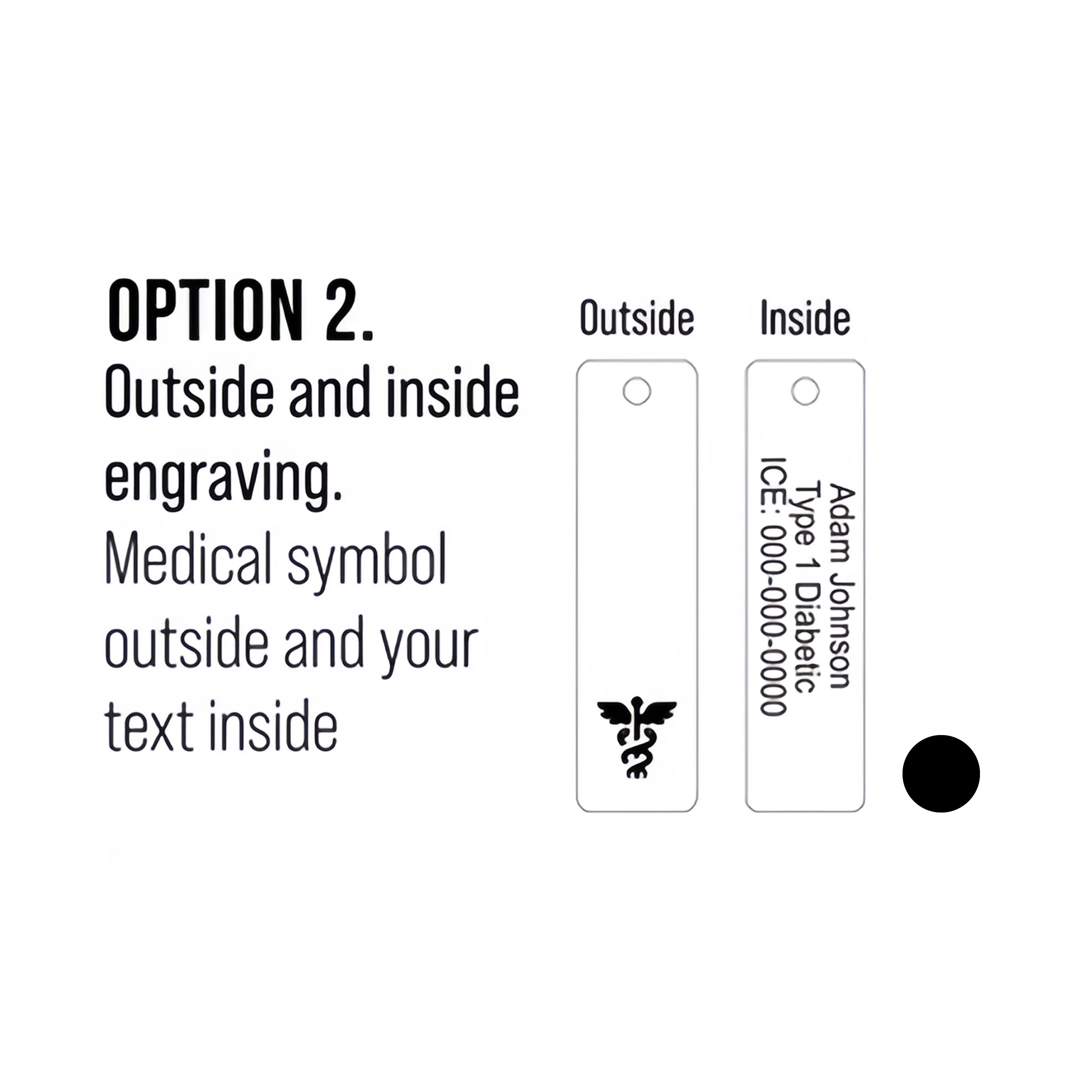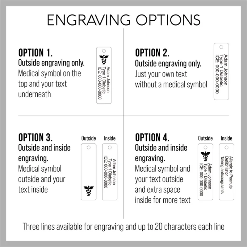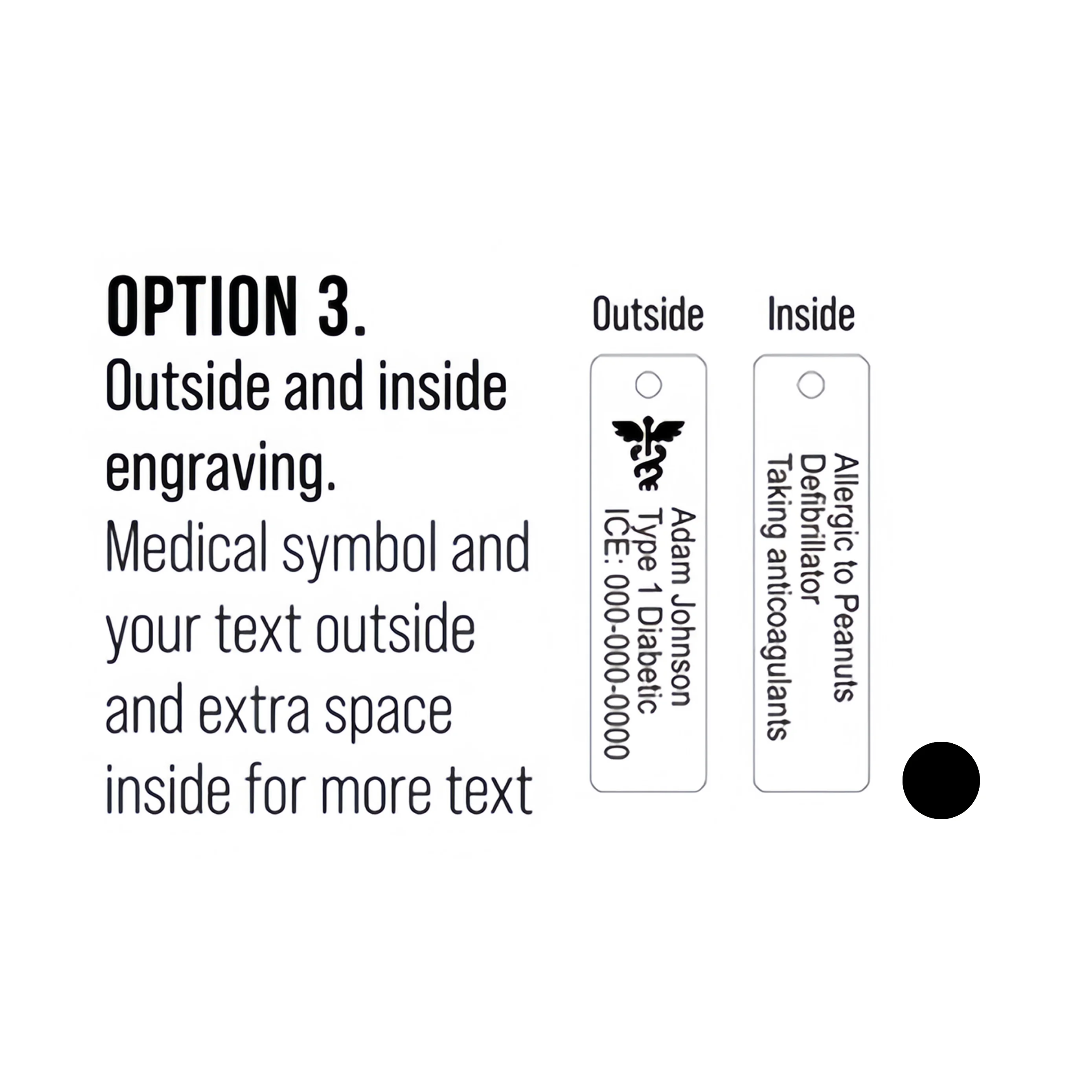 Features laser engraving for clear, permanent medical information, ensuring quick attention in emergencies.