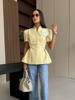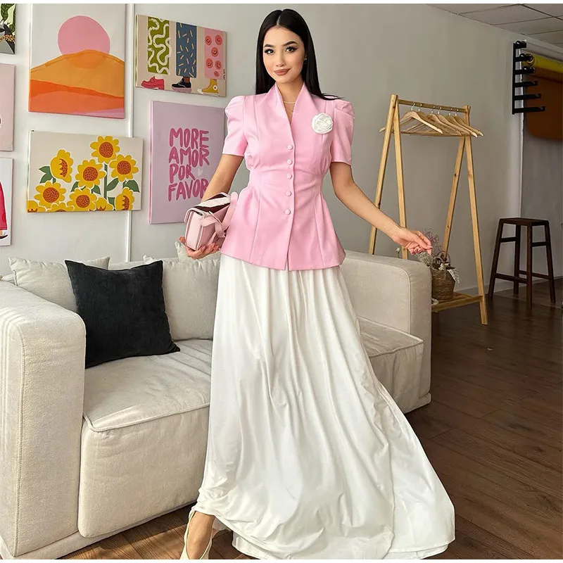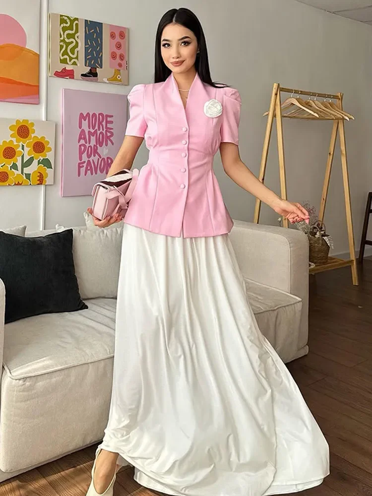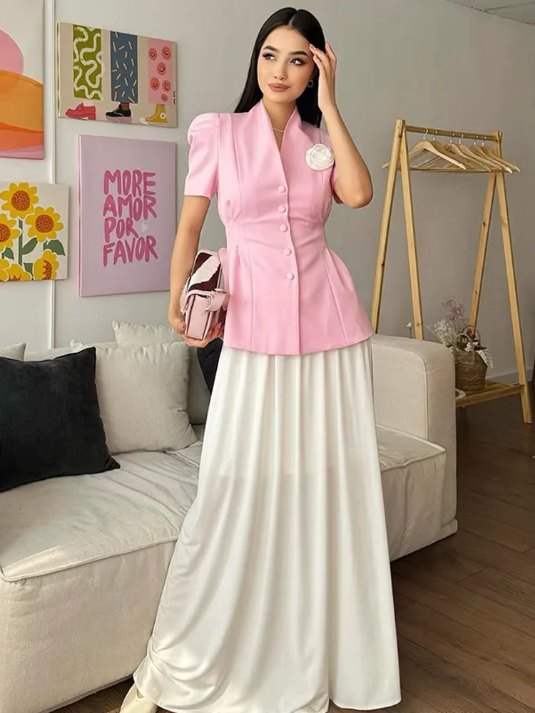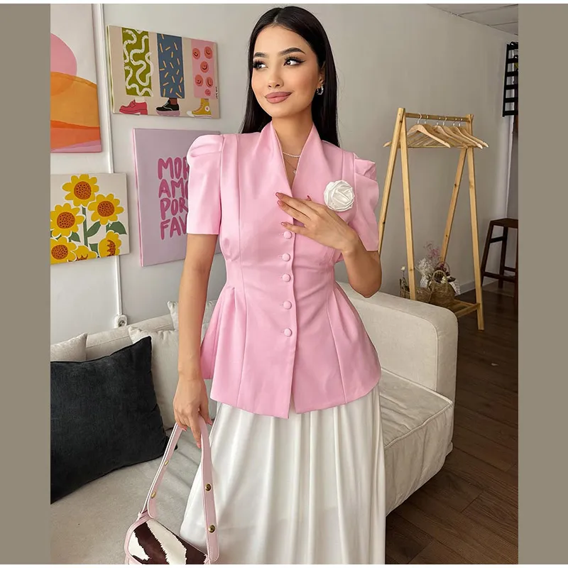 Elegant 3d Flower Splicing Pleated Slim Jacket Women Chic Short Sleeve Single Breasted Short Blazer Suit 2025 Lady Office Wear