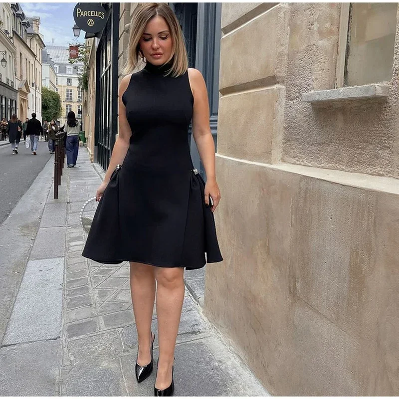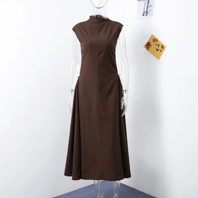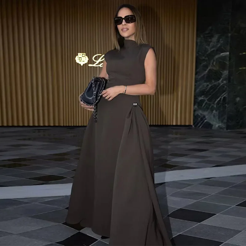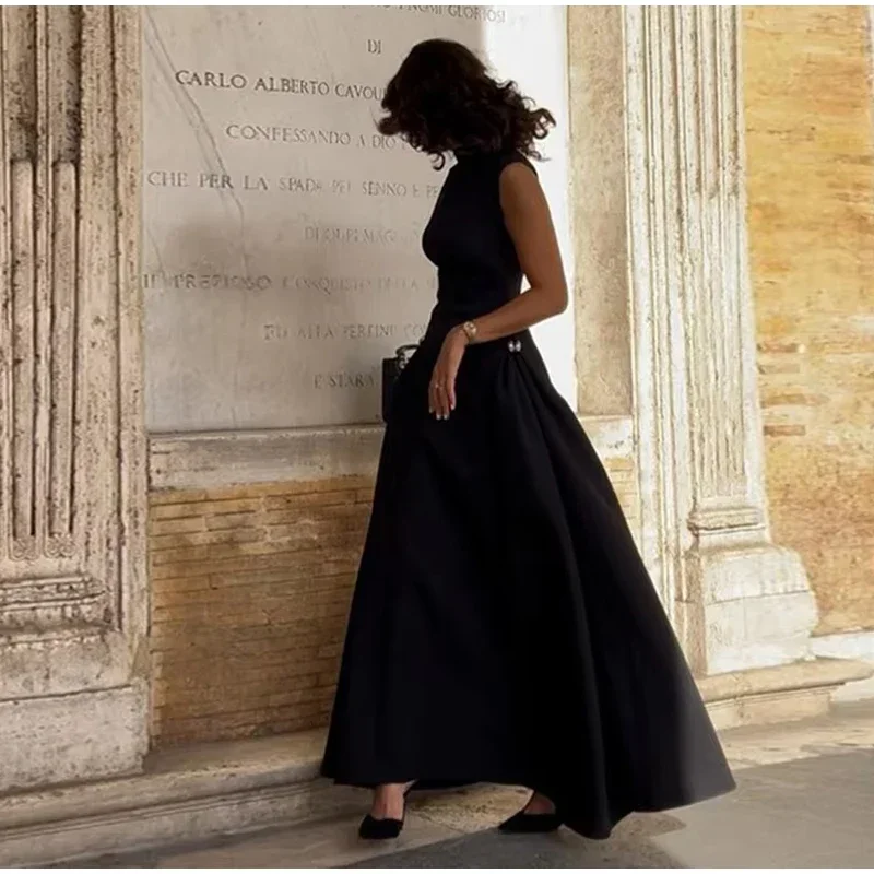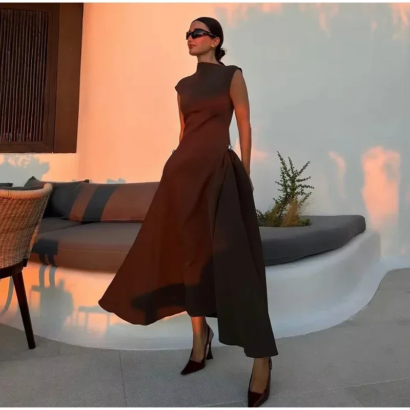 Elegant Black Long Dress Women Fashion High Collor Sleeveless Pleat Irregular Dresses 2025 Spring Summer Party Lady Evening Robe