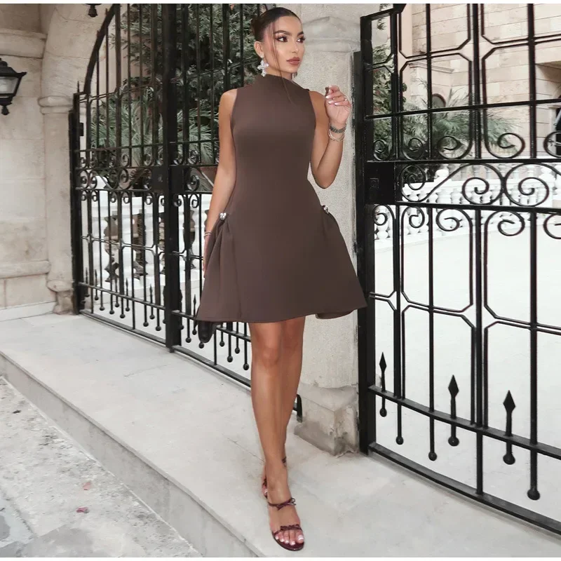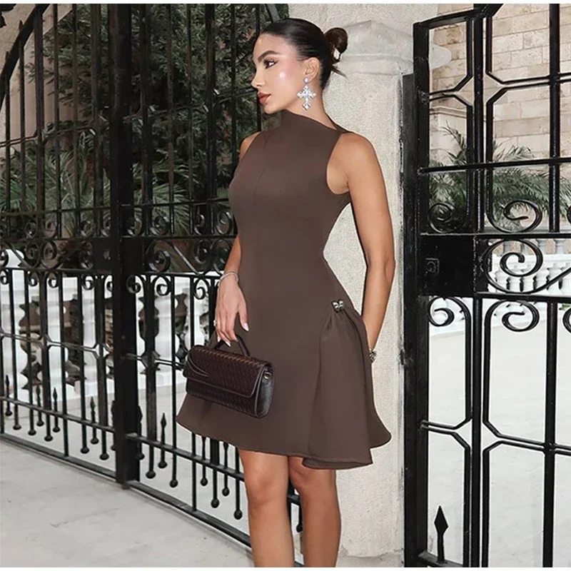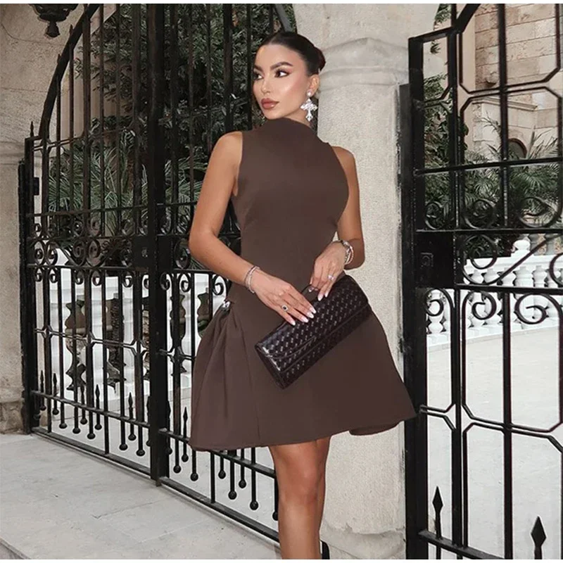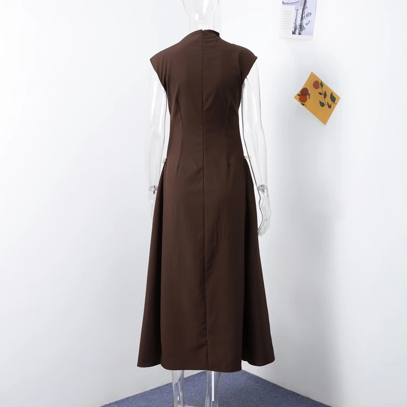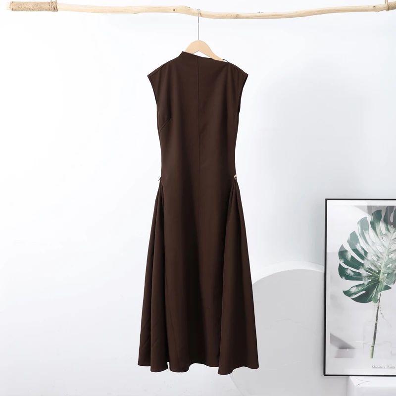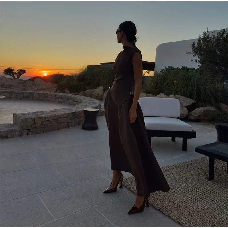 Elegant Black Long Dress Women Fashion High Collor Sleeveless Pleat Irregular Dresses 2025 Spring Summer Party Lady Evening Robe