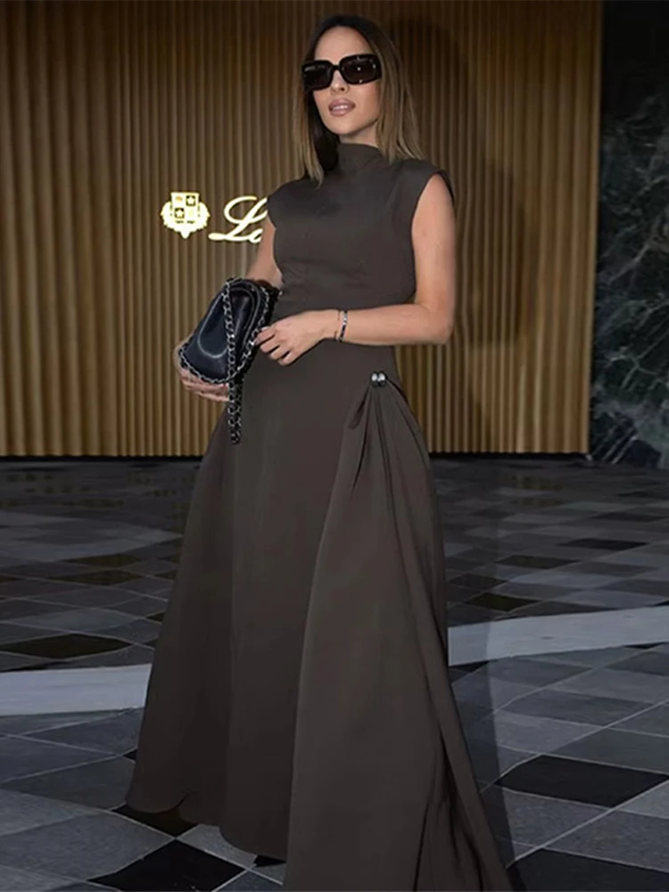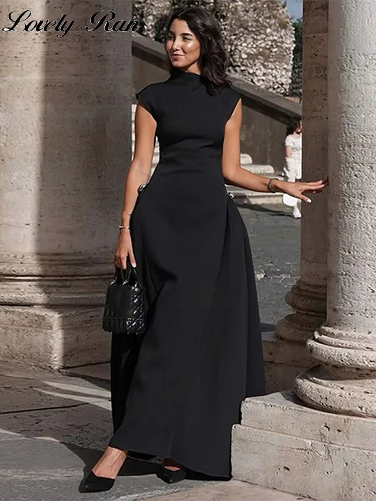 Elegant Black Long Dress Women Fashion High Collor Sleeveless Pleat Irregular Dresses 2025 Spring Summer Party Lady Evening Robe
