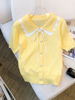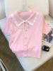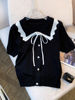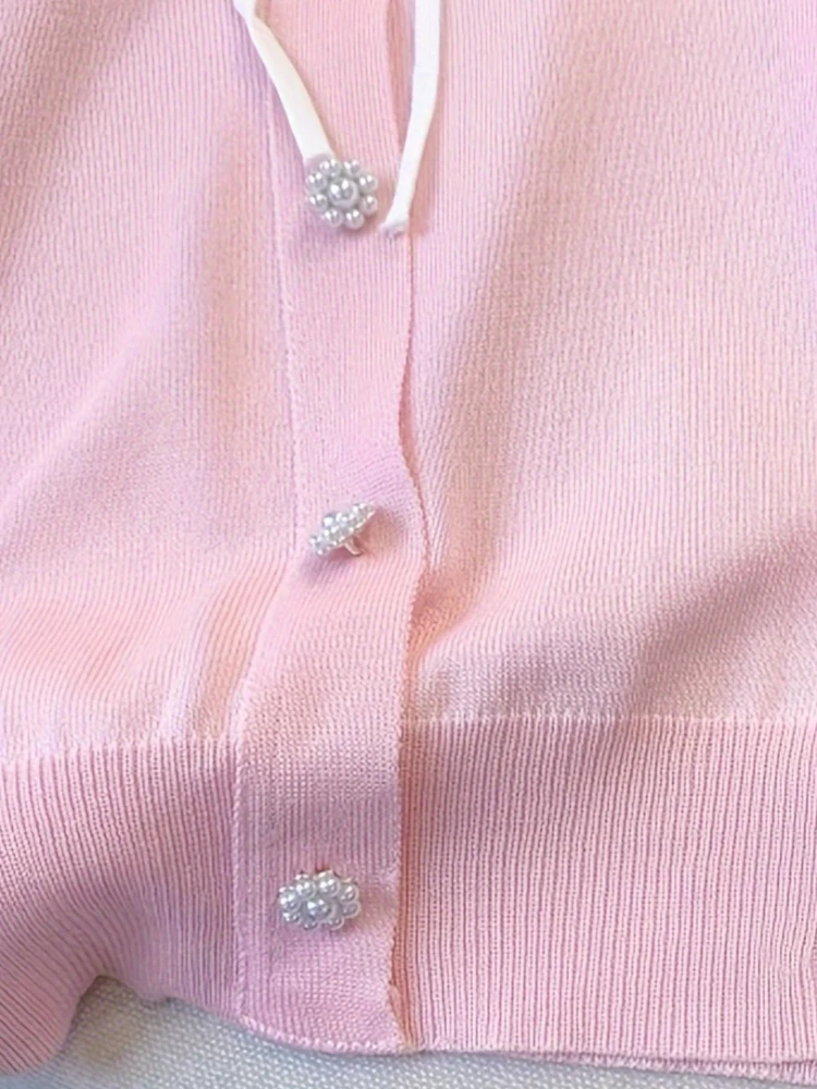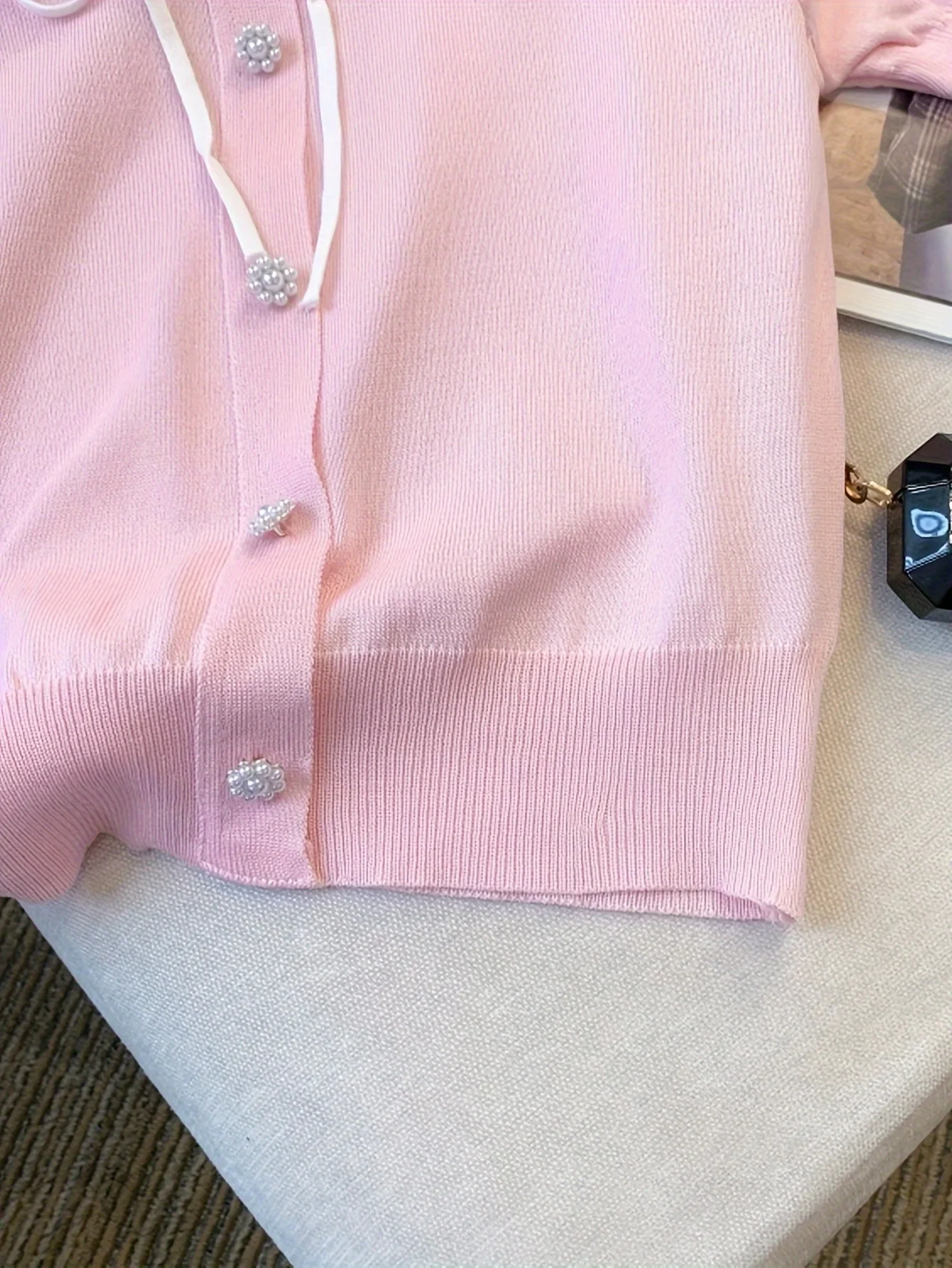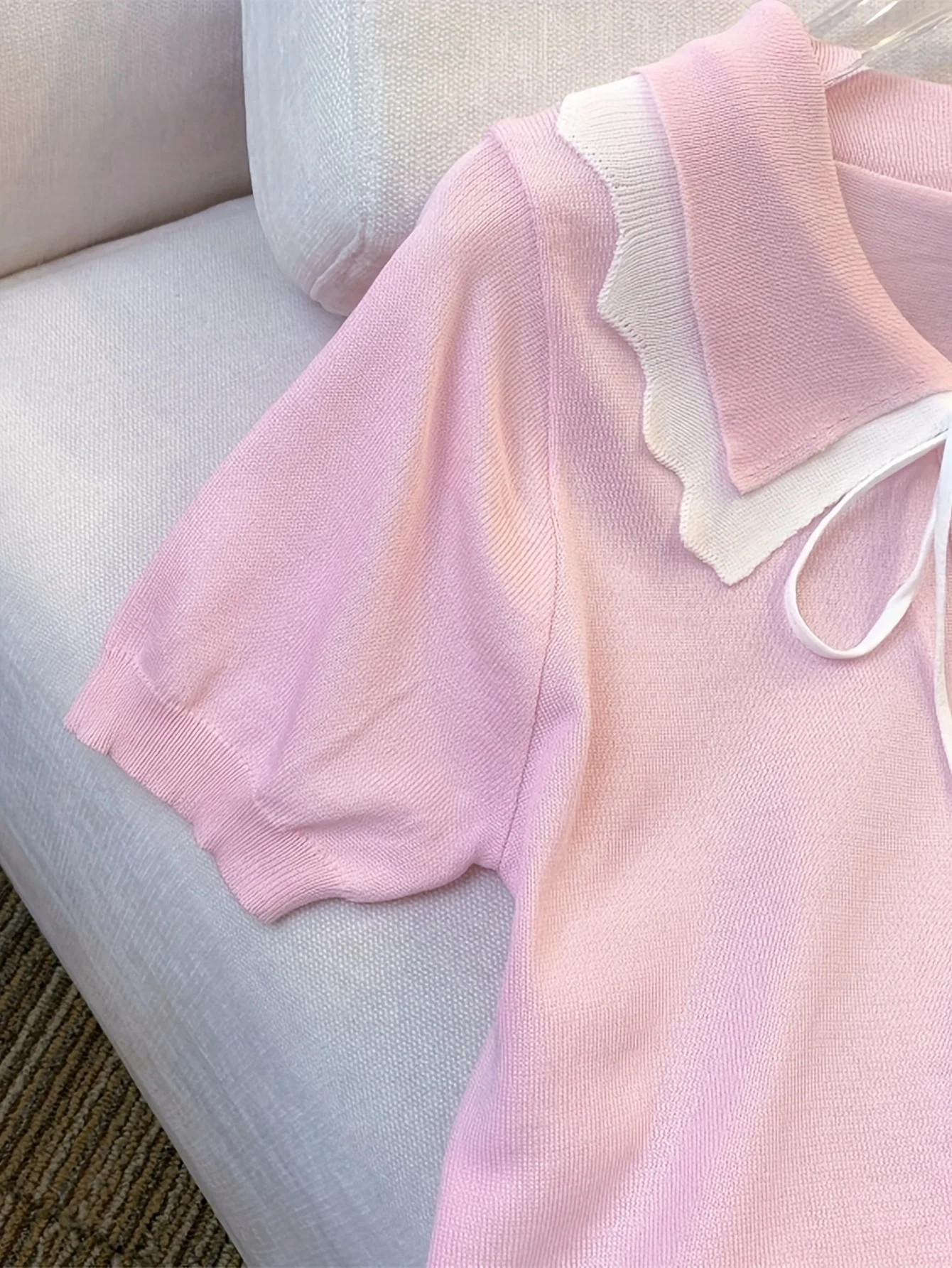 Elegant Short Sleeve Sweater with Lace Up Contrast Trim – Women’s Clothing