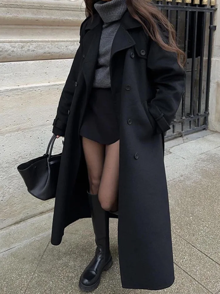 Elegant With Belt Black Long Coat For Women Oversize Woolen Double Button Lapel Overcoat Autumn New Lady High Street Outerwear