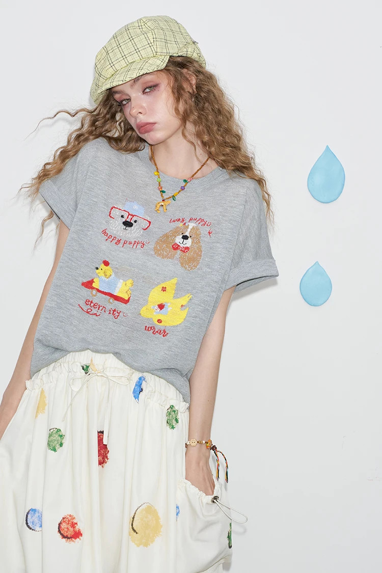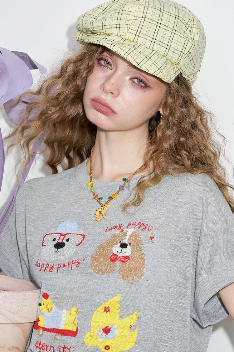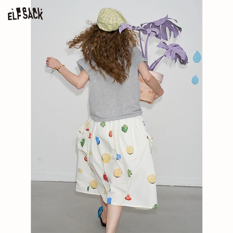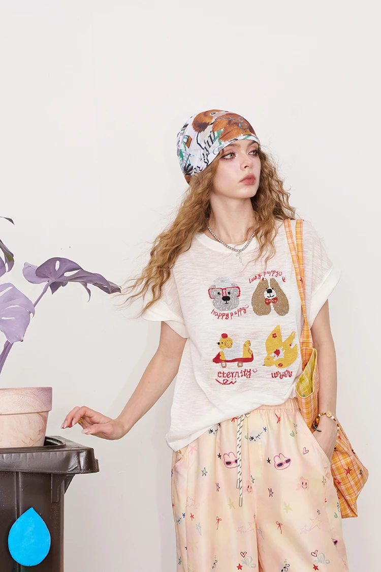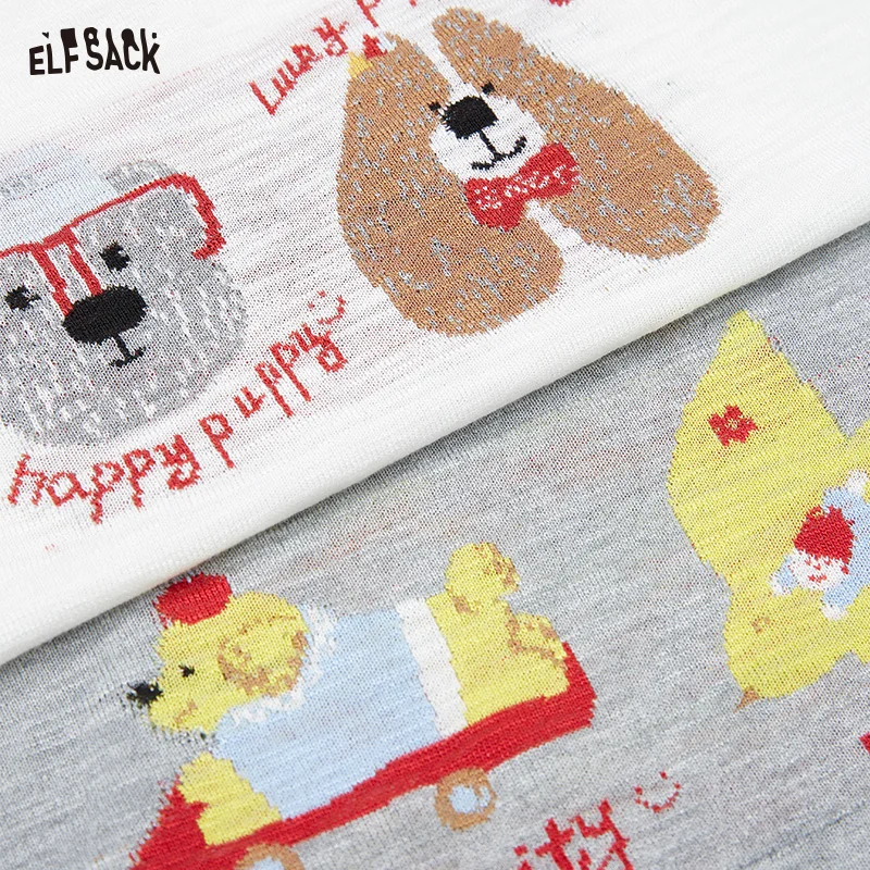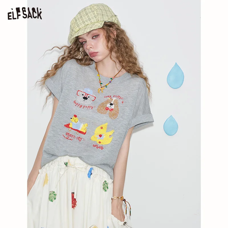 ELFSACK 2025 Summer New Arrival Loose Casual White Cute Puppy Y2K Short Sleeve knitwears Sweater For Woman