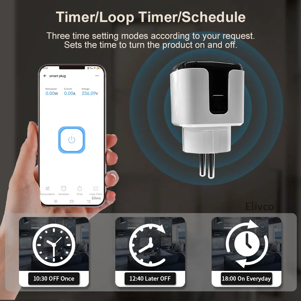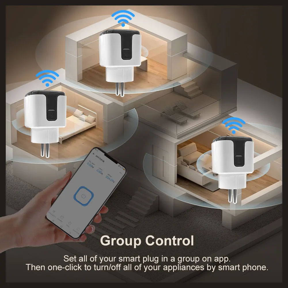It has a scene setting function. You can choose a suitable scene to run the appliances by start the mode, such as home mode, temperature and humidity or other conditions. For example, if you go home and open the door, you can set the light which connect the power to this smart power plug on and then the camera off.