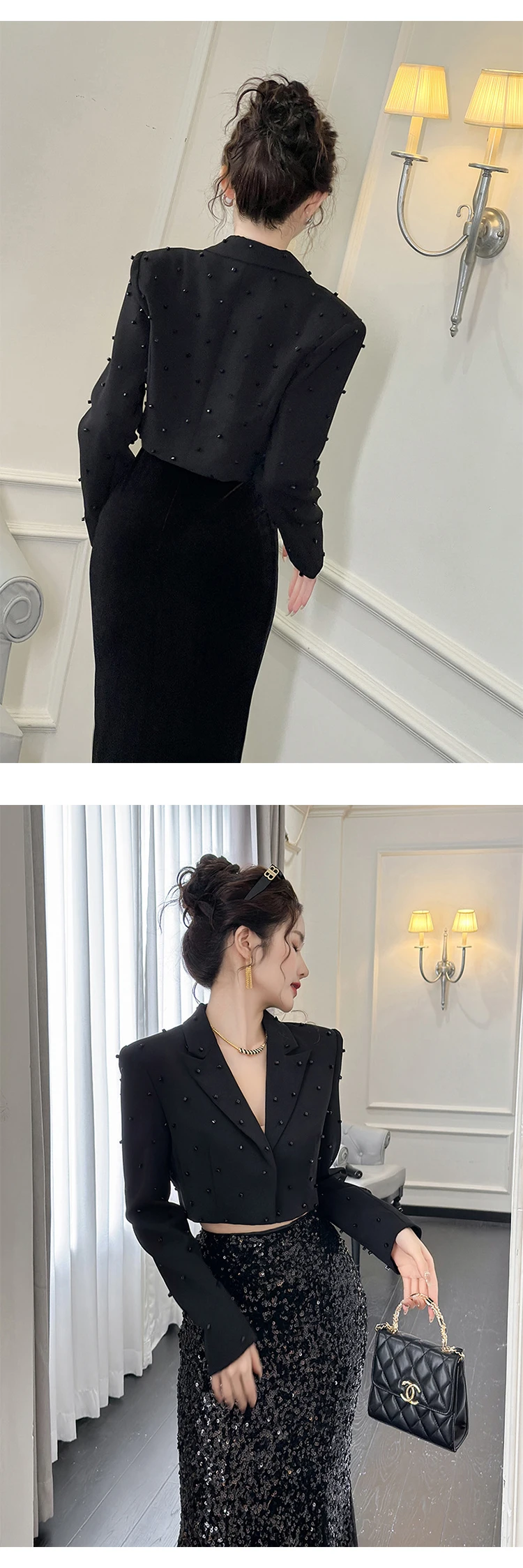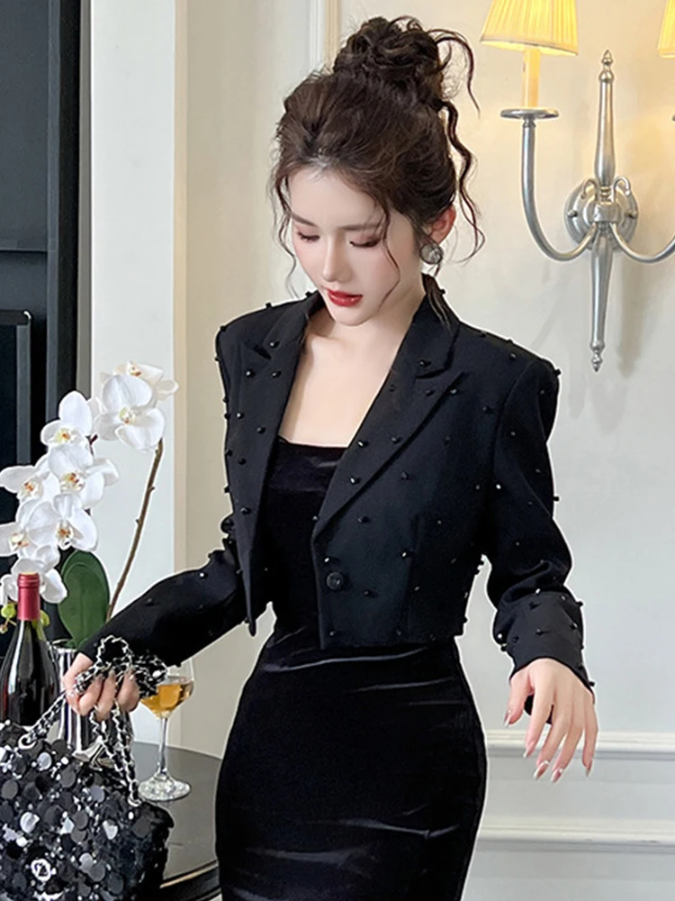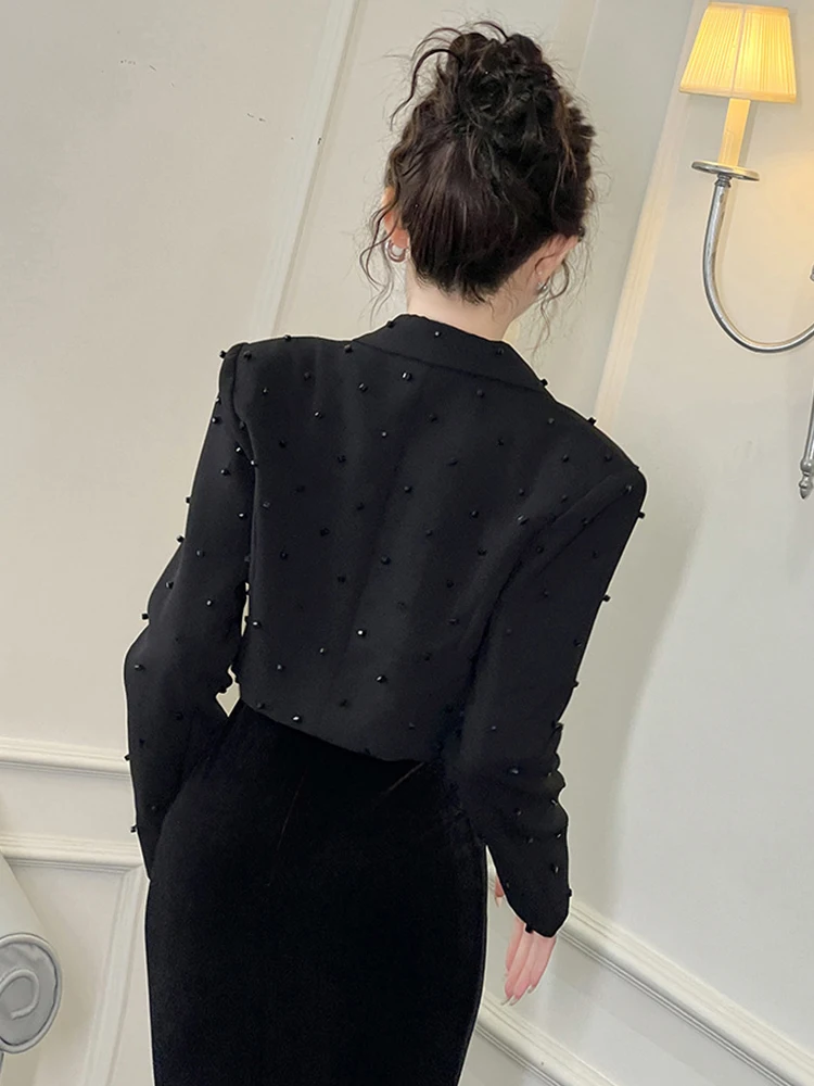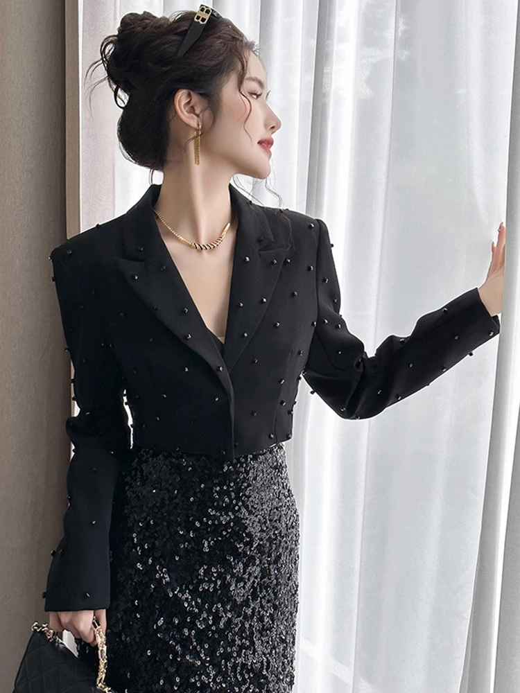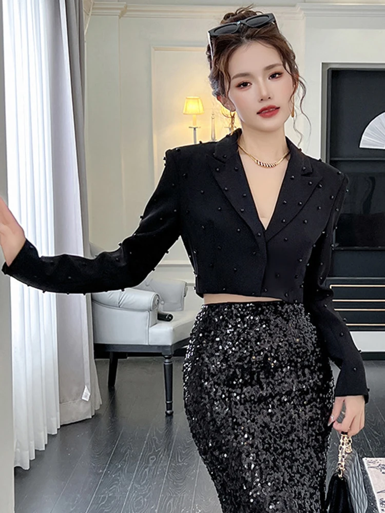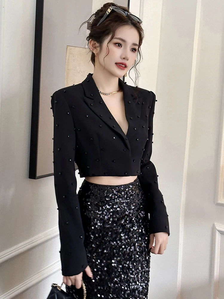 Fashion Chic Women’s Blazer Office Lady Bright Black Long Sleeve Short Casual Party Coat Ladies Outerwear Stylish Cropped Tops