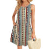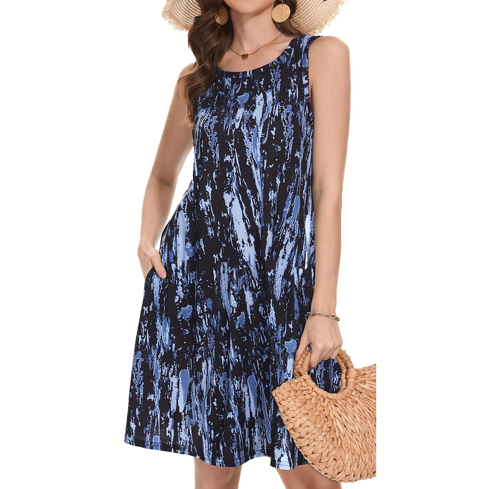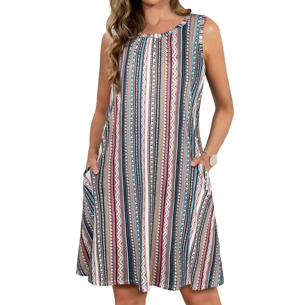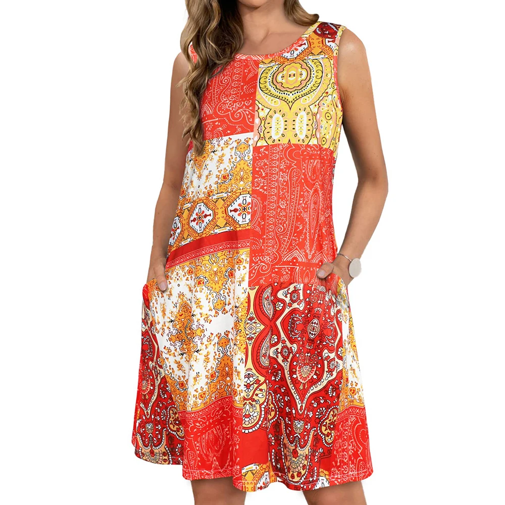 Fashion Women Casual Knee-length Dress Elegant Bohemian Style Skirt Pockets Sleeveless Simple Versatile Female Clothing Summer