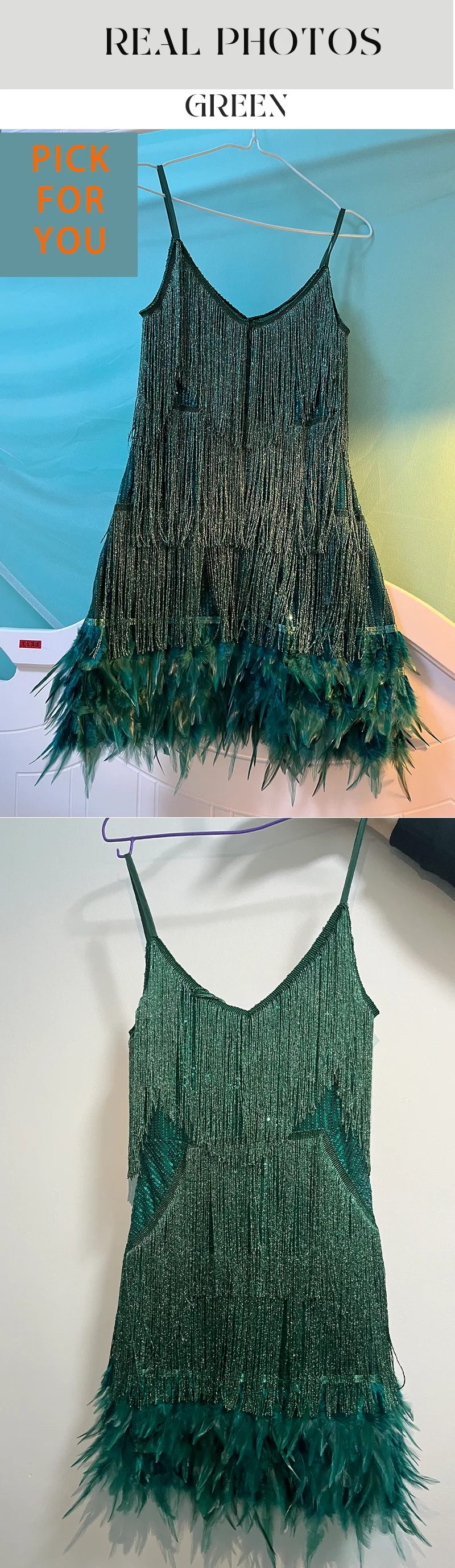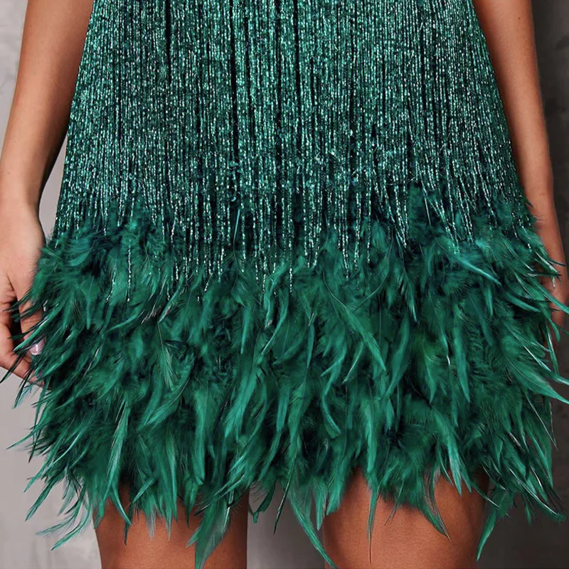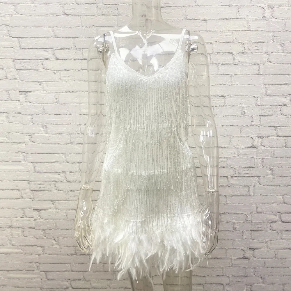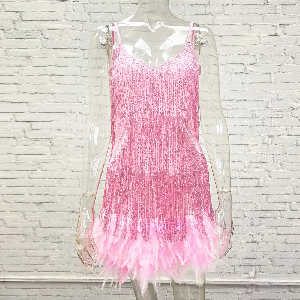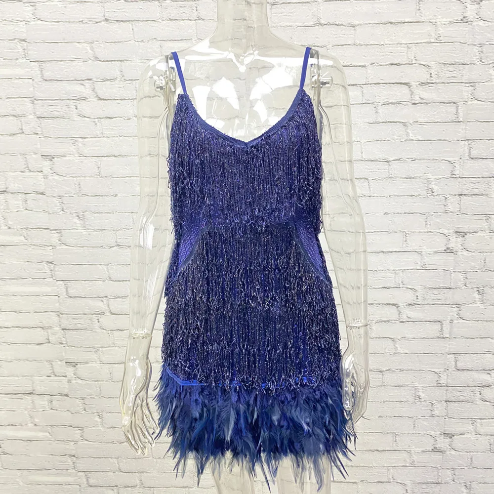 Fashionable Tassel Sequins Multicolor Birthday Party Sexy V-neck Strap Feather Splicing Dress