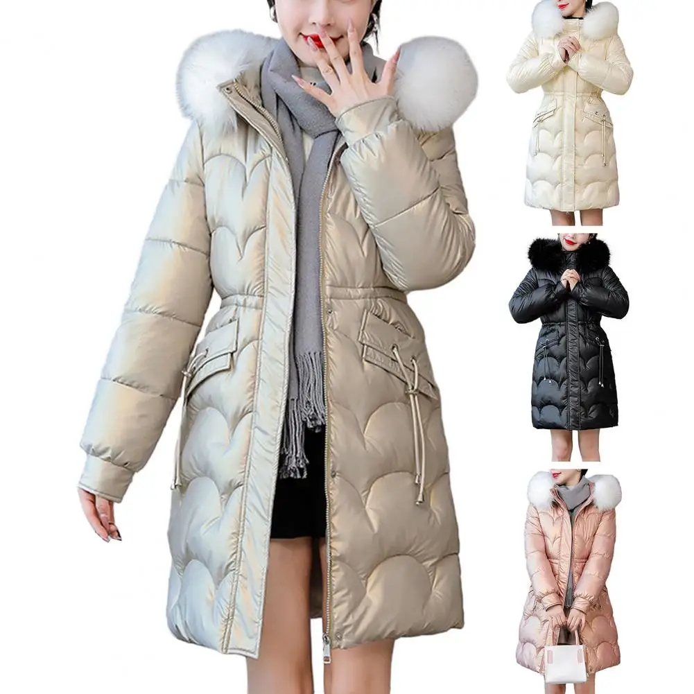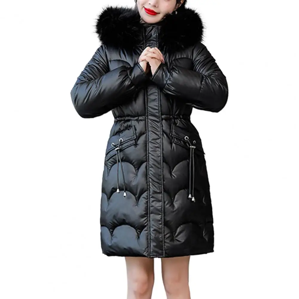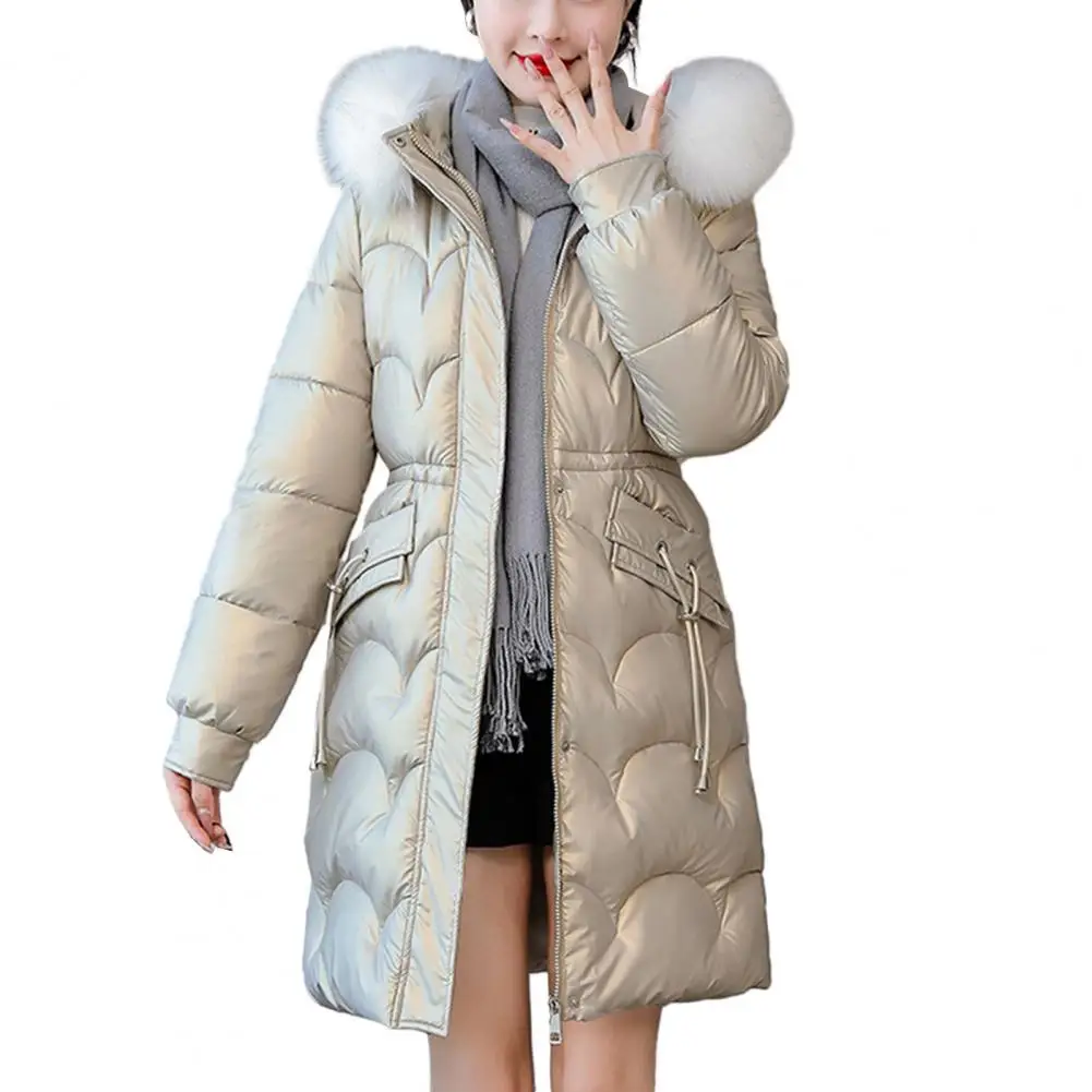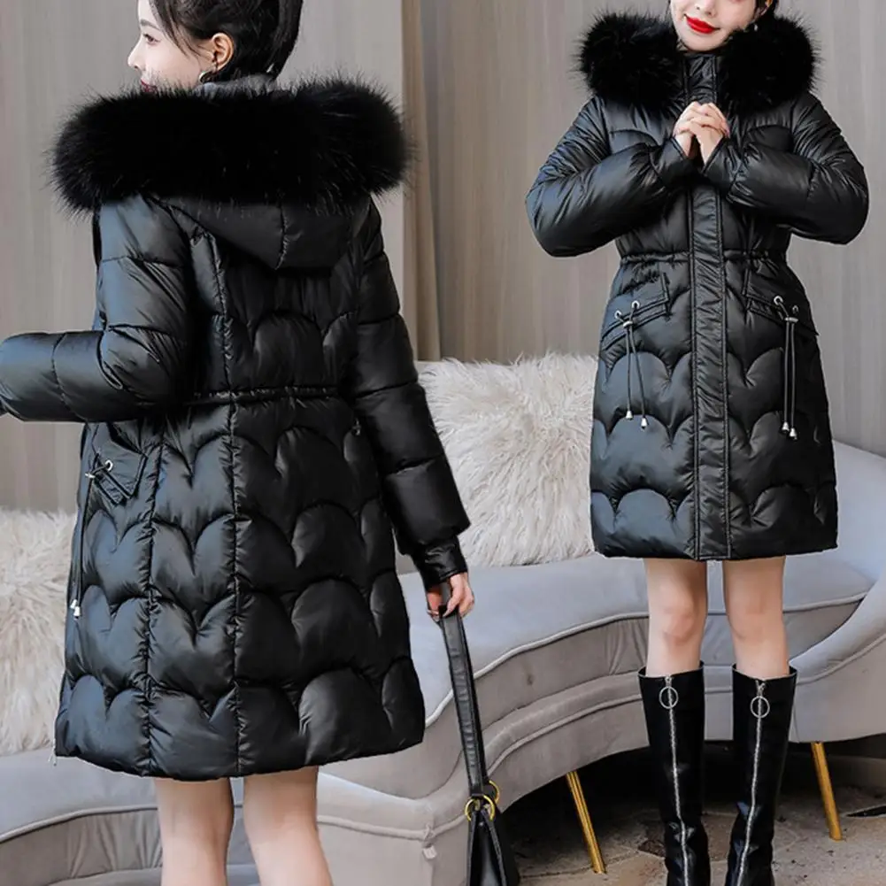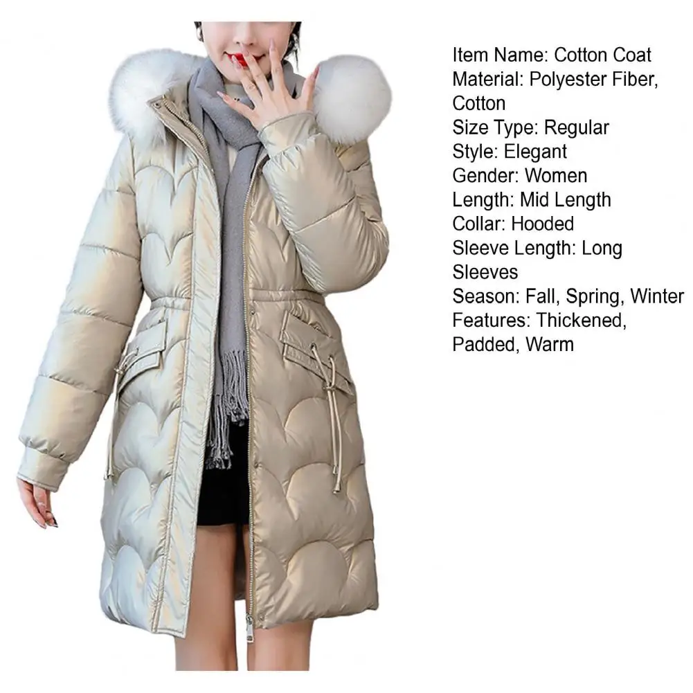Women Winter Cotton Coat Thickened Padded Faux Fur Hood Smooth Slim Fit Heat Retention Windproof Mid Length Hooded Long Sleeve Zipper Closure Pockets Down Coat
