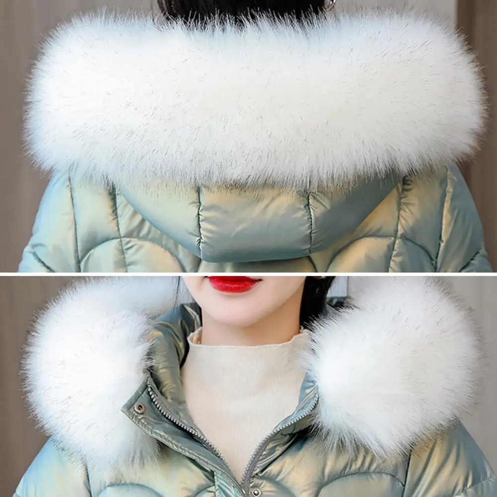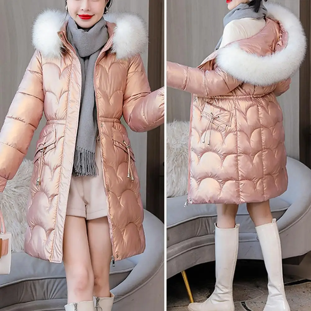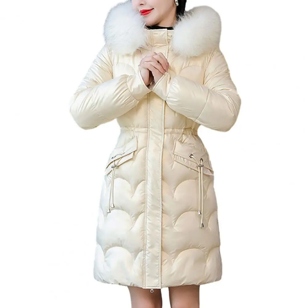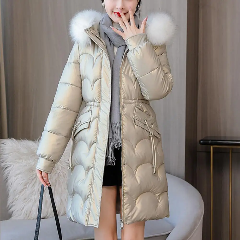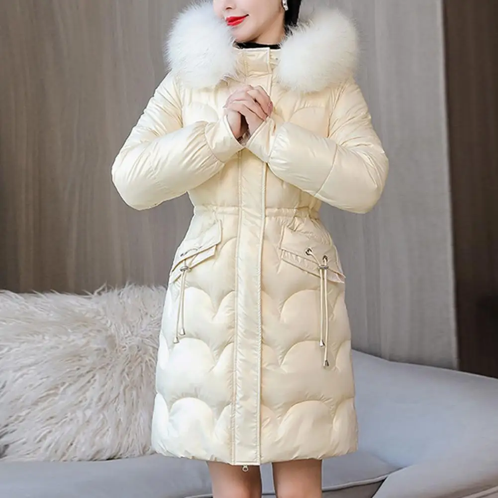 Women Winter Cotton Coat Thickened Padded Faux Fur Hood Smooth Slim Fit Heat Retention Windproof Mid Length Hooded Long Sleeve Zipper Closure Pockets Down Coat
