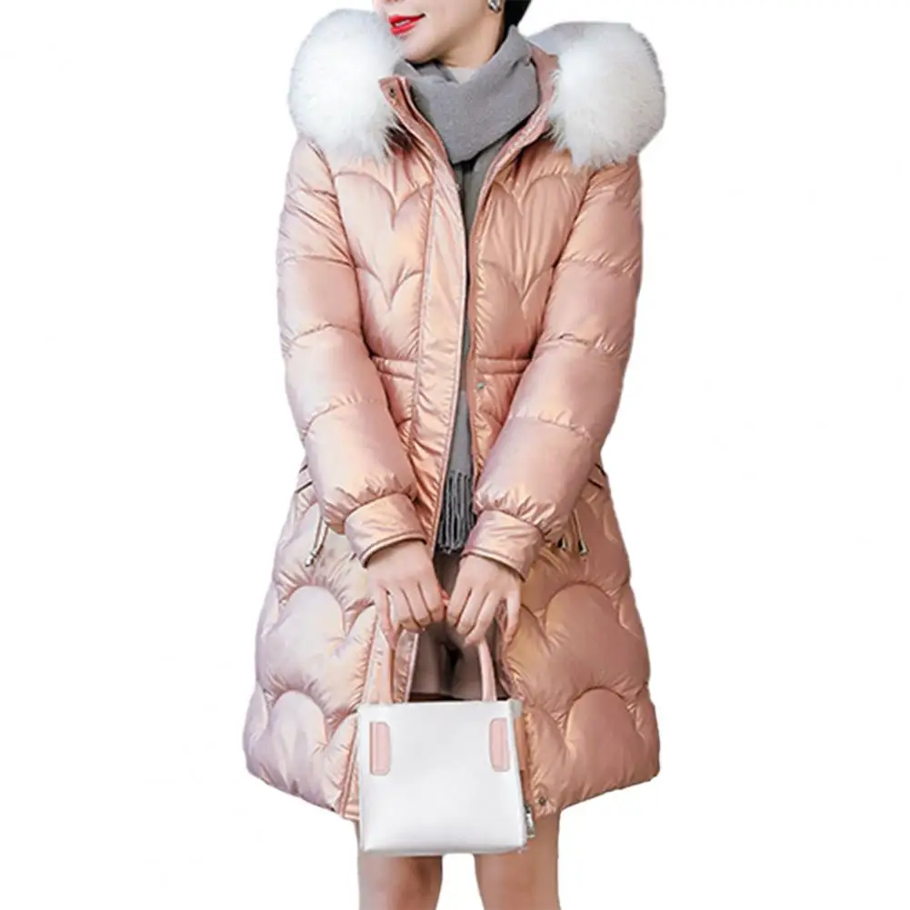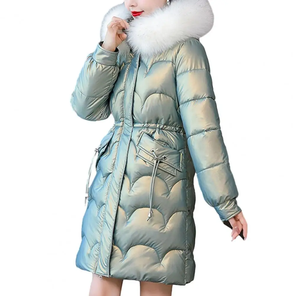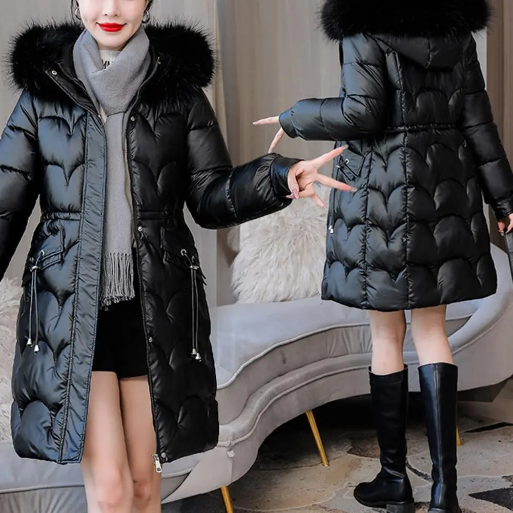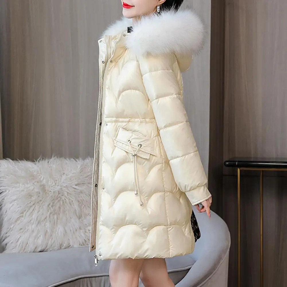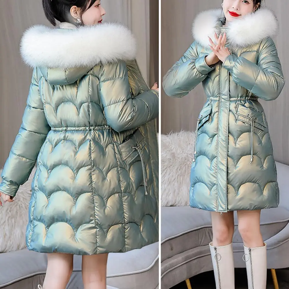 Women Winter Cotton Coat Thickened Padded Faux Fur Hood Smooth Slim Fit Heat Retention Windproof Mid Length Hooded Long Sleeve Zipper Closure Pockets Down Coat