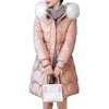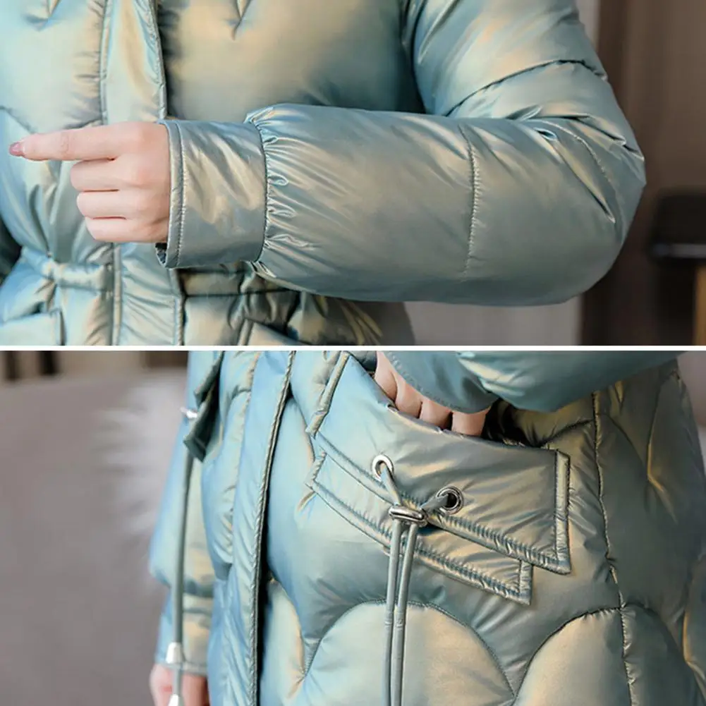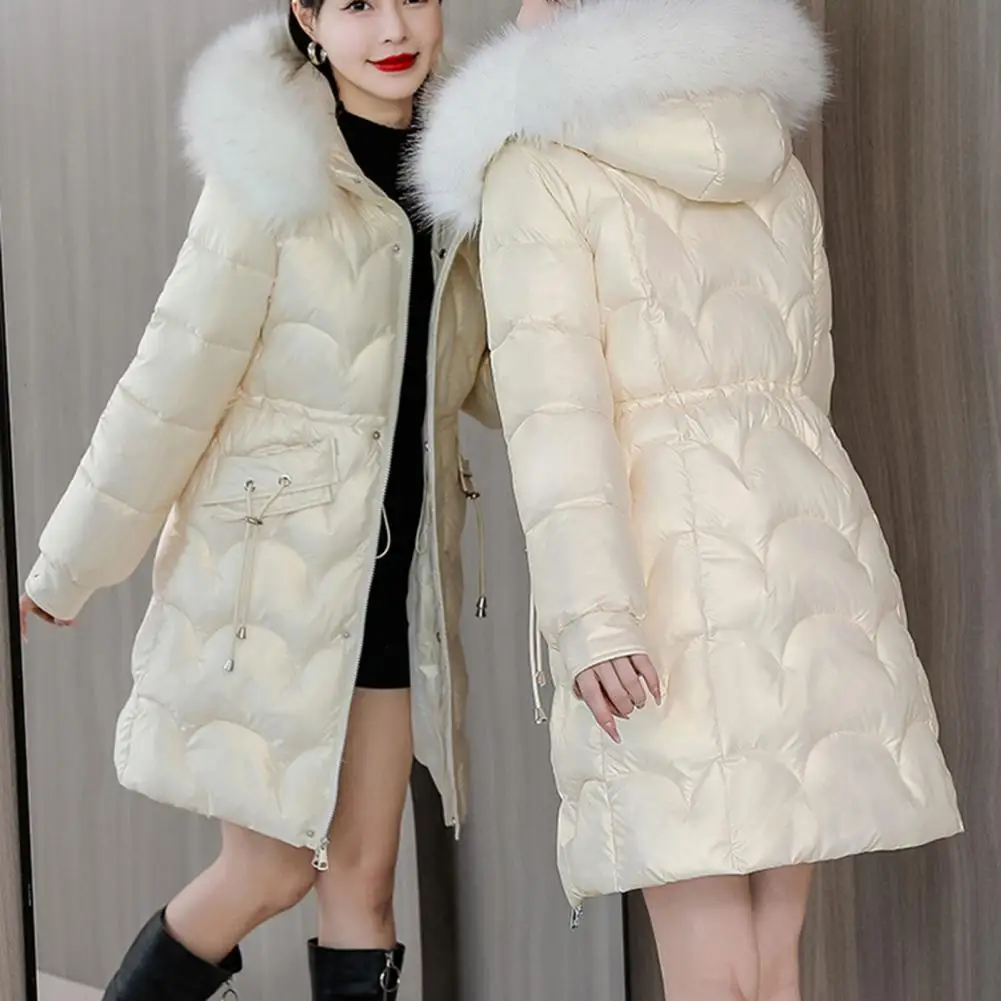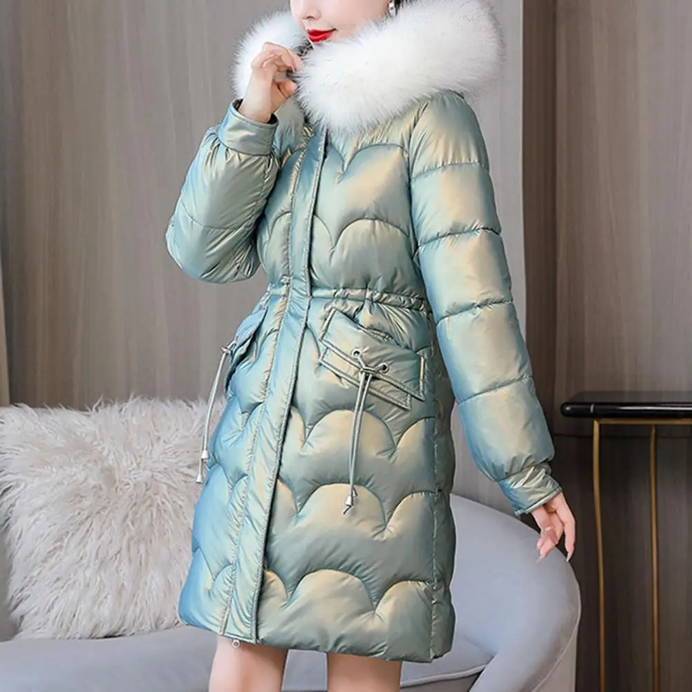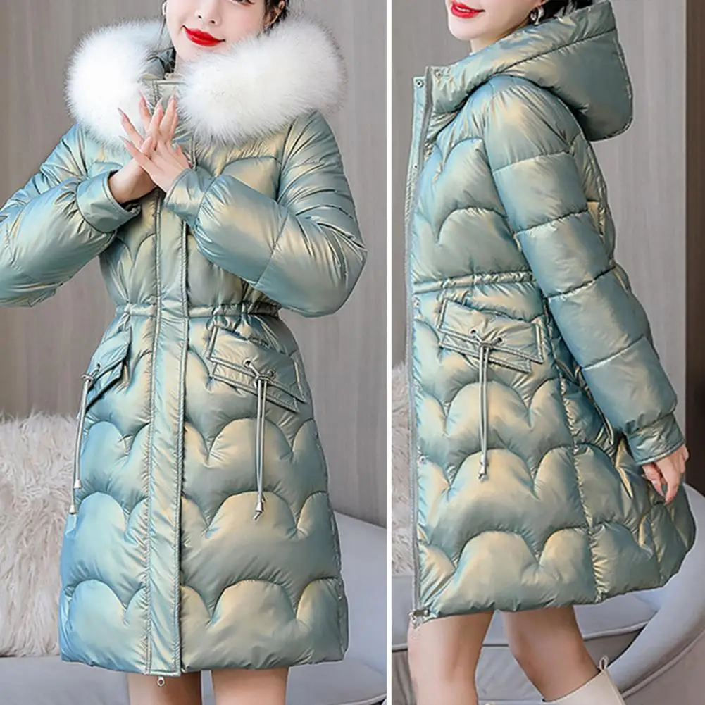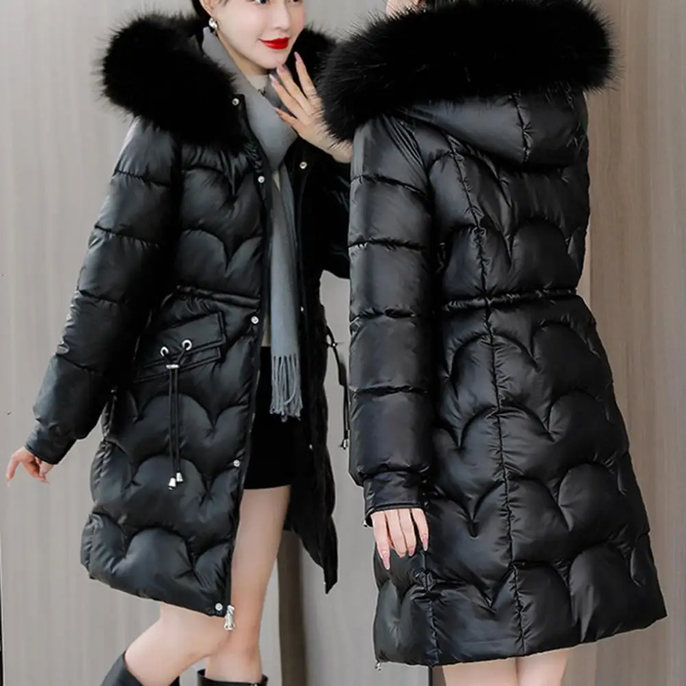 Women Winter Cotton Coat Thickened Padded Faux Fur Hood Smooth Slim Fit Heat Retention Windproof Mid Length Hooded Long Sleeve Zipper Closure Pockets Down Coat