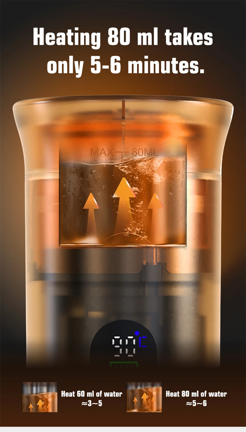 【Stainless steel 80 ML graduated water tank】: Food grade stainless steel water tank is marked with 40ml and80ml scales, with a maximum water tank capacity of90ml.