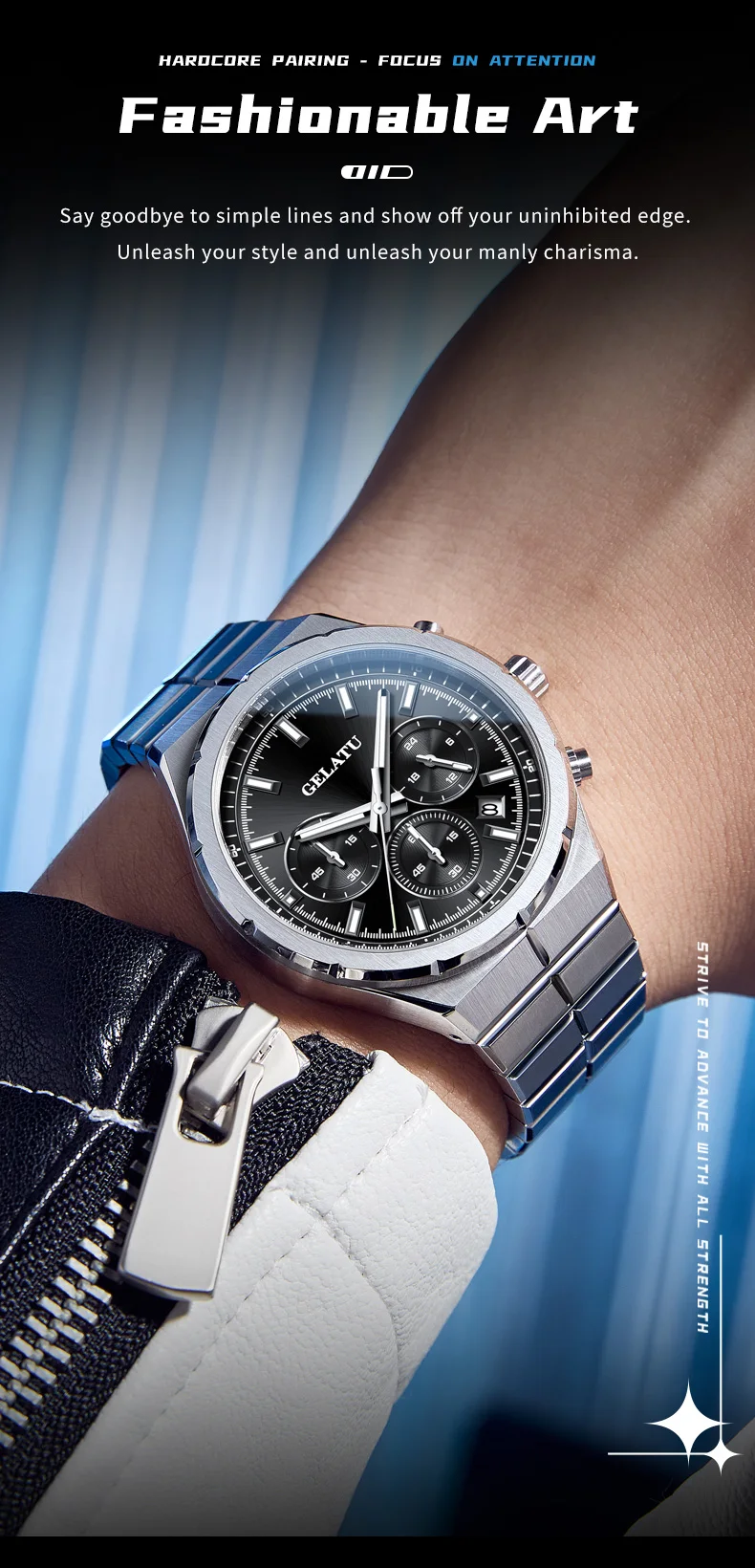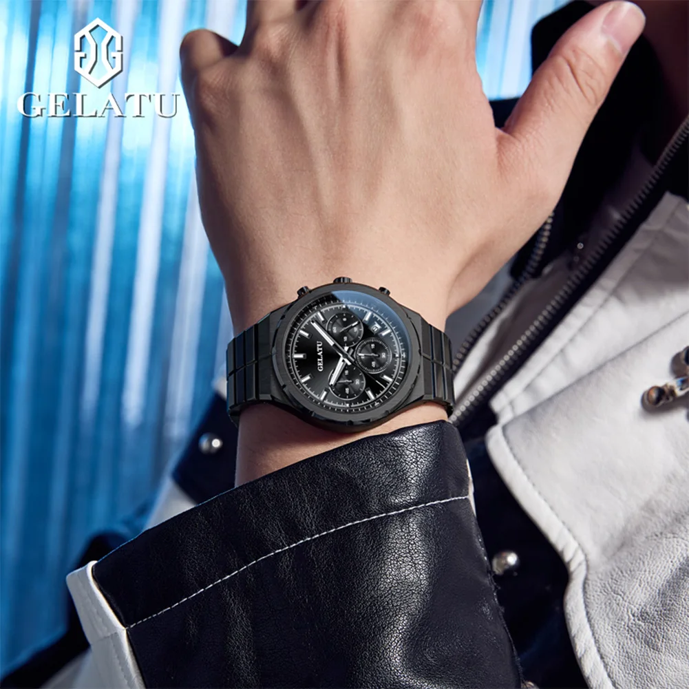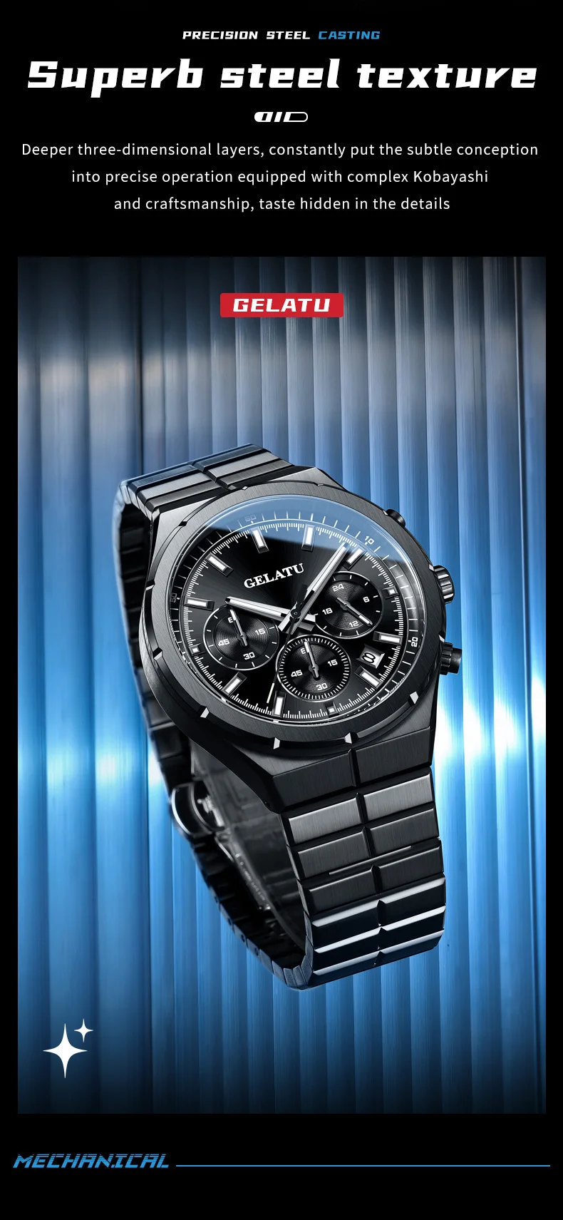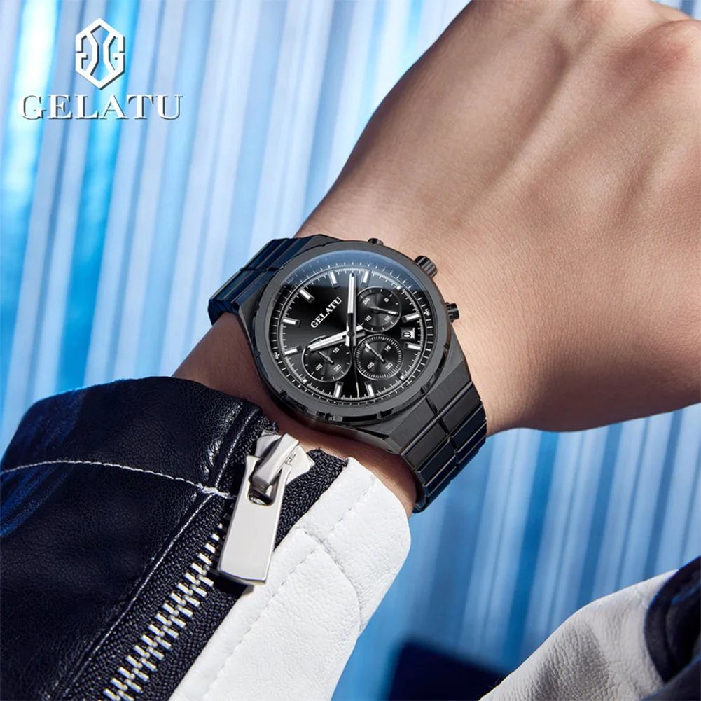 GELATU 8001 Quartz Watch Man Top Brand Steel Strap Chronograph Watch For Men Calendar Waterproof Luminous Fashion Wristwatch