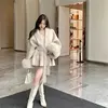 High-End Splicing Short Furry Sleeves Blend Wool Coats with Lace-u Strap Woolen Jacket with Spring and Autumn Long Sleeves Loose