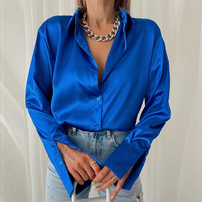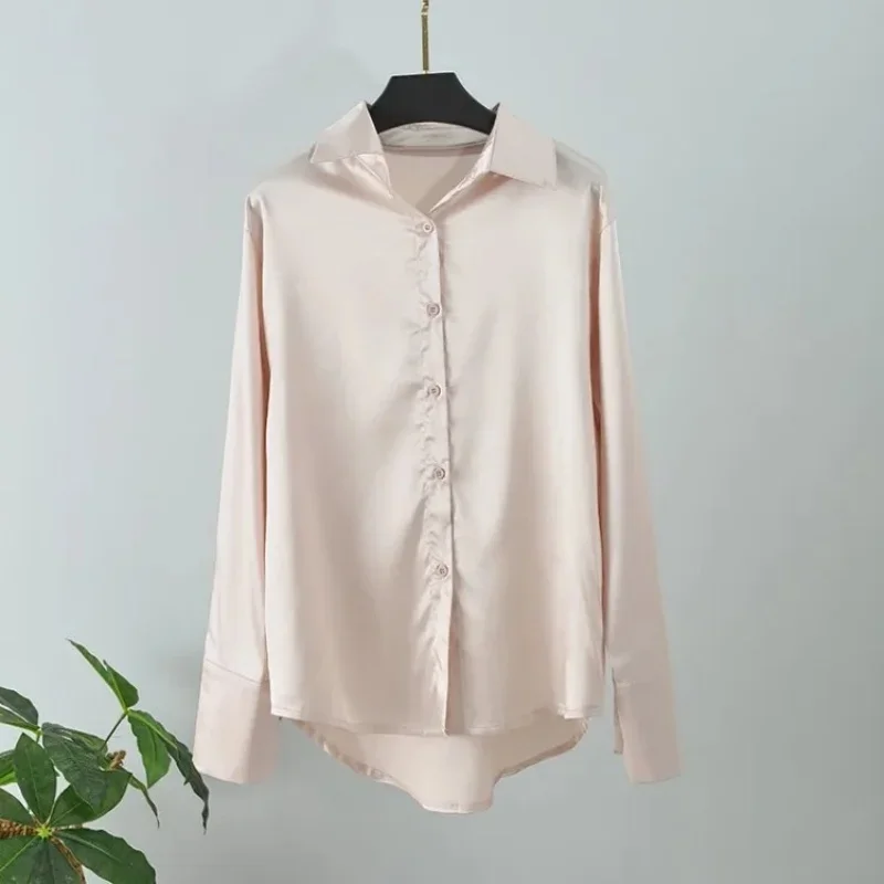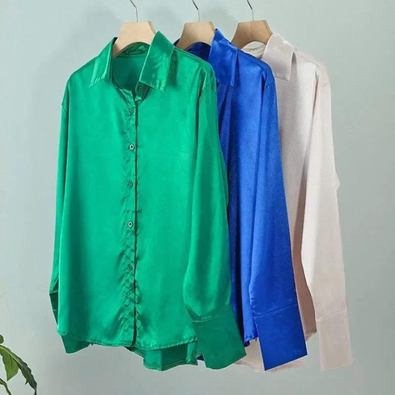 High Quality in Stock Elegant Satin Long Sleeve Women Shirt Vintage Silk Casual Loose Button Up Blouses Office Lady Tops