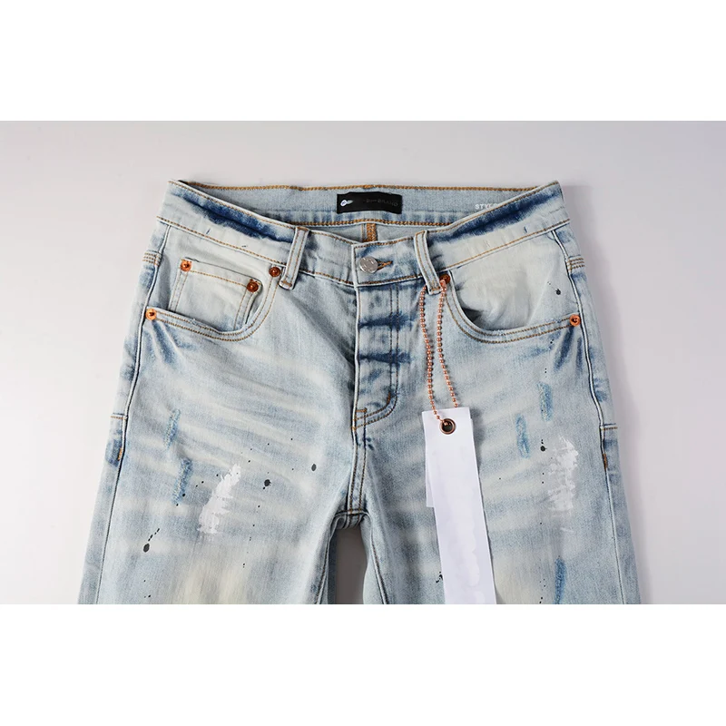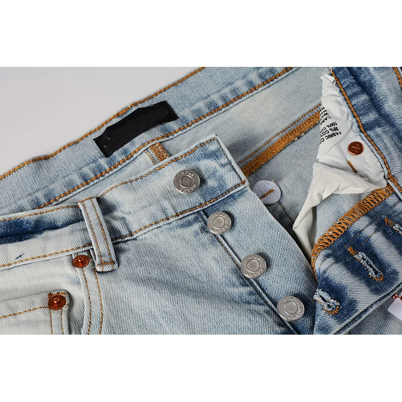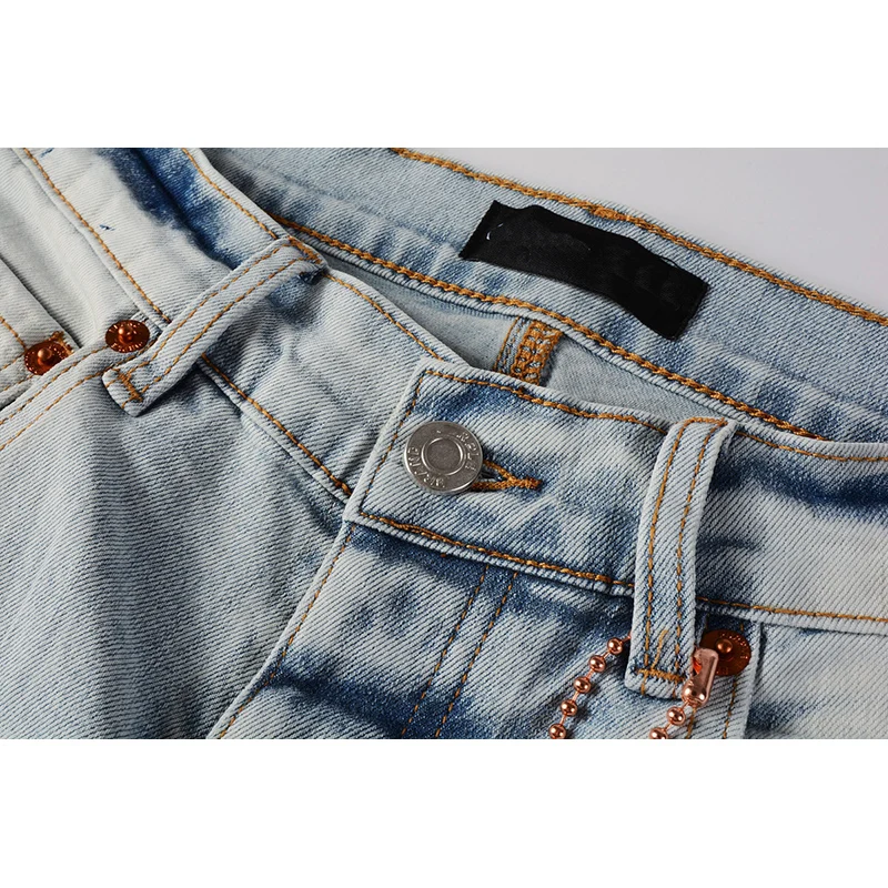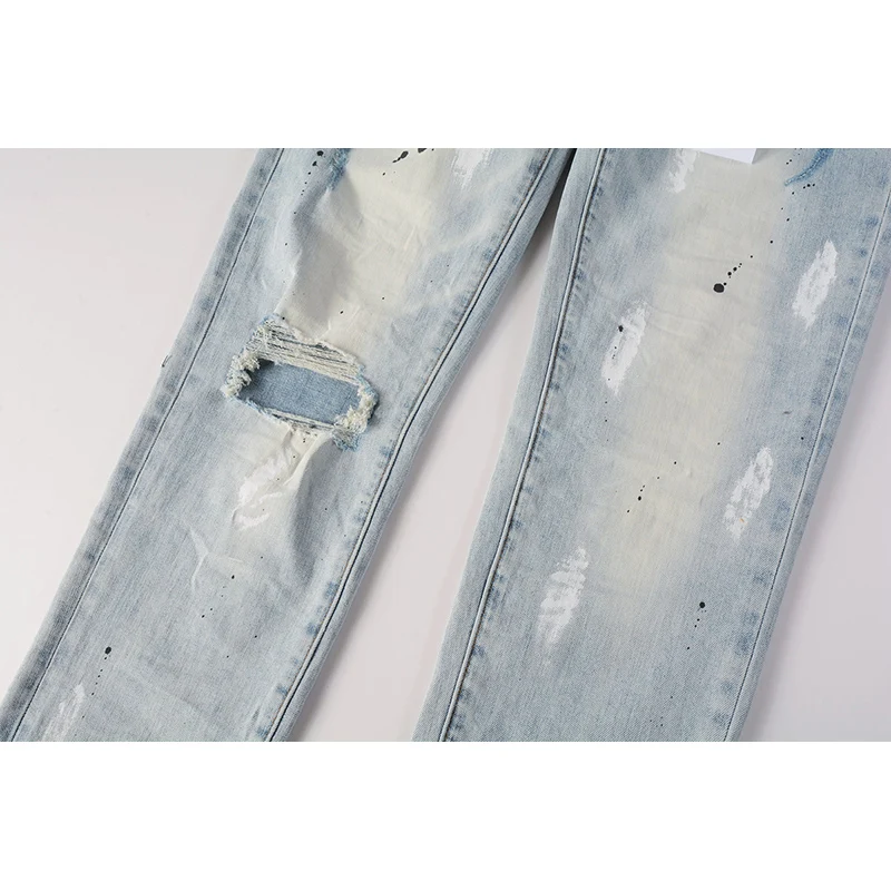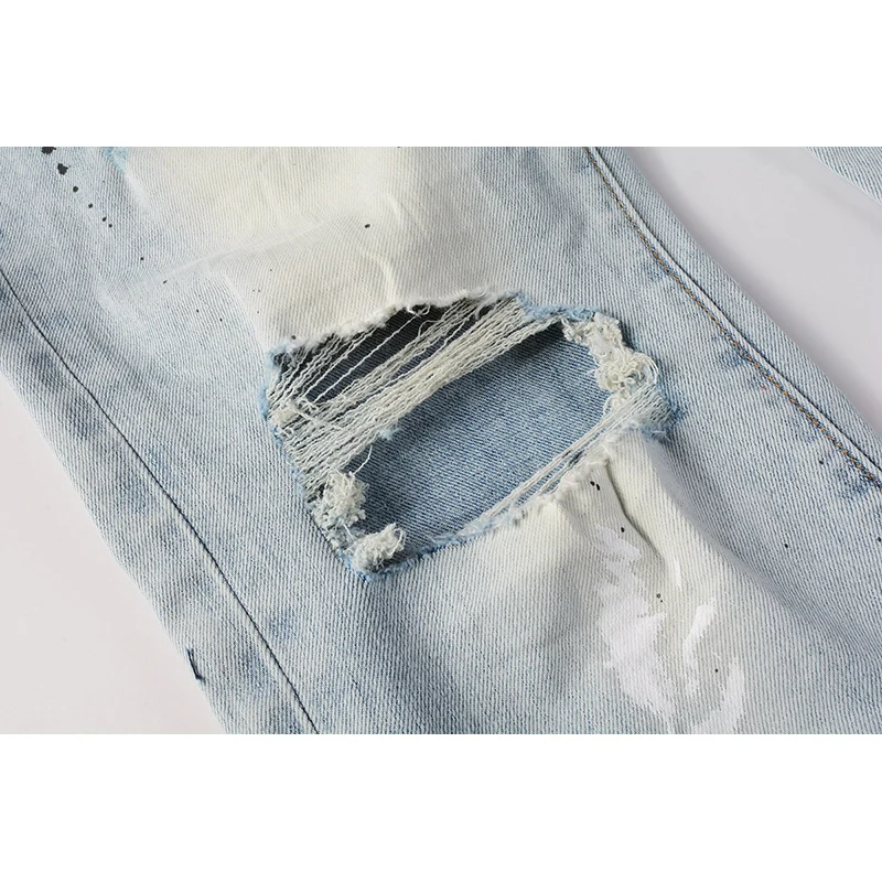 High Street Men’s Washed Light Blue Distressed Damaged Holes Skinny Ripped Button Fly Jeans Pants