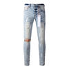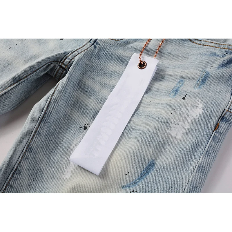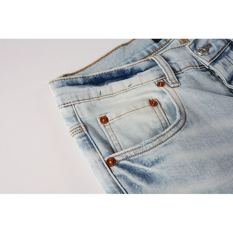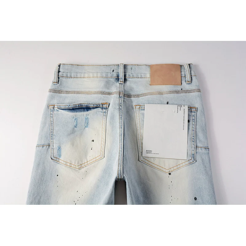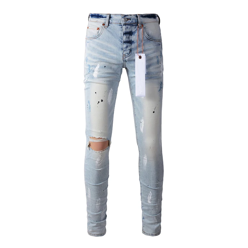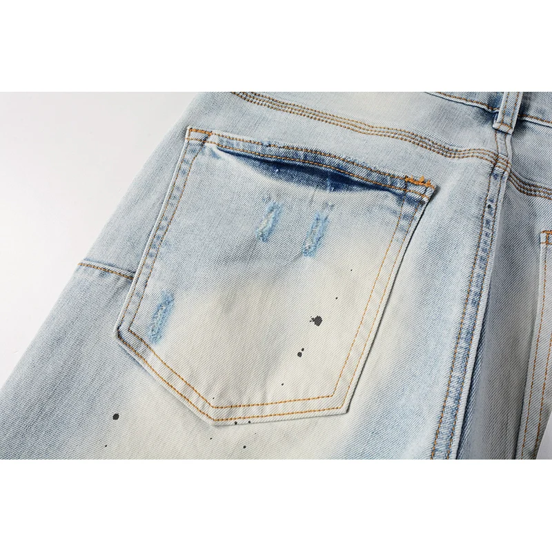 High Street Men’s Washed Light Blue Distressed Damaged Holes Skinny Ripped Button Fly Jeans Pants