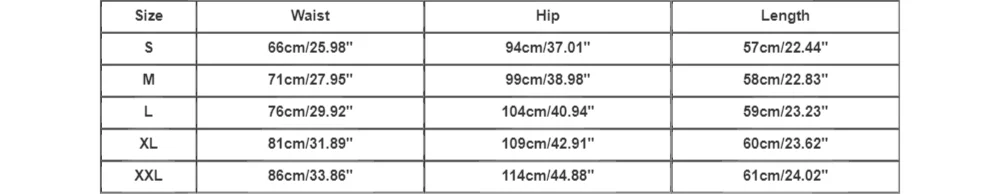 | Size:XXL | Waist:86cm/33.86” | Hip:114cm/44.88” | Length:61cm/24.02” |