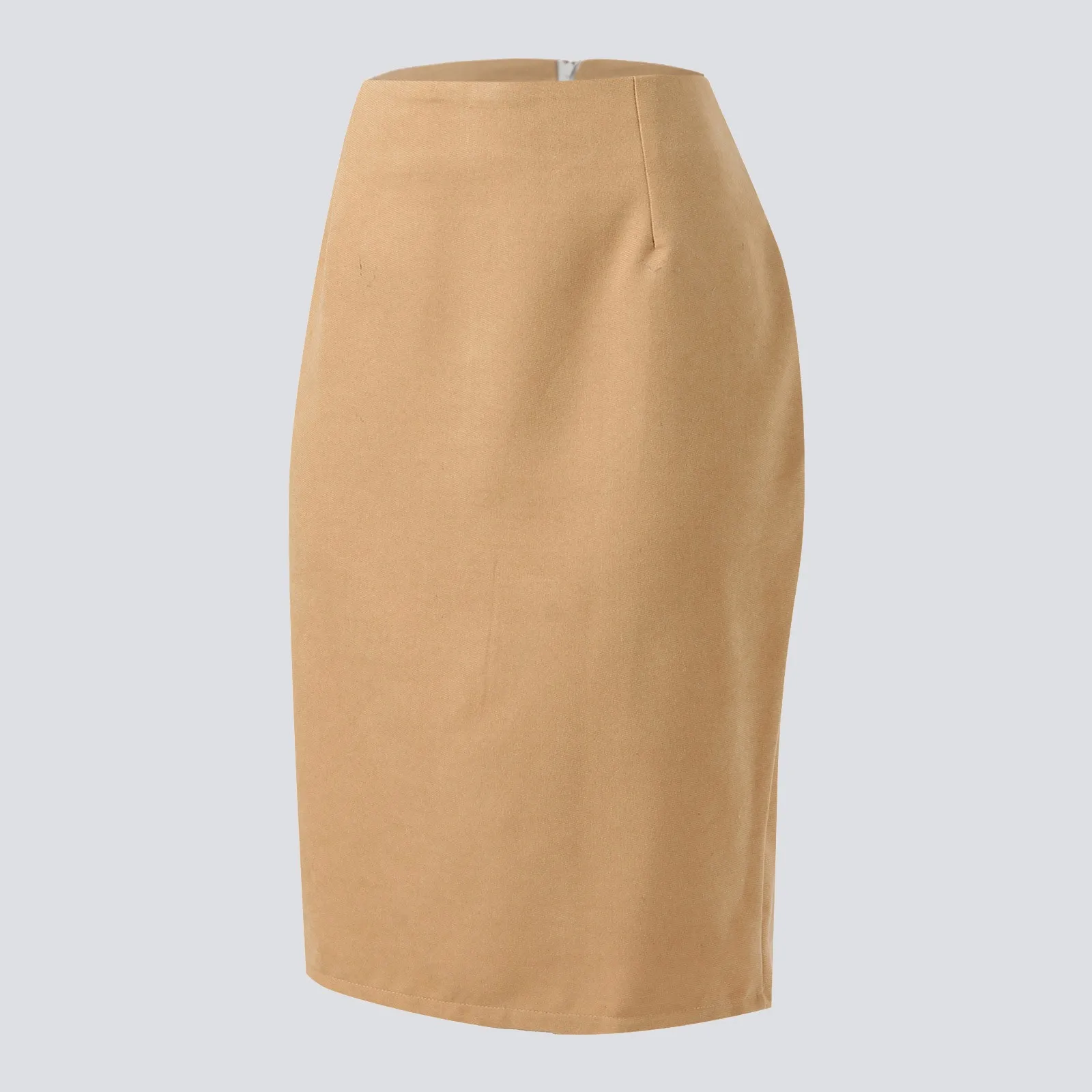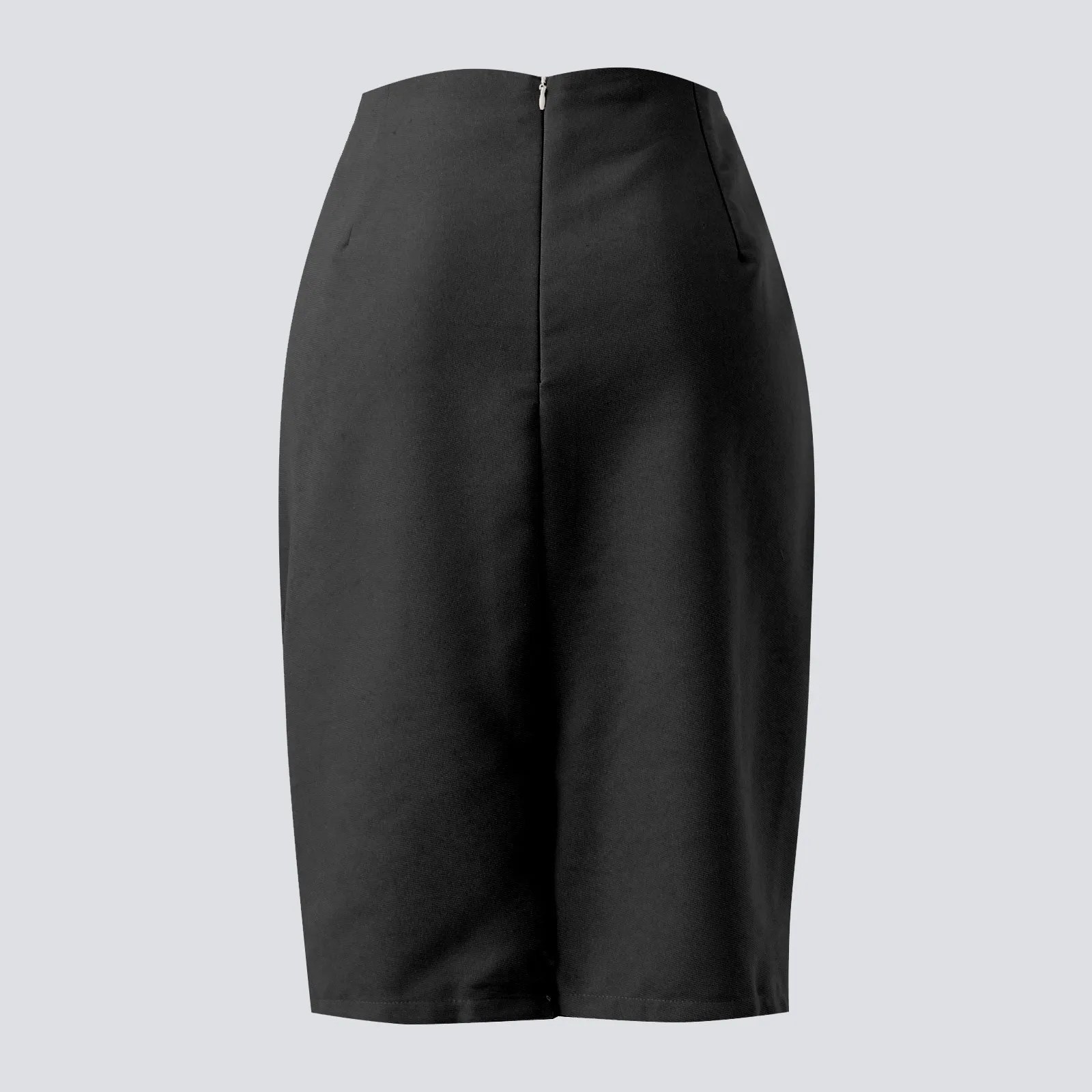 Features: High waist, side zipper fly closure, knee length, back slit design