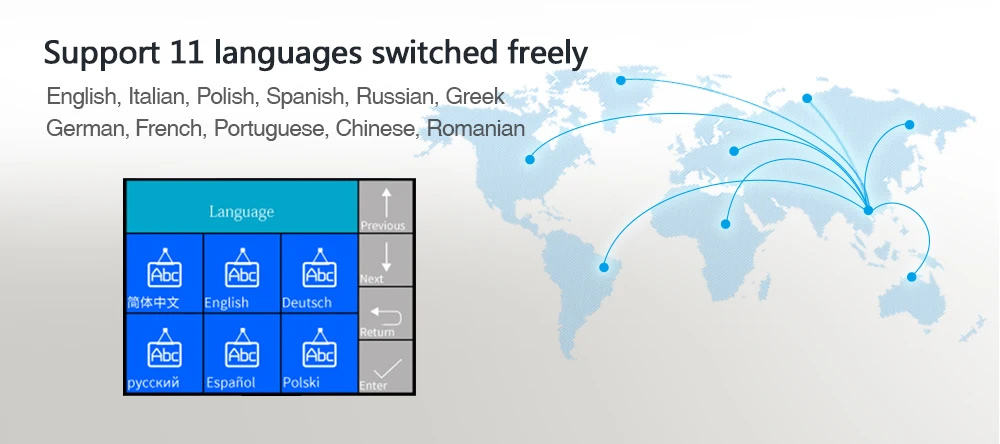 English, Chinese, German, Italian, Spanish, Russian,Polish, Greek,Romanian,French and Portuguese