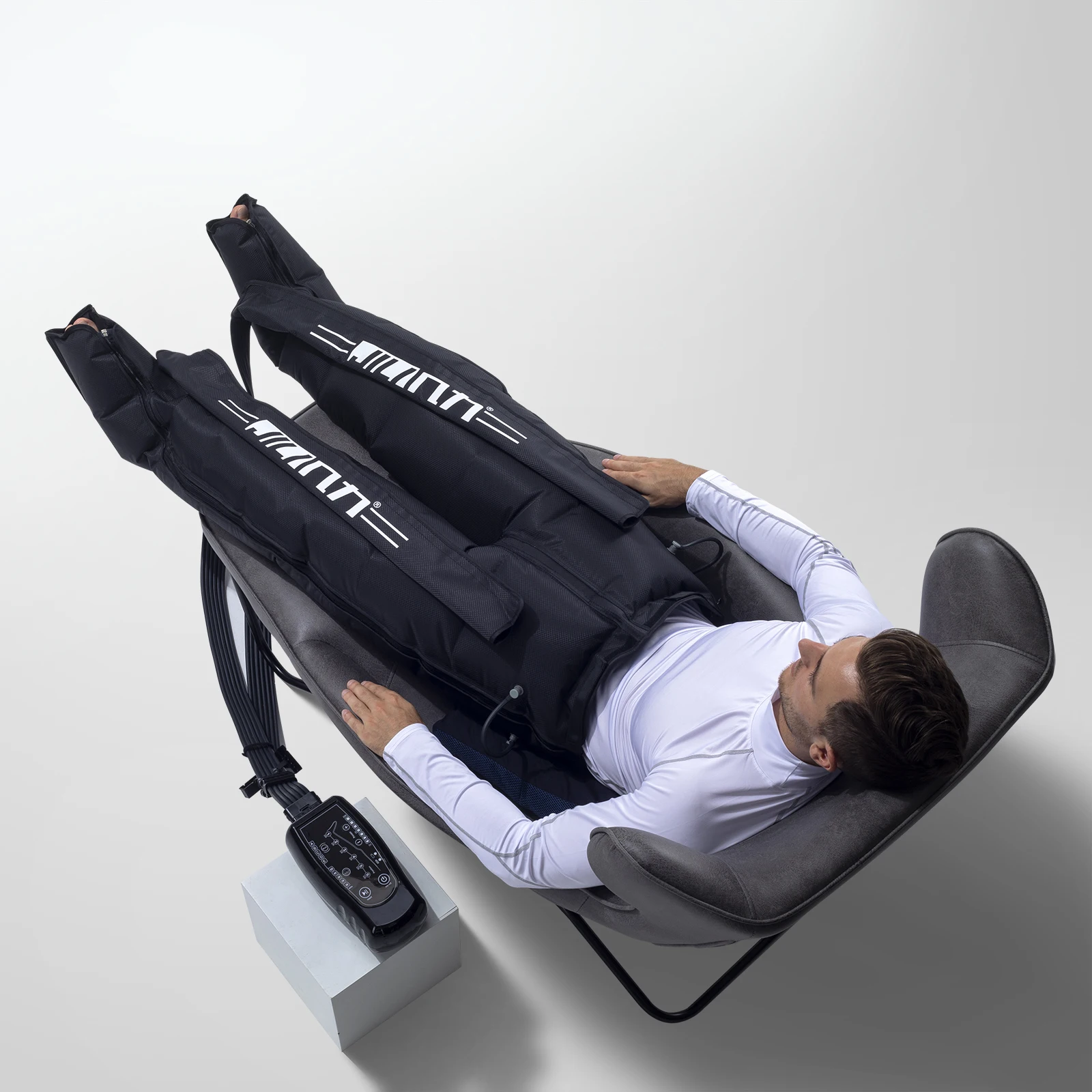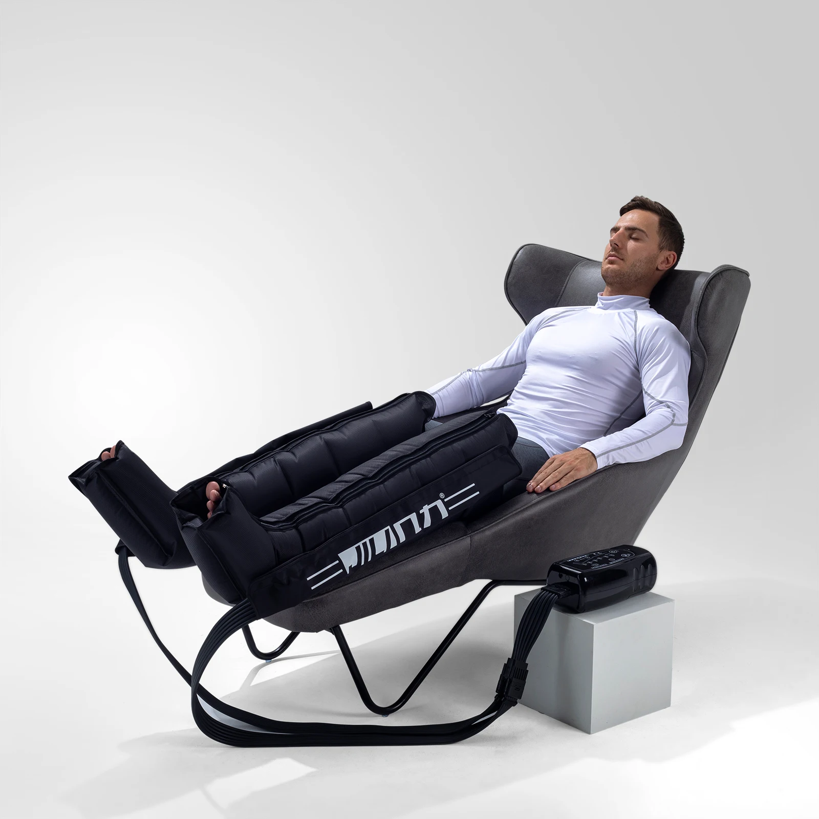Pneumatic compression is a form of pressure massage in which a garment completely covering the limb (legs or arms) inflates and deflates in a cyclical pattern over a period of time. The process flushes fluids containing metabolic waste and ushers in fresh, nutrient-rich blood to the limbs, improving circulation and blood flow. This increased circulation will reduce muscle pain and soreness, decrease swelling, and offer greater pain relief and recovery.