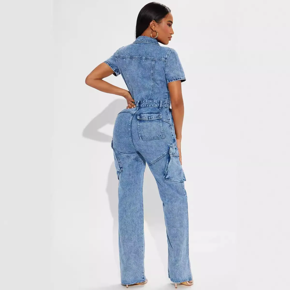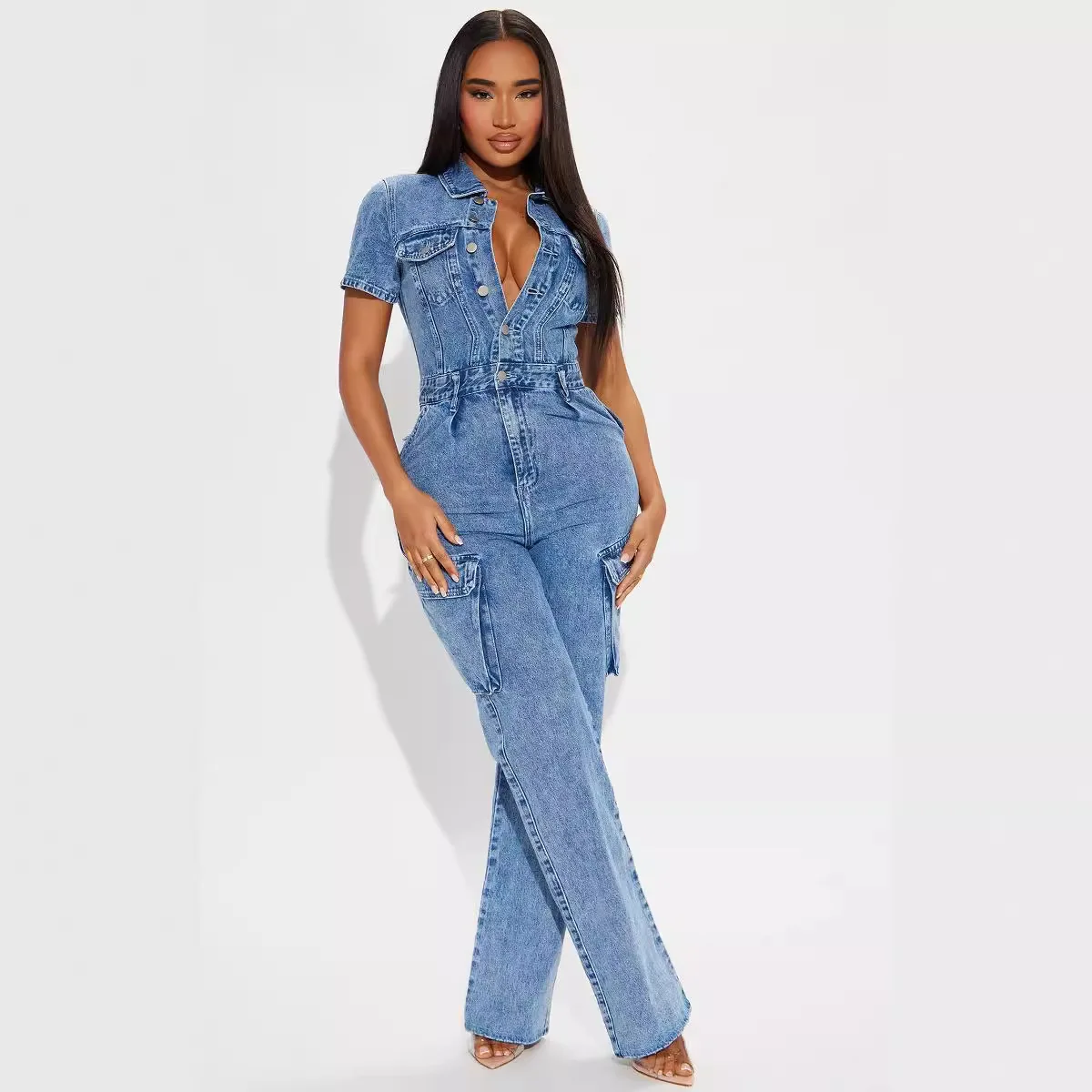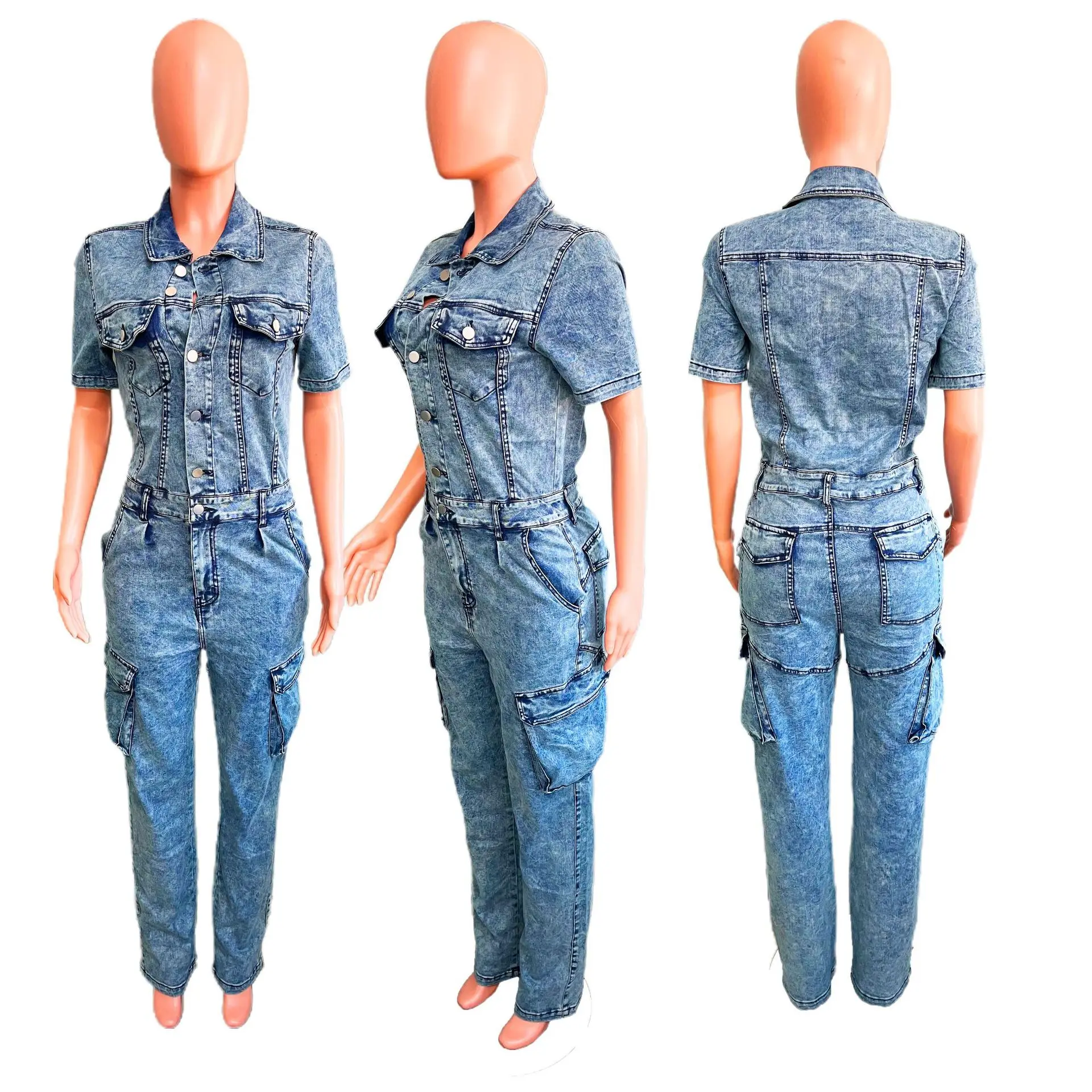 Jumpsuits Women Demin Overalls Short Sleeve One Piece Long Pants Y2k Streetwear High Waist Single Breasted Rompers Mom Jeans
