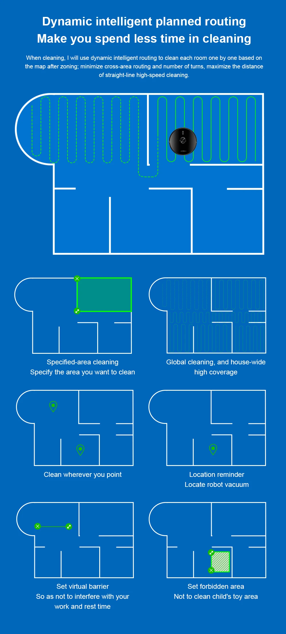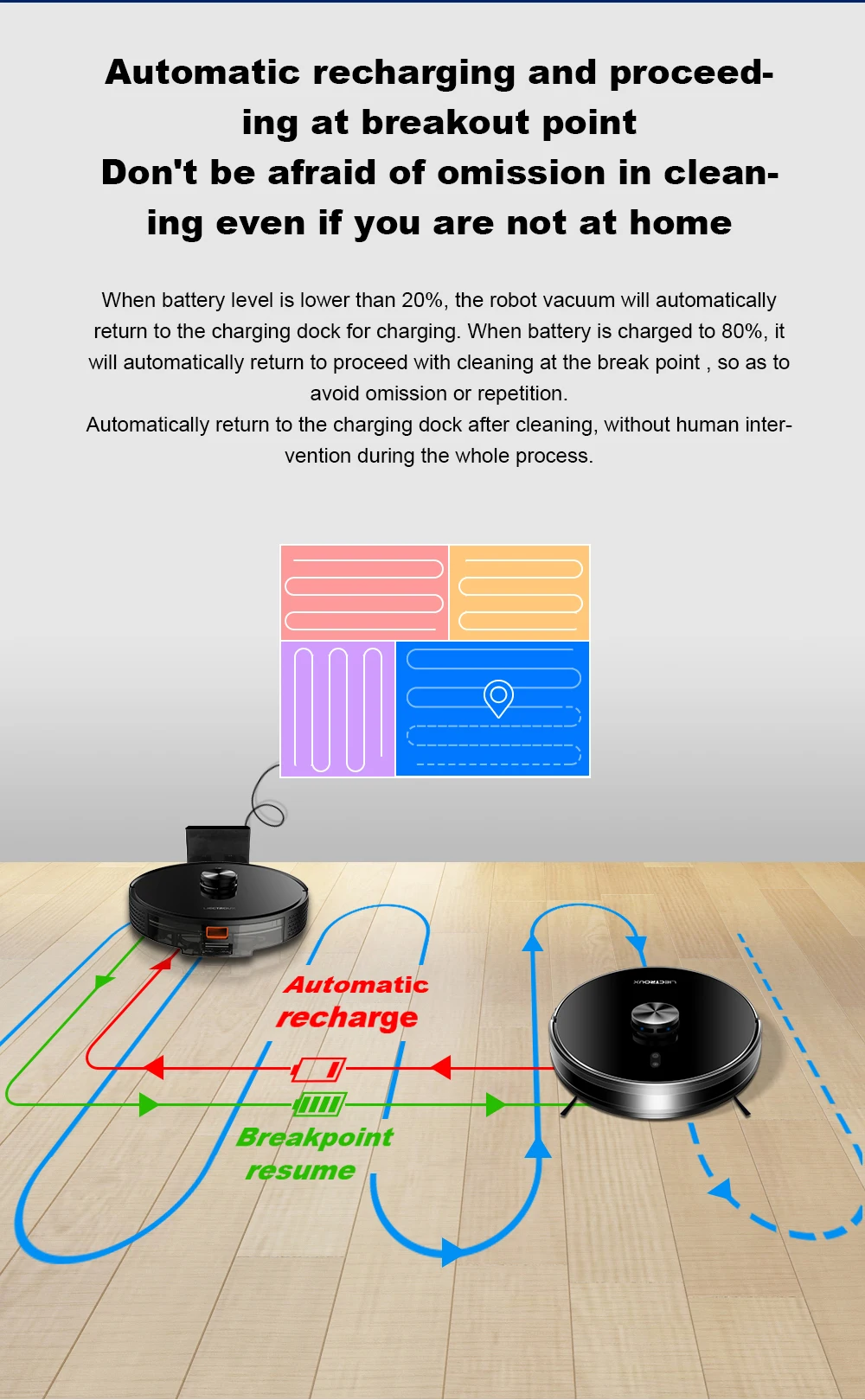 9. Breakpoint Resumable Cleaning. If the robot out of power, it will automatically recharge, fully charged and then go back to the interrupted place to continue cleaning. Rest assured, it will get the job done.