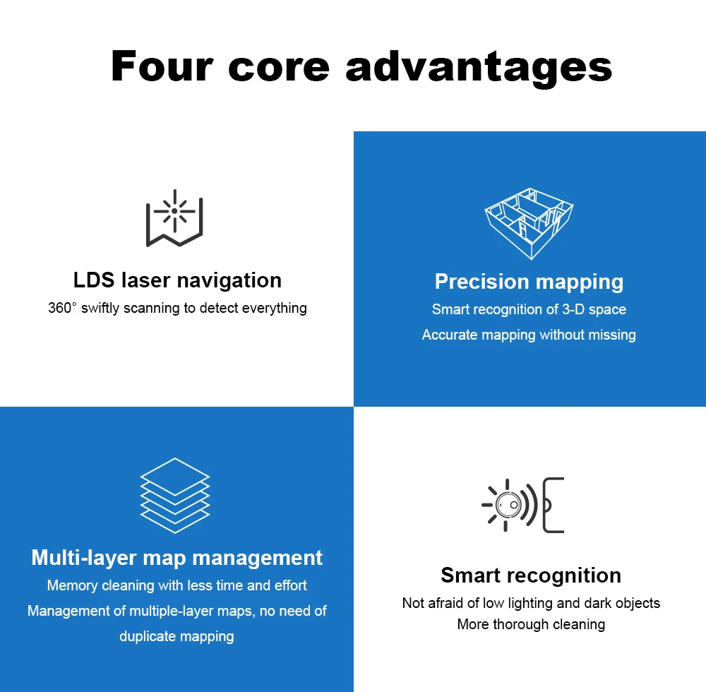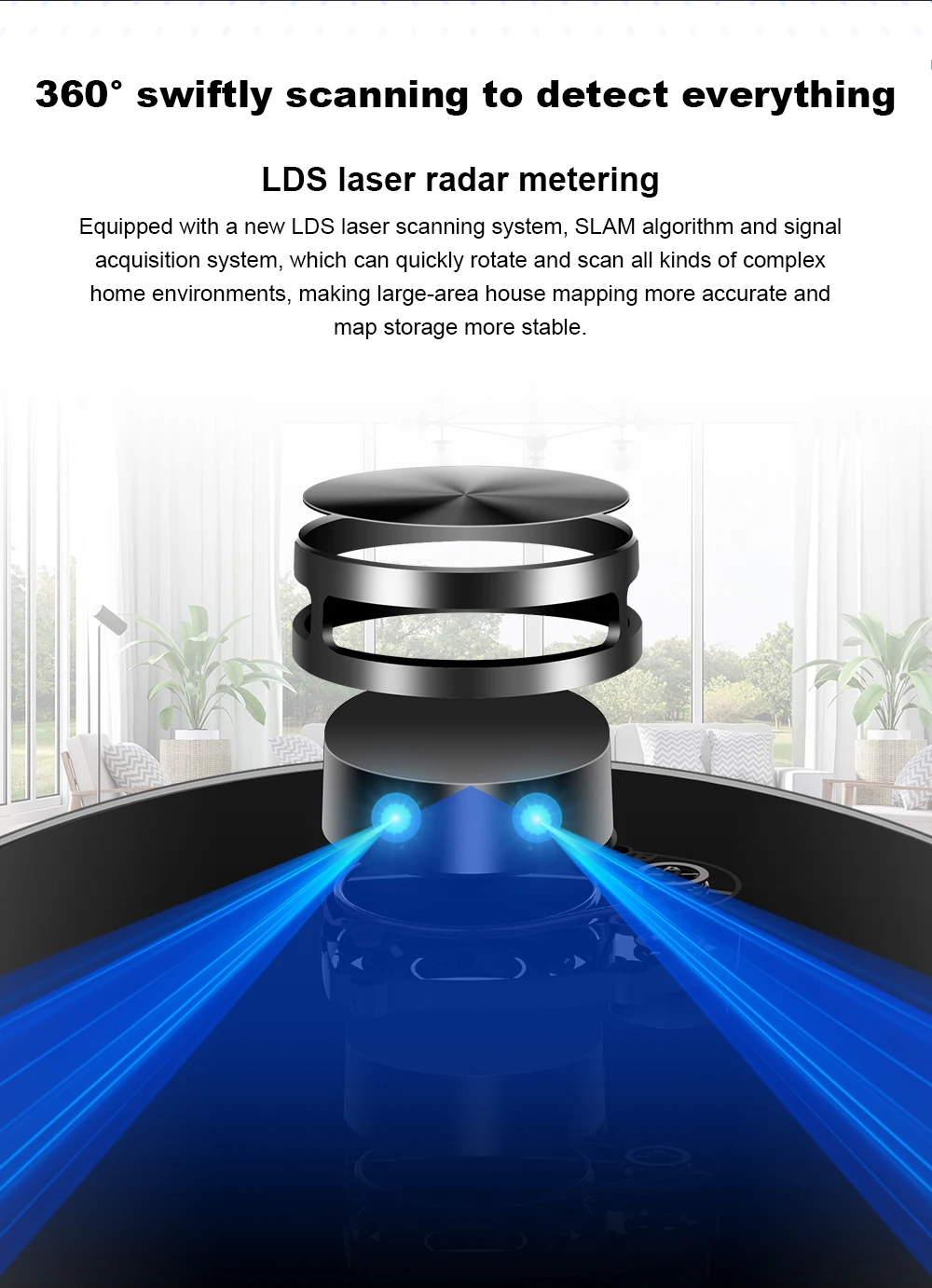 Equipped with a new LDS laser scanning system, the robot using SLAM algorithm and signal acquisition system, it can quickly rotate to scan the home environment, to make the mapping more precise and the image storage more stable.