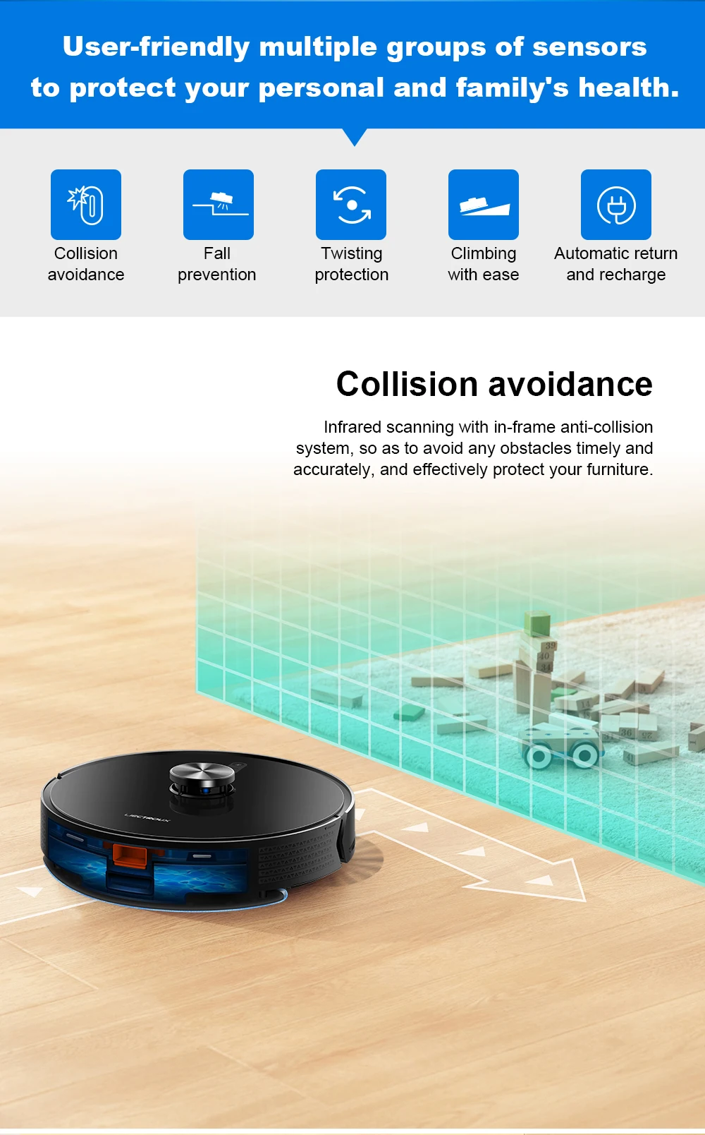 1. Lidar + Slam Dual Location – 5cm-8m Radar Range – Real-Time Object Detection Scans and Maps the room, plans, and methodically cleans according to Map.