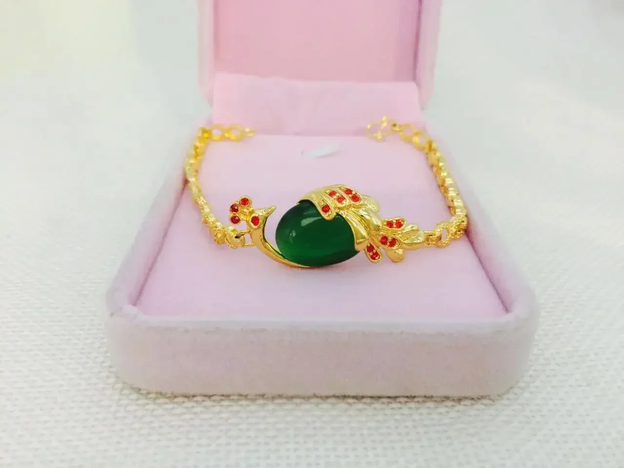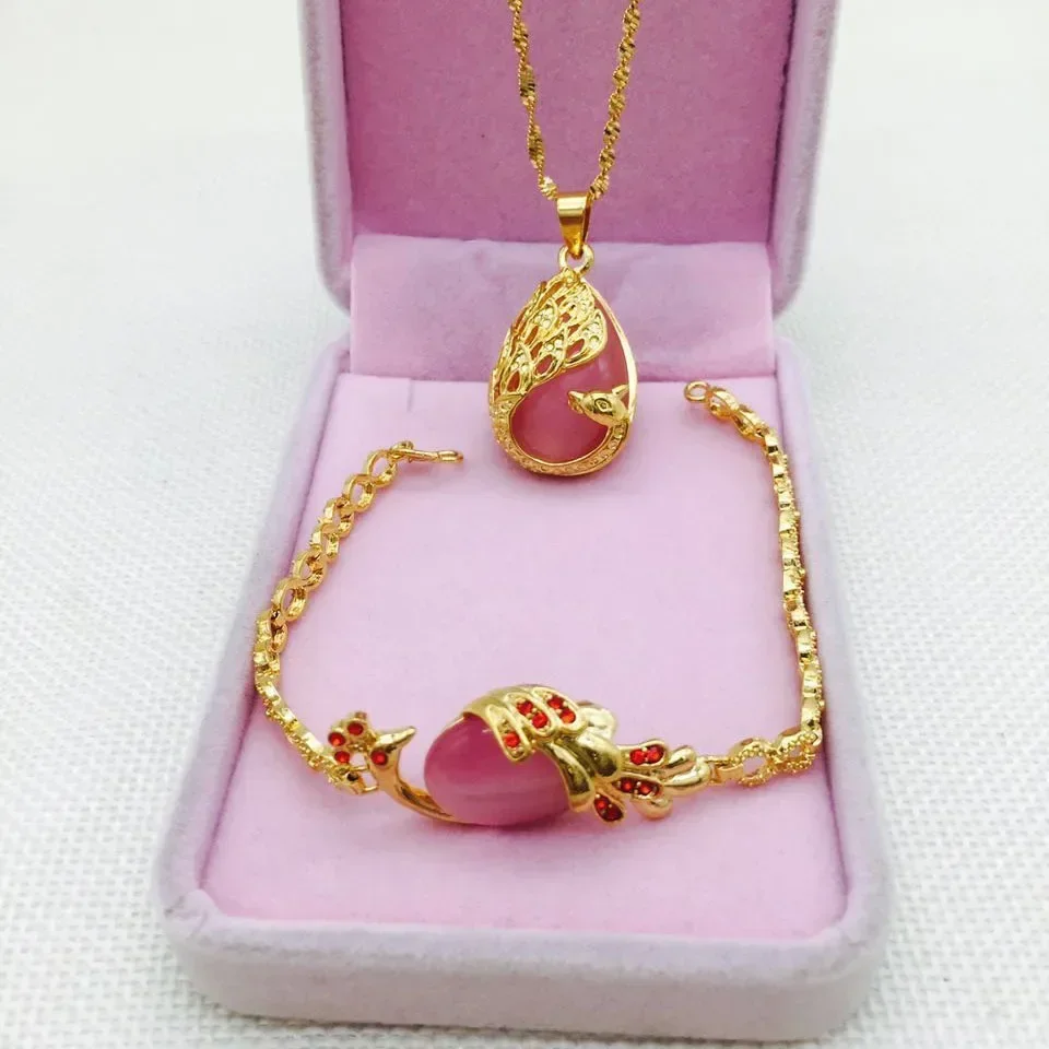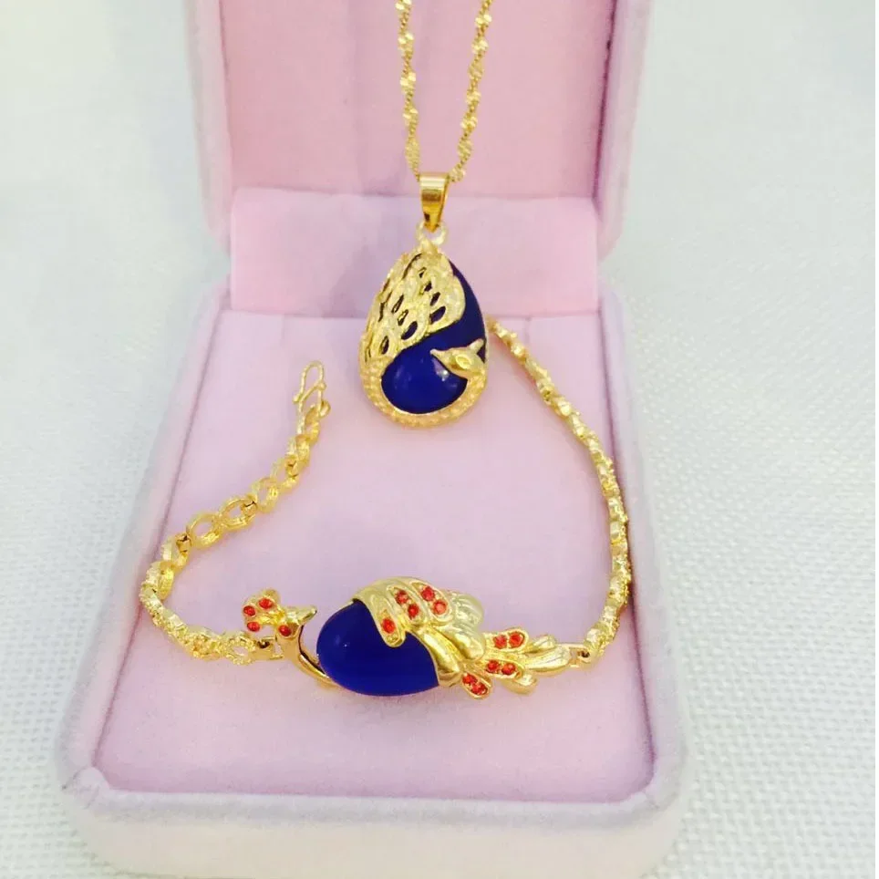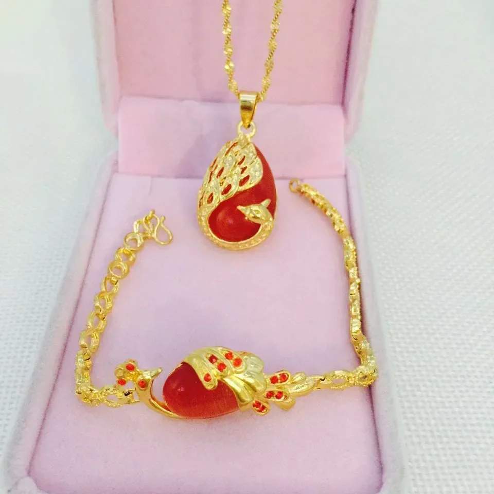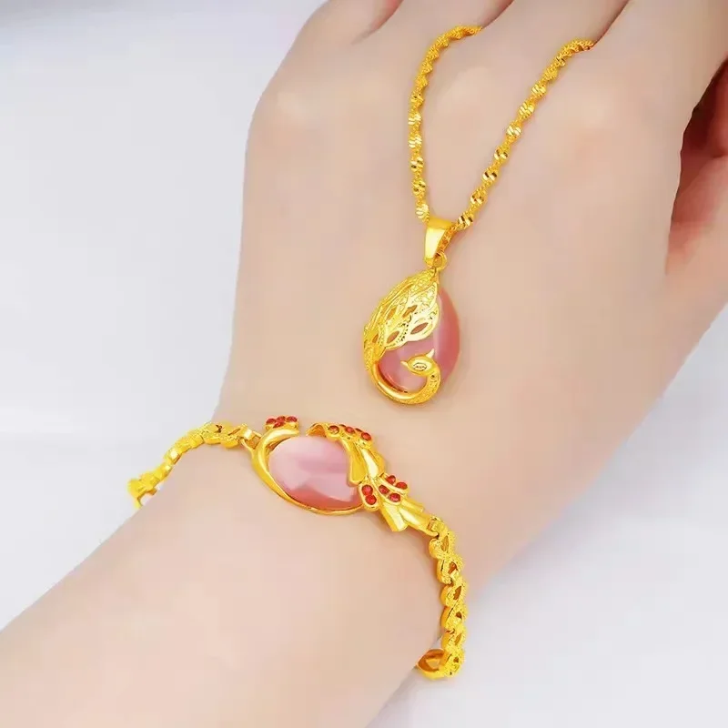 Luxury 24K yellow gold 9999 real gold Ladies Necklace Bracelet Peacock two-piece Pendant Cat’s Eye AU750 Gold jewellery