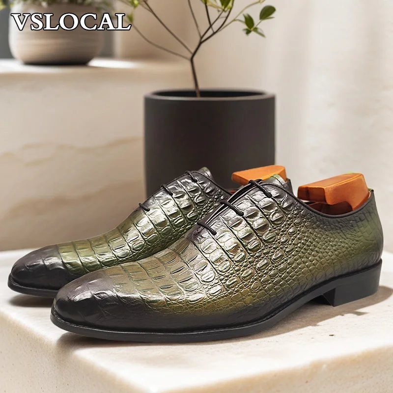 Luxury Men Oxford Shoes Green Black Croco Print Casual Mens Dress Shoes Lace up Wedding Office Genine Leather shoes men